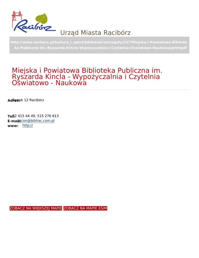 Urząd Miasta Racibórz http://www.raciborz.pl/kultura_i_sport/biblioteki/szczegoly/337/Miejska-i-Powiatowa-Bibliote ka-Publiczna-im.-Ryszarda-Kincla-Wypozyczalnia-i-Czytelnia-Oswiatowo-Naukowa/printpdf Miejska i Powiatowa Biblioteka Publiczna im. Ryszarda Kincla - Wypożyczalnia i Czytelnia Oświatowo - Naukowa Rynek 12 Racibórz Adres: 32 415 44 49, 515 276 613 Tel: [email protected] E-mail: www: http:// ZOBACZ NA WIĘKSZEJ MAPIE ZOBACZ NA MAPIE ESIM Poprzednia Następna