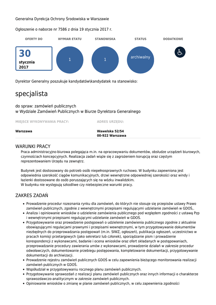 Generalna Dyrekcja Ochrony Środowiska w Warszawie Ogłoszenie o naborze nr 7586 z dnia 19 stycznia 2017 r. OFERTY DO 30 stycznia 2017 WYMIAR ETATU STANOWISKA 1 1 STATUS DODATKOWE archiwalny Dyrektor Generalny poszukuje kandydatów\kandydatek na stanowisko: specjalista do spraw: zamówień publicznych w Wydziale Zamówień Publicznych w Biurze Dyrektora Generalnego MIEJSCE WYKONYWANIA PRACY: ADRES URZĘDU: Warszawa Wawelska 52/54 00-922 Warszawa WARUNKI PRACY Praca administracyjno-biurowa polegająca m.in. na opracowywaniu dokumentów, obsłudze urządzeń biurowych, czynnościach koncepcyjnych. Realizacja zadań wiąże się z zagrożeniem korupcją oraz częstym reprezentowaniem Urzędu na zewnątrz. Budynek jest dostosowany do potrzeb osób niepełnosprawnych ruchowo. W budynku zapewniona jest odpowiednia szerokość ciągów komunikacyjnych, drzwi wewnętrzne odpowiedniej szerokości oraz windy i łazienki dostosowane do osób poruszających się na wózku inwalidzkim. W budynku nie występują szkodliwe czy niebezpieczne warunki pracy. ZAKRES ZADAŃ Prowadzenie procedur rozeznania rynku dla zamówień, do których nie stosuje się przepisów ustawy Prawo zamówień publicznych, zgodnie z wewnętrznymi przepisami regulującymi udzielanie zamówień w GDOŚ,. Analiza i opiniowanie wniosków o udzielenie zamówienia publicznego pod względem zgodności z ustawą Pzp i wewnętrznymi przepisami regulującymi udzielanie zamówień w GDOŚ. Przygotowywanie oraz prowadzenie postępowań o udzielenie zamówienia publicznego zgodnie z aktualnie obowiązującymi regulacjami prawnymi i przepisami wewnętrznymi, w tym przygotowywanie dokumentów niezbędnych do przeprowadzania postępowań (m.in. SIWZ, ogłoszeń), publikacja ogłoszeń, uczestnictwo w pracach komisji przetargowych (jako sekretarz lub członek), sporządzanie pism i prowadzenie korespondencji z wykonawcami, badanie i ocena wniosków oraz ofert składanych w postępowaniach, przeprowadzanie procedury zawierania umów z wykonawcami, prowadzenie działań w zakresie procedur odwoławczych, dokumentowanie przebiegu postępowania, kompletowanie dokumentacji, przygotowywanie dokumentacji do archiwizacji. Prowadzenie rejestru zamówień publicznych GDOŚ w celu zapewnienia bieżącego monitorowania realizacji zamówień publicznych w GDOŚ. Współudział w przygotowywaniu rocznego planu zamówień publicznych. Przygotowywanie sprawozdań z realizacji planu zamówień publicznych oraz innych informacji o charakterze sprawozdawczo-analitycznym w zakresie zamówień publicznych. Opiniowanie wniosków o zmianę w planie zamówień publicznych, w celu zapewnienia zgodności proponowanych zmian z ustawą Pzp i wewnętrznymi przepisami regulującymi udzielanie zamówień publicznych w GDOŚ. Opiniowanie projektów aneksów do umów w sprawie zamówienia publicznego pod kątem zgodności z ustawą PZP, w celu zapewnienia prawidłowej realizacji zadań. WYMAGANIA NIEZBĘDNE Wykształcenie: wyższe doświadczenie zawodowe: 1 rok w obszarze zamówień publicznych dobra znajomość przepisów ustawy Prawo zamówień publicznych i aktów wykonawczych znajomość ustawy o odpowiedzialności za naruszenie dyscypliny finansów publicznych w zakresie zamówień publicznych znajomość ustawy o finansach publicznych w zakresie zasad ponoszenia wydatków publicznych znajomość kodeksu cywilnego w zakresie zobowiązań umiejętność interpretacji i stosowania przepisów PZP umiejętność pracy w zespole umiejętność analitycznego myślenia dobra organizacja pracy umiejętność skutecznego komunikowania się w mowie i piśmie umiejętność obsługi komputera (edytor tekstu, arkusz kalkulacyjny, poczta elektroniczna) i urządzeń biurowych (drukowanie, skanowanie, faksowanie). Posiadanie obywatelstwa polskiego Korzystanie z pełni praw publicznych Nieskazanie prawomocnym wyrokiem za umyślne przestępstwo lub umyślne przestępstwo skarbowe WYMAGANIA DODATKOWE Wykształcenie: wyższe z zakresu prawa, administracji lub ochrony środowiska przeszkolenie z zakresu przepisów Prawa zamówień publicznych wiedza z zakresu prowadzenia projektów współfinansowanych z UE lub innych źródeł zewnętrznych. DOKUMENTY I OŚWIADCZENIA NIEZBĘDNE Życiorys/CV i list motywacyjny Kopie dokumentów potwierdzających spełnienie wymagania niezbędnego w zakresie wykształcenia Kopie dokumentów potwierdzających spełnienie wymagania niezbędnego w zakresie doświadczenia zawodowego / stażu pracy (świadectwa pracy, zaśw. o zatrudnieniu/ odbyciu stażu lub praktyk, referencje, w przypadku umów cywilnoprawnych zaśw. o wykonywaniu/wykonaniu umowy) Oświadczenie o posiadaniu obywatelstwa polskiego albo kopia dokumentu potwierdzającego posiadanie polskiego obywatelstwa Oświadczenie o wyrażeniu zgody na przetwarzanie danych osobowych do celów naboru Oświadczenie o korzystaniu z pełni praw publicznych Oświadczenie o nieskazaniu prawomocnym wyrokiem za umyślne przestępstwo lub umyślne przestępstwo skarbowe DOKUMENTY I OŚWIADCZENIA DODATKOWE kopia dokumentu potwierdzającego niepełnosprawność - w przypadku kandydatek/kandydatów, zamierzających skorzystać z pierwszeństwa w zatrudnieniu w przypadku, gdy znajdą się w gronie najlepszych kandydatek/kandydatów Kopie dokumentów potwierdzających spełnienie wymagania dodatkowego w zakresie wykształcenia kopie dokumentów potwierdzających posiadanie przeszkolenia z zakresu przepisów Prawa zamówień publicznych (certyfikaty ukończonych kursów, szkoleń etc.) TERMINY I MIEJSCE SKŁADANIA DOKUMENTÓW Dokumenty należy złożyć do: 30 stycznia 2017 r. Decyduje data: stempla pocztowego / osobistego dostarczenia oferty do urzędu Miejsce składania dokumentów: Generalna Dyrekcja Ochrony Środowiska ul. Wawelska 52/54 00-922 Warszawa z dopiskiem na kopercie: specjalista GDOŚ/BDG/1/2017 INNE INFORMACJE: W miesiącu poprzedzającym datę upublicznienia ogłoszenia wskaźnik zatrudnienia osób niepełno