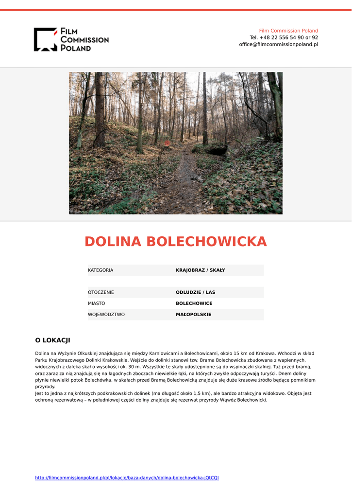 Film Commission Poland Tel. +48 22 556 54 90 or 92 office@filmcommissionpoland.pl DOLINA BOLECHOWICKA KATEGORIA KRAJOBRAZ / SKAŁY OTOCZENIE ODLUDZIE / LAS MIASTO BOLECHOWICE WOJEWÓDZTWO MAŁOPOLSKIE O LOKACJI Dolina na Wyżynie Olkuskiej znajdująca się między Karniowicami a Bolechowicami, około 15 km od Krakowa. Wchodzi w skład Parku Krajobrazowego Dolinki Krakowskie. Wejście do dolinki stanowi tzw. Brama Bolechowicka zbudowana z wapiennych, widocznych z daleka skał o wysokości ok. 30 m. Wszystkie te skały udostępnione są do wspinaczki skalnej. Tuż przed bramą, oraz zaraz za nią znajdują się na łagodnych zboczach niewielkie łąki, na których zwykle odpoczywają turyści. Dnem doliny płynie niewielki potok Bolechówka, w skałach przed Bramą Bolechowicką znajduje się duże krasowe źródło będące pomnikiem przyrody. Jest to jedna z najkrótszych podkrakowskich dolinek (ma długość około 1,5 km), ale bardzo atrakcyjna widokowo. Objęta jest ochroną rezerwatową – w południowej części doliny znajduje się rezerwat przyrody Wąwóz Bolechowicki. http://filmcommissionpoland.pl/pl/lokacje/baza-danych/dolina-bolechowicka-jQtCQI