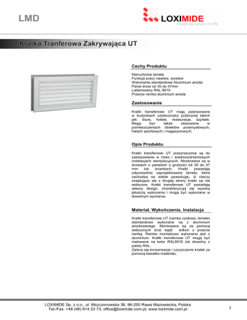 LMD Cechy Produktu Nieruchome lamele Funkcja pracy nawiew, wywiew Wykonanie standardowe Aluminium anoda Panel drzwi od 30 do 47mm Lakierowany RAL 9010 Przeciw ramka aluminium anoda Zastosowanie Kratki transferowe UT mają zastosowane w budynkach użyteczności publicznej takich jak: biura, hotele, restauracje, szpitale. Mogą być także stosowane w pomieszczeniach obiektów przemysłowych, halach sportowych i magazynowych. Opis Produktu Kratki transferowe UT przeznaczone są do zastosowania w nisko i średniociśnieniowych instalacjach wentylacyjnych. Montowane są w drzwiach o panelach o grubości od 30 do 47 mm lub ściankach. Kratki posiadają odpowiednio zaprojektowane lamele, które zachodzą na siebie powodując, iż rzeczy znajdujące się z drugiej strony kratki są nie widoczne. Kratki transferowe UT posiadają własny design, charakteryzują się wysoką jakością wykonania i mogą być wykonane w dowolnym wymiarze. Materiał, Wykończenie, Instalacja Kratki transferowe UT (ramka czołowa, lamele) standardowo wykonane są z aluminium anodowanego. Montowane są za pomocą widocznych śrub bądź silikon z przeciw ramką. Ramka montażowa wykonana jest z aluminium. Kratki transferowe UT mogą być malowane na kolor RAL9010 lub dowolny z palety RAL. Zaleca się konserwacje i czyszczenie kratek za pomocą kawałka materiału. LOXIMIDE Sp. z o.o., ul. Mszczonowska 36, 96-200 Rawa Mazowiecka, Polska Tel./Fax: +48 (46) 814 23 73, [email protected], www.loximide.com.pl 1 LMD Wymiary Kratek UT2 UT1 Powierzchnia Efektywna 2 Ak [m ] H [mm] L [mm] 200 250 300 350 400 500 600 800 1000 100 0,010 0,013 0,016 0,019 0,022 0,028 0,034 0,047 0,059 150 0,016 0,020 0,025 0,030 0,034 0,044 0,053 0,071 0,090 200 0,022 0,028 0,034 0,040 0,047 0.059 0,071 0,096 0,120 300 0,034 0,044 0,053 0,062 0,071 0,090 0,108 0,145 0,182 400 0,047 0,059 0,071 0,083 0,096 0,120 0,145 0,194 0,243 500 0,059 0,074 0,090 0,105 0,120 0,151 0,182 0,243 0,305 600 0,071 0,090 0,108 0,127 0,145 0,182 0,219 0,293 0,366 LOXIMIDE Sp. z o.o., ul. Mszczonowska 36, 96-200 Rawa Mazowiecka, Polska Tel./Fax: +48 (46) 814 23 73, [email protected], www.loximide.com.pl 2 LMD Szybki Dobór Q [m3/h] Q [m3/h] LOXIMIDE Sp. z o.o., ul. Mszczonowska 36, 96-200 Rawa Mazowiecka, Polska Tel./Fax: +48 (46) 814 23 73, [email protected], www.loximide.com.pl 3 LMD Szybki Dobór Model Ak [m2] Q [m3/h] ∆P [Pa] LOXIMIDE Sp. z o.o., ul. Mszczonowska 36, 96-200 Rawa Mazowiecka, Polska Tel./Fax: +48 (46) 814 23 73, [email protected], www.loximide.com.pl Lw [dBa] 4 LMD Wykres Doboru LOXIMIDE Sp. z o.o., ul. Mszczonowska 36, 96-200 Rawa Mazowiecka, Polska Tel./Fax: +48 (46) 814 23 73, [email protected], www.loximide.com.pl 5 LMD KOD ZAMÓWIENIA Kratka Transferowa UT a – bbb x bbb – ccc – d a – typ 1 – pojedyńcza 2 – z ramką kontrującą wymiar (200x100, ………….) wykończenie A – aluminium anoda R – kolor montaż B – bez otworów montażowych, silikon W – z otworami montażowymi, na wkręty PRZYKŁAD ZAMÓWIENIA UT1 – 200x200 – RAL9010 - B LOXIMIDE Sp. z o.o. zastrzega sobie prawo zmiany parametrów bez uprzedniego powiadomienia. LOXIMIDE Sp. z o.o., ul. Mszczonowska 36, 96-200 Rawa Mazowiecka, Polska Tel./Fax: +48 (46) 814 23 73, [email protected], www.loximide.com.pl 6