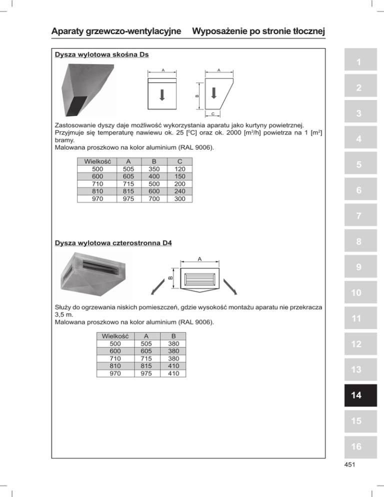 Aparaty grzewczo-wentylacyjne Wyposa¿enie po stronie t³ocznej Dysza wylotowa skona Ds 1 2 3 Zastosowanie dyszy daje mo¿liwoæ wykorzystania aparatu jako kurtyny powietrznej. Przyjmuje siê temperaturê nawiewu ok. 25 [0C] oraz ok. 2000 [m3/h] powietrza na 1 [m2] bramy. Malowana proszkowo na kolor aluminium (RAL 9006). Wielkoæ 500 600 710 810 970 A 505 605 715 815 975 B 350 400 500 600 700 4 C 120 150 200 240 300 5 6 7 8 Dysza wylotowa czterostronna D4 9 10 S³u¿y do ogrzewania niskich pomieszczeñ, gdzie wysokoæ monta¿u aparatu nie przekracza 3,5 m. Malowana proszkowo na kolor aluminium (RAL 9006). Wielkoæ 500 600 710 810 970 A 505 605 715 815 975 B 380 380 380 410 410 11 12 13 14 15 16 451