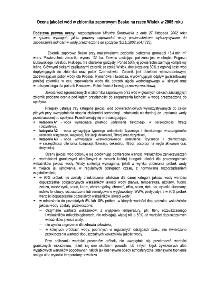 Ocena jakości wód w zbiorniku zaporowym Besko na rzece Wisłok w 2005 roku Podstawa prawna oceny: rozporządzenie Ministra Środowiska z dnia 27 listopada 2002 roku w sprawie wymagań, jakim powinny odpowiadać wody powierzchniowe wykorzystywane do zaopatrzenia ludności w wodę przeznaczoną do spożycia (Dz.U.2002.204.1728). Zbiornik zaporowy Besko przy maksymalnym poziomie piętrzenia gromadzi 15,4 mln m3 wody. Powierzchnia zbiornika wynosi 131 ha. Zlewnia zasilająca położona jest w obrębie Pogórza Bukowskiego i Beskidu Niskiego, ma charakter górzysty. Ponad 50% jej powierzchni zajmują kompleksy leśne. Głównymi ciekami zasilającymi zbiornik są rzeka Wisłok, dostarczająca 80% z ogólnej ilości wód dopływających do zbiornika oraz potok Czernisławka. Zbiornik jest obiektem wielozadaniowym, zapewniającym pobór wody dla Krosna, Rymanowa i Iwonicza, wyrównującym odpływ gwarantowany poniżej zbiornika w celu zapewnienia wody dla potrzeb ujęcia wodociągowego w Iskrzyni oraz w dalszym biegu dla potrzeb Rzeszowa. Pełni również funkcję przeciwpowodziową. Jakość wód zgromadzonych w zbiorniku zaporowym oraz wód w głównych ciekach zasilających zbiornik poddano ocenie pod kątem przydatności do zaopatrzenia ludności w wodę przeznaczoną do spożycia. Przepisy ustalają trzy kategorie jakości wód powierzchniowych wykorzystywanych do celów pitnych przy uwzględnieniu stopnia złożoności technologii uzdatniania niezbędnej do uzyskania wody przeznaczonej do spożycia. Przedstawiają się one następująco: kategoria A1 - woda wymagająca prostego uzdatniania fizycznego, w szczególności filtracji i dezynfekcji, kategoria A2 - woda wymagająca typowego uzdatniania fizycznego i chemicznego, w szczególności utleniania wstępnego, koagulacji, flokulacji, dekantacji, filtracji oraz dezynfekcji, kategoria A3 - woda wymagająca wysokosprawnego uzdatniania fizycznego i chemicznego, w szczególności utleniania, koagulacji, flokulacji, dekantacji, filtracji, adsorpcji na węglu aktywnym oraz dezynfekcji. Oceny jakości wód dokonuje się porównując pomierzone wartości wskaźników zanieczyszczeń z wartościami granicznymi określonymi w ramach każdej kategorii jakości dla poszczególnych wskaźników jakości wody. Wody spełniają wymagania, jeżeli w wyniku pobierania próbek wody w miejscu jej ujmowania, w regularnych odstępach czasu, z normowaną rozporządzeniem częstotliwością: w 95% próbek nie zostały przekroczone właściwe dla danej kategorii jakości wody wartości dopuszczalne obligatoryjnych wskaźników jakości wody (barwa, temperatura, azotany, fluorki, żelazo, miedź cynk, arsen, kadm, chrom ogólny, chrom+6, ołów, selen, rtęć, bar, cyjanki, siarczany, indeks fenolowy, rozpuszczone lub zemulgowane węglowodory, WWA, pestycydy), a w 90% próbek wartości dopuszczalne pozostałych wskaźników jakości wody; w odniesieniu do pozostałych 5% lub 10% próbek, w których wartości dopuszczalne wskaźników jakości wody zostały przekroczone: − otrzymane wartości wskaźników, z wyjątkiem temperatury, pH, tlenu rozpuszczonego i wskaźników mikrobiologicznych, nie odbiegają więcej niż o 50% od wartości dopuszczalnych wskaźników jakości wody, − nie wynika zagrożenie dla zdrowia człowieka, − w kolejnych próbkach wody, pobranych w regularnych odstępach czasu, nie stwierdzono przekroczenia wartości dopuszczalnych wskaźników jakości wody. Przy obliczaniu wartości procentów próbek, nie uwzględnia się przekroczeń wartości granicznych wskaźników, jeżeli są one skutkiem powodzi lub innych klęsk żywiołowych albo wyjątkowych warunków pogodowych, takich jak intensywne opady atmosferyczne, intensywne topnienie śniegu albo wysokie temperatury powietrza. Wyniki oceny jakości wód zbiornika Besko oraz wód zasilających zbiornik, badanych w 2005 roku, zestawiono w tabeli. Zakres danych tabelarycznych obejmuje również wartości minimalne, maksymalne oraz średnie wskaźników jakości wód, które zadecydowały o wyniku oceny. Ocena jakości wód w zbiorniku zaporowym Besko pod kątem wykorzystania ich do zaopatrzenia ludności w wodę przeznaczoną do spożycia wg badań wykonanych w 2005 roku (wg rozporządzenia MŚ z dnia 27.11.2002r. – Dz.U.2002.204.1728) Kategoria jakości wody Punkt pomiarowo-kontrolny Wskaźniki decydujące o ocenie wartość nazwa wskaźnika min max średnia ZBIORNIK BESKO warstwa powierzchniowa A2 warstwa naddenna A2 Przy zaporze barwa odczyn OWO liczba bakterii gr.coli kał. liczba bakterii gr.coli OWO liczba bakterii gr.coli kał. liczba bakterii gr.coli liczba paciorkowców kał. mgPt/l pH mgC/l w 100 ml w 100 ml mgC/l w 100 ml w 100 ml w 100 ml 12 8,0 5,9 93 230 6,7 43 210 25 24 8,8 5.9 150 280 6,7 110 230 25 18 8,4 5,9 120 255 6,7 77 220 25 odczyn liczba bakterii gr.coli kał. liczba bakterii gr.coli liczba paciorkowców kał. liczba bakterii gr.coli kał. liczba bakterii gr.coli liczba paciorkowców kał. pH w 100 ml w 100 ml w 100 ml w 100 ml w 100 ml w 100 ml 7,9 110 200 26 200 390 150 8,6 280 930 26 200 390 150 8,3 192 343 26 200 390 150 CIEKI ZASILAJĄCE ZBIORNIK Wisłok - powyżej zbiornika km 178,6 A2 Czernisławka – ujście do zbiornika km 2,2 A2 Objaśnienia skrótów użytych w tabeli: OWO liczba bakterii gr.coli kał. liczba bakterii gr.coli liczba paciorkowców kał. - ogólny węgiel organiczny liczba bakterii grupy coli typu kałowego liczba bakterii grupy coli liczba paciorkowców kałowych