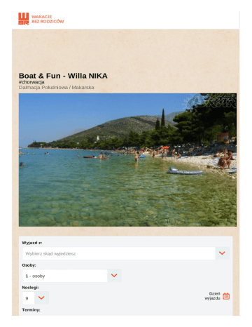 Boat & Fun - Willa NIKA #chorwacja Dalmacja Południowa / Makarska Wyjazd z: Wybierz skąd wyjedziesz Osoby: 1 - osoby Noclegi: 9 Terminy: Dzień wyjazdu 11 dni 25.06.2017 - 06.07.2017 Pokój: pokoj wieloosobowy Wyżywienie: Pełne wyżywienie Warunki płatności: Cena za 1 osobę: Razem: cena katalogowa 1797 zł 3594 zł Opis oferty Miejscowość Wiek 13 - 18 lat Opinie Riwiera Makarska Rozkład jazdy Poznaj kurort dla prawdziwych kolekcjonerów wrażeń! Chorwacja to kryształowo czysty Adriatyk, liczne dyskoteki i nocne kluby oraz przysmaki śródziemnomorskiej kuchni. Każdego dnia korzystaj z cudownego słońca i najlepszych, wakacyjnych atrakcji. Wiesz, że tu kręcono serial „Gra o Tron”? Nas to nie dziwi, w końcu wakacje w Chorwacji to uczta pełna prawdziwie królewskich doznań. Musisz to poczuć, musisz to zobaczyć! #oskarobozy Nadajesz na imprezowych falach? Dołącz do naszej załogi i weź udział w organizowanej przez Oskara ATRAKCJI czyli BOAT PARTY z prawdziwego zdarzenia! Baw się na statku niczym jego kapitan i przeżyj imprezę na morzu w iście epickim stylu! Całodniowa zabawa połączona jest z plażowaniem na wyspie Hvar i Brac. To szansa na zaliczenie plażingu w „Złotym Rogu” , czyli topowej plaży w Chorwacji! Nie czekaj, podnieś kotwicę i popłyń z nami w klimacie dobrego jedzenia (ryby, napoje) i klubowych rytmów! Zgrana ekipa to podstawa dobrej zabawy! Poznaj swoją obozową ekipę jeszcze przed wyjazdem, dzięki specjalnie dla Was utworzonej grupie na FB! https - //www.facebook.com/groups/1865794966991541/ Położenie Witaj w Willi NIKA! Jeśli będziesz mieć wrażenie, że czas stanął w miejscu uspokajamy, tu jest tak od zawsze! Klimatyczny, mieniący się w słońcu obiekt położony jest zaledwie 3 minuty spacerem od pięknej plaży, a także kilkanaście minut przemierzonych w ten sam sposób od centrum MAKARSKIEJ, gdzie mieści się wiele restauracji, kawiarni i atrakcji, które czekają na przybicie królewskiej ekipy naszych obozowiczów! Zakwaterowanie Pokoje 2, 3 i 4 osobowe z łazienkami, wyposażone w lodówki i TV. Bezpłatny internet Wifi. Obiekt ma pokoje z widokiem na góry lub morze. Wyżywienie Wyżywienie Full Board - 3 posiłki dziennie, śniadanie w formie bufetu, lunch i obiadokolacja serwowane, 9 śniadań, 10 lunchy, 9 obiadokolacji. Napoje serwowane do posiłków Co za ile, czyli hajs musi się zgadzać - ) Sugerowane kieszonkowe - zabierz ze sobą ok. 80 € na drobne wydatki! buty do chodzenia w wodzie ok. 40 kun herbata mrożona 8 kun - 0,5 l wstęp na teren dyskoteki ok. 70 kun Info dodatkowe Legitymacja nie wystarczy- obowiązkowo musisz zabrać ze sobą ważny dowód osobisty lub paszport. Pamiętaj, żeby zabrać Kartę Uczestnika Obozu, podpisany Regulamin oraz kartę EKUZ ( www.ekuz.nfz.gov.pl) Dokumenty do pobrania Karta kwalifikacyjna www.oskar.com.pl/zalaczniki/karta_kwalifikacyjna Regulamin obozu www.oskar.com.pl/zalaczniki/regulamin_obozu Karta Dużej Rodziny www.oskar.com.pl/zalaczniki/karta_duzej_rodziny Turystyczny Fundusz Gwarancyjny W związku z powołaniem do życia w dniu 26.11.2016 Turystycznego Funduszu Gwarancyjnego każdy klient Biura Podróży Oskar zobowiązany jest do zapłaty kwoty w wysokości 10zł/os. przy każdorazowej rezerwacji imprezy turystycznej (obowiązuje od dnia 26.11.2016). Kwota przeznaczona na Turystyczny Fundusz Gwarancyjny zostanie automatycznie doliczona do wartości rezerwacji (w momencie jej dokonania). Wyjątkiem są imprezy turystyczne odbywające się w krajach posiadających granicę z Rzeczpospolitą Polską. Składka nie jest przychodem biura. Ubezpieczenie Warunki ubezpieczenia Bezpieczne Podróże Signal Iduna dokument do pobrania www.oskar.com.pl/zalaczniki/owu Warunki ubezpieczenia Kosztów Imprezy Turystycznej Signal Iduna dokument do pobrania www.oskar.com.pl/zalaczniki/owurg Warunki promocji FIRST MINUTE www.oskar.com.pl/dokumenty/warunki_promocji_oboz Udogodnienia Ułatwienia dla niepełnosprawnych Windsurfing Nordic walking Jazda konna Nurkowanie Sporty wodne Program ramowy Dzień 1 Wyjazd z Polski zgodnie z rozkładem jazdy autokarów. Przejazd przez Czechy, Słowację, Węgry. Dzień 2 Przyjazd do Makarskiej ok. godz. 10 - 00. Czas wolny. Zakwaterowanie. Dzień 3 - 10 Wypoczynek i rekreacja. Możliwość korzystania z wycieczek fakultatywnych. Dzień 11 Wykwaterowanie w godzinach porannych. Czas na złapanie ostatnich wspomnień i pożegnanie się z chorwackimi plażami. Wyjazd do Polski w godzinach popołudniowych. Przejazd przez Węgry, Słowację, Czechy. Dzień 12 Przyjazd do Polski. Orientacyjne godziny powrotu do poszczególnych miast zgodne z rozkładem powrotnym. Cena zawiera ATRAKCJĘ! - BOAT PARTY transport nowoczesnym i komfortowym autokarem klasy LUX (klimatyzacja, WC, DVD, minibar) zakwaterowanie - 9 noclegów w pokojach wieloosobowych wyżywienie Full Board - 9 śniadań, 10 lunchy, 9 obiadokolacji opiekę pilota i wychowawców na trasie przejazdu opiekę kadry i rezydenta na miejscu ubezpieczenie [KL 10000 euro, NNW 10000 zł, BP 500 zł (utrata)] bogaty program rekreacyjno - rozrywkowy Dopłaty wymagane na miejscu atrakcje programowe i opłata klimatyczna - 30 €/os - płatne u pilota w autokarze kaucja zwrotna - 10 €/os - płatne u pilota w autokarze, zwracane przez kierownika obozu po wykwaterowaniu pod warunkiem braku szkód Dopłaty opcjonalne wycieczki fakultatywne i bilety wstępu do zwiedzanych obiektów RAFTING - 35€/os. - spływ pontonami górską rzeką - tylko dla lubiących Extremalne Doznania! obiad na trasie przejazdu (ok. 5 €/posiłek) podczas dłuższego postoju do i w drodze powrotnej ubezpieczenie od chorób przewlekłych i nowotworowych KL 20000 euro, NNW 10000 zł, bagaż (500 zł utrata) - 160 zł/os Potrzebujesz pomocy? Zadzwoń lub napisz: 61 852 45 72 [email protected] © 2015 WakacjeBezRodzicow.pl pl.Wolności 2/4c, 61-738 Poznań Grafika i użyteczność: Simply User Wdrożenie: DeliciousIt