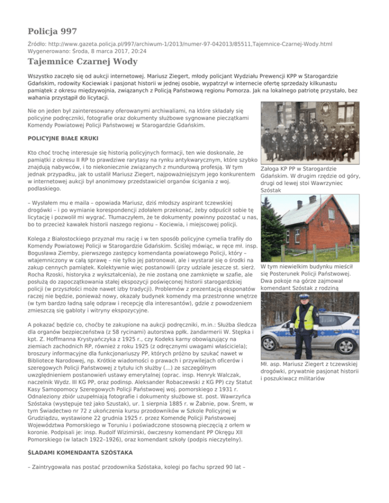 Policja 997 Źródło: http://www.gazeta.policja.pl/997/archiwum-1/2013/numer-97-042013/85511,Tajemnice-Czarnej-Wody.html Wygenerowano: Środa, 8 marca 2017, 20:24 Tajemnice Czarnej Wody Wszystko zaczęło się od aukcji internetowej. Mariusz Ziegert, młody policjant Wydziału Prewencji KPP w Starogardzie Gdańskim, rodowity Kociewiak i pasjonat historii w jednej osobie, wypatrzył w internecie ofertę sprzedaży kilkunastu pamiątek z okresu międzywojnia, związanych z Policją Państwową regionu Pomorza. Jak na lokalnego patriotę przystało, bez wahania przystąpił do licytacji. Nie on jeden był zainteresowany oferowanymi archiwaliami, na które składały się policyjne podręczniki, fotografie oraz dokumenty służbowe sygnowane pieczątkami Komendy Powiatowej Policji Państwowej w Starogardzie Gdańskim. POLICYJNE BIAŁE KRUKI Kto choć trochę interesuje się historią policyjnych formacji, ten wie doskonale, że pamiątki z okresu II RP to prawdziwe rarytasy na rynku antykwarycznym, które szybko znajdują nabywców, i to niekoniecznie związanych z mundurową profesją. W tym jednak przypadku, jak to ustalił Mariusz Ziegert, najpoważniejszym jego konkurentem w internetowej aukcji był anonimowy przedstawiciel organów ścigania z woj. podlaskiego. Załoga KP PP w Starogardzie Gdańskim. W drugim rzędzie od góry, drugi od lewej stoi Wawrzyniec Szóstak – Wysłałem mu e maila – opowiada Mariusz, dziś młodszy aspirant tczewskiej drogówki – i po wymianie korespondencji zdołałem przekonać, żeby odpuścił sobie tę licytację i pozwolił mi wygrać. Tłumaczyłem, że te dokumenty powinny pozostać u nas, bo to przecież kawałek historii naszego regionu – Kociewia, i miejscowej policji. Kolega z Białostockiego przyznał mu rację i w ten sposób policyjne cymelia trafiły do Komendy Powiatowej Policji w Starogardzie Gdańskim. Ściślej mówiąc, w ręce mł. insp. Bogusława Ziemby, pierwszego zastępcy komendanta powiatowego Policji, który – wtajemniczony w całą sprawę – nie tylko jej patronował, ale i wystarał się o środki na zakup cennych pamiątek. Kolektywnie więc postanowili (przy udziale jeszcze st. sierż. Rocha Rzoski, historyka z wykształcenia), że nie zostaną one zamknięte w szafie, ale posłużą do zapoczątkowania stałej ekspozycji poświęconej historii starogardzkiej policji (w przyszłości może nawet izby tradycji). Problemów z prezentacją eksponatów raczej nie będzie, ponieważ nowy, okazały budynek komendy ma przestronne wnętrze (w tym bardzo ładną salę odpraw i recepcję dla interesantów), gdzie z powodzeniem zmieszczą się gabloty i witryny ekspozycyjne. W tym niewielkim budynku mieścił się Posterunek Policji Państwowej. Dwa pokoje na górze zajmował komendant Szóstak z rodziną A pokazać będzie co, choćby te zakupione na aukcji podręczniki, m.in.: Służba śledcza dla organów bezpieczeństwa (z 58 rycinami) autorstwa ppłk. żandarmerii W. Stępka i kpt. Z. Hoffmanna Krystyańczyka z 1925 r., czy Kodeks karny obowiązujący na ziemiach zachodnich RP, również z roku 1925 (z odręcznymi uwagami właściciela); broszury informacyjne dla funkcjonariuszy PP, których próżno by szukać nawet w Bibliotece Narodowej, np. Krótkie wiadomości o prawach i przywilejach oficerów i Mł. asp. Mariusz Ziegert z tczewskiej szeregowych Policji Państwowej z tytułu ich służby (…) ze szczególnym drogówki, prywatnie pasjonat historii uwzględnieniem postanowień ustawy emerytalnej (oprac. insp. Henryk Walczak, i poszukiwacz militariów naczelnik Wydz. III KG PP, oraz podinsp. Aleksander Robaczewski z KG PP) czy Statut Kasy Samopomocy Szeregowych Policji Państwowej woj. pomorskiego z 1931 r. Odnaleziony zbiór uzupełniają fotografie i dokumenty służbowe st. post. Wawrzyńca Szóstaka (występuje też jako Szustak), ur. 1 sierpnia 1885 r. w Żabnie, pow. Śrem, w tym Świadectwo nr 72 z ukończenia kursu przodowników w Szkole Policyjnej w Grudziądzu, wystawione 22 grudnia 1925 r. przez Komendę Policji Państwowej Województwa Pomorskiego w Toruniu i poświadczone stosowną pieczęcią z orłem w koronie. Podpisali je: insp. Rudolf Wizimirski, ówczesny komendant PP Okręgu XII Pomorskiego (w latach 1922–1926), oraz komendant szkoły (podpis nieczytelny). ŚLADAMI KOMENDANTA SZÓSTAKA – Zaintrygowała nas postać przodownika Szóstaka, kolegi po fachu sprzed 90 lat – mówi Mariusz Ziegert. – Z dokumentów wynikało, że przez kilkanaście lat był policjantem Komendy Powiatowej PP w Starogardzie Gdańskim, oddelegowanym do służby w posterunku w gminie Czarna Woda. To rzut kamieniem od nas, wybraliśmy się tam z Rochem Rzoską. Odnaleźliśmy ten budynek, dziś zajmowany przez rodzinę T., która weszła w jego posiadanie tuż po wojnie, z całym „dobrodziejstwem inwentarza”. Przedwojenny posterunek w Czarnej Wodzie był jednoosobowy, mieścił się w niewielkim, prywatnym domu przy ul. Starogardzkiej, róg Polnej. Na parterze znajdowały się pomieszczenia biurowe, na piętrze dwupokojowe mieszkanie zajmował komendant Szóstak z rodziną: żoną i dwoma synami. W grudniu 1925 r., kiedy otrzymał awans na przodownika, miał równe 40 lat. Tyle mówiły dokumenty. Żeby poznać więcej szczegółów z jego biografii, obaj policjanci pierwsze kroki skierowali na miejscową plebanię. Tam w księgach parafialnych odnaleźli daty nie tylko urodzin Wawrzyńca Szóstaka, ale i jego śmierci. O tym jednak, że była to śmierć tragiczna, z rąk hitlerowskich oprawców, dowiedzieli się z relacji najstarszych mieszkańców miasteczka. Ci, którzy go jeszcze pamiętali, zachowali o nim jak najlepsze wspomnienia. Ich zdaniem komendant Szóstak mógł uniknąć śmierci, gdyby tylko po wkroczeniu wojsk niemieckich zdecydował się na ucieczkę z Czarnej Wody, jak inni funkcjonariusze administracji państwowej. On jednak pozostał. Nie posłuchał ostrzeżeń. Mł. insp. Bogusław Ziemba, pi