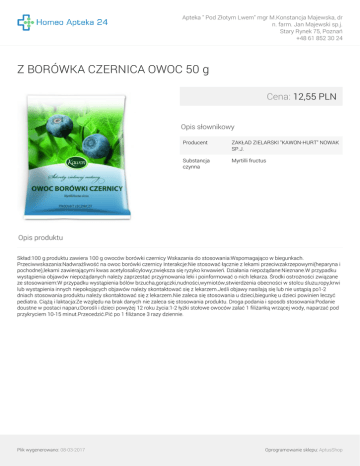 Apteka " Pod Złotym Lwem" mgr M.Konstancja Majewska, dr n. farm. Jan Majewski sp.j. Stary Rynek 75, Poznań +48 61 852 30 24 Z BORÓWKA CZERNICA OWOC 50 g Cena: 12,55 PLN Opis słownikowy Producent ZAKŁAD ZIELARSKI "KAWON-HURT" NOWAK SP.J. Substancja czynna Myrtilli fructus Opis produktu Skład:100 g produktu zawiera 100 g owoców borówki czernicy Wskazania do stosowania:Wspomagająco w biegunkach. Przeciwwskazania:Nadwrażliwość na owoc borówki czernicy Interakcje:Nie stosować łącznie z lekami przeciwzakrzepowymi(heparyna i pochodne),lekami zawierającymi kwas acetylosalicylowy;zwiększa się ryzyko krwawień. Działania niepożądane:Nieznane.W przypadku wystąpienia objawów niepożądanych należy zaprzestać przyjmowania leki i poinformować o nich lekarza. Środki ostrożności związane ze stosowaniem:W przypadku wystąpienia bólów brzucha,gorączki,nudności,wymiotów,stwierdzenia obecności w stolcu śluzu,ropy,krwi lub wystąpienia innych niepokojących objawów należy skontaktować się z lekarzem.Jeśli objawy nasilają się lub nie ustąpią po1-2 dniach stosowania produktu należy skontaktować się z lekarzem.Nie zaleca się stosowania u dzieci,biegunkę u dzieci powinien leczyć pediatra. Ciążą i laktacja:Ze względu na brak danych nie zaleca się stosowania produktu. Droga podania i sposób stosowania:Podanie doustne w postaci naparu:Dorośli i dzieci powyżej 12 roku życia:1-2 łyżki stołowe owoców zalać 1 filiżanką wrzącej wody, naparzać pod przykryciem 10-15 minut.Przecedzić.Pić po 1 filiżance 3 razy dziennie. Plik wygenerowano: 08-03-2017 Powered by TCPDF (www.tcpdf.org) Oprogramowanie sklepu: AptusShop