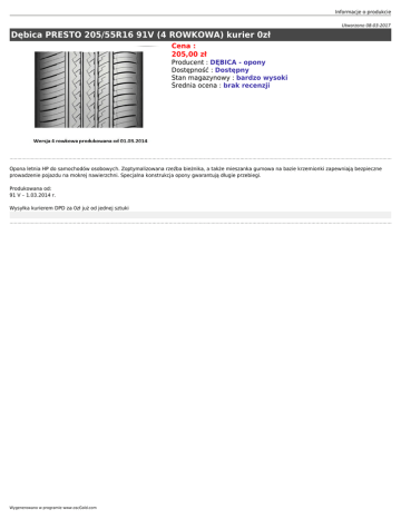 Informacje o produkcie Utworzono 08-03-2017 Dębica PRESTO 205/55R16 91V (4 ROWKOWA) kurier 0zł Cena : 205,00 zł Producent : DĘBICA - opony Dostępność : Dostępny Stan magazynowy : bardzo wysoki Średnia ocena : brak recenzji Opona letnia HP do samochodów osobowych. Zoptymalizowana rzeźba bieżnika, a także mieszanka gumowa na bazie krzemionki zapewniają bezpieczne prowadzenie pojazdu na mokrej nawierzchni. Specjalna konstrukcja opony gwarantują długie przebiegi. Produkowana od: 91 V – 1.03.2014 r. Wysyłka kurierem DPD za 0zł już od jednej sztuki Wygenerowano w programie www.oscGold.com
