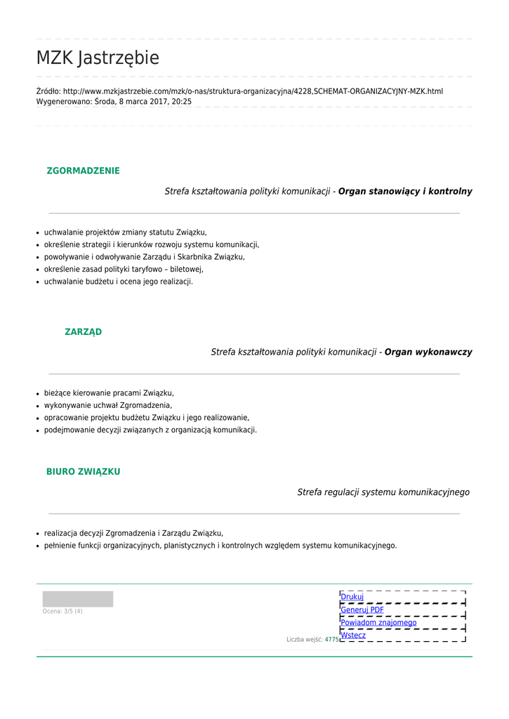 MZK Jastrzębie Źródło: http://www.mzkjastrzebie.com/mzk/o-nas/struktura-organizacyjna/4228,SCHEMAT-ORGANIZACYJNY-MZK.html Wygenerowano: Środa, 8 marca 2017, 20:25 ZGORMADZENIE Strefa kształtowania polityki komunikacji - Organ stanowiący i kontrolny ● uchwalanie projektów zmiany statutu Związku, ● określenie strategii i kierunków rozwoju systemu komunikacji, ● powoływanie i odwoływanie Zarządu i Skarbnika Związku, ● określenie zasad polityki taryfowo – biletowej, ● uchwalanie budżetu i ocena jego realizacji. ZARZĄD Strefa kształtowania polityki komunikacji - Organ wykonawczy ● bieżące kierowanie pracami Związku, ● wykonywanie uchwał Zgromadzenia, ● opracowanie projektu budżetu Związku i jego realizowanie, ● podejmowanie decyzji związanych z organizacją komunikacji. BIURO ZWIĄZKU Strefa regulacji systemu komunikacyjnego ● realizacja decyzji Zgromadzenia i Zarządu Związku, ● pełnienie funkcji organizacyjnych, planistycznych i kontrolnych względem systemu komunikacyjnego. Drukuj Generuj PDF Ocena: 3/5 (4) Powiadom znajomego Liczba wejść: 4775 Wstecz