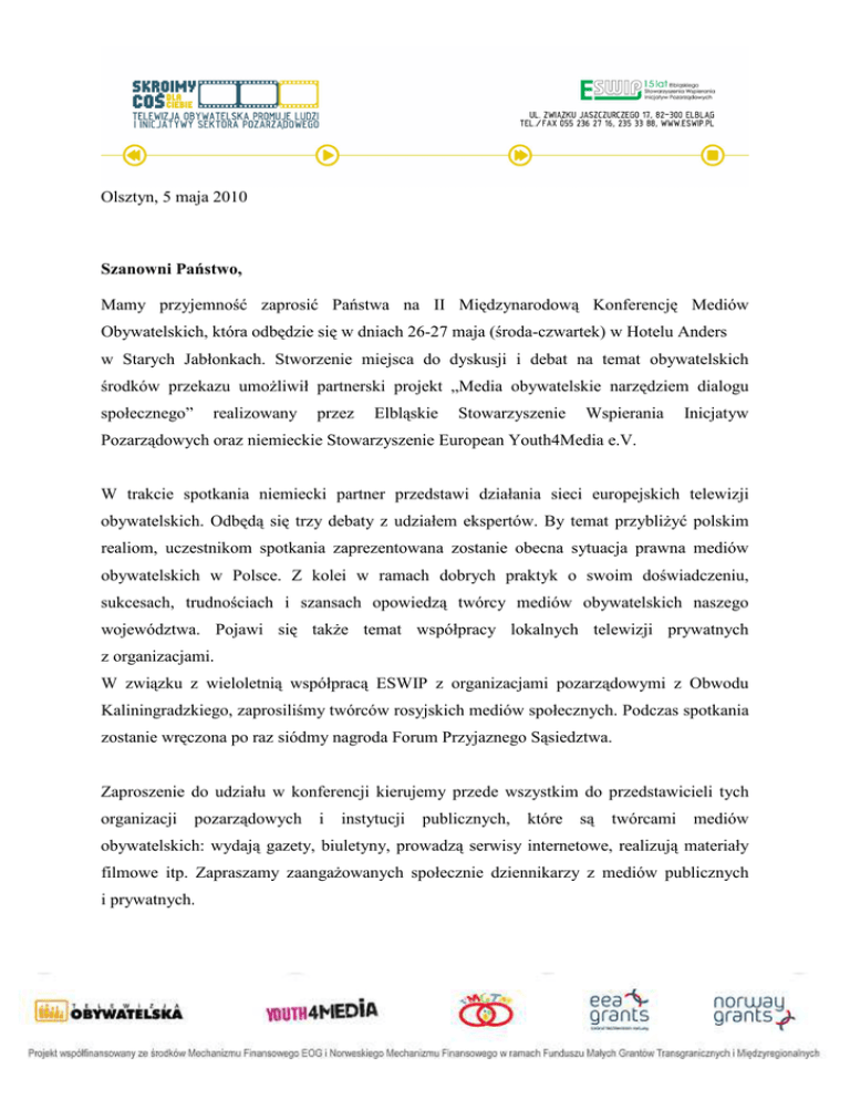 Olsztyn, 5 maja 2010 Szanowni Państwo, Mamy przyjemność zaprosić Państwa na II Międzynarodową Konferencję Mediów Obywatelskich, która odbędzie się w dniach 26-27 maja (środa-czwartek) w Hotelu Anders w Starych Jabłonkach. Stworzenie miejsca do dyskusji i debat na temat obywatelskich środków przekazu umoŜliwił partnerski projekt „Media obywatelskie narzędziem dialogu społecznego” realizowany przez Elbląskie Stowarzyszenie Wspierania Inicjatyw Pozarządowych oraz niemieckie Stowarzyszenie European Youth4Media e.V. W trakcie spotkania niemiecki partner przedstawi działania sieci europejskich telewizji obywatelskich. Odbędą się trzy debaty z udziałem ekspertów. By temat przybliŜyć polskim realiom, uczestnikom spotkania zaprezentowana zostanie obecna sytuacja prawna mediów obywatelskich w Polsce. Z kolei w ramach dobrych praktyk o swoim doświadczeniu, sukcesach, trudnościach i szansach opowiedzą twórcy mediów obywatelskich naszego województwa. Pojawi się takŜe temat współpracy lokalnych telewizji prywatnych z organizacjami. W związku z wieloletnią współpracą ESWIP z organizacjami pozarządowymi z Obwodu Kaliningradzkiego, zaprosiliśmy twórców rosyjskich mediów społecznych. Podczas spotkania zostanie wręczona po raz siódmy nagroda Forum Przyjaznego Sąsiedztwa. Zaproszenie do udziału w konferencji kierujemy przede wszystkim do przedstawicieli tych organizacji pozarządowych i instytucji publicznych, które są twórcami mediów obywatelskich: wydają gazety, biuletyny, prowadzą serwisy internetowe, realizują materiały filmowe itp. Zapraszamy zaangaŜowanych społecznie dziennikarzy z mediów publicznych i prywatnych. W trakcie konferencji, równolegle z debatami, odbywać się będą warsztaty medialne, prowadzone przez uczestników projektu oraz ekipę Telewizji Obywatelskiej. Efektem kilkugodzinnej pracy będzie krótki materiał filmowy, powstały przy zastosowaniu techniki poklatkowej. Udział w warsztatach przewidziany jest dla 15 osób, chętnych prosimy o zaznaczenie zgłoszenia w formularzu zgłoszeniowym na konferencję. Zgłoszenia proszę przesyłać do Marty Florkowskiej do 21 maja – drogą elektroniczną ([email protected]) lub faksem na numer (89) 523-73-45. W tym celu naleŜy wypełnić załączony formularz zgłoszeniowy, dostępny równieŜ na stronie www.eswip.pl. Ilość miejsc jest ograniczona, decyduje kolejność zgłoszeń. W przypadku większej ilości zgłoszeń, organizatorzy zastrzegają sobie moŜliwość doboru uczestników wg kryteriów opisanych powyŜej. Konferencja jest bezpłatna, dojazd na koszt własny uczestników. Program spotkania w załączeniu. Serdecznie zapraszamy Marta Florkowska Arkadiusz Jachimowicz Koordynator projektu Prezes ESWIP
