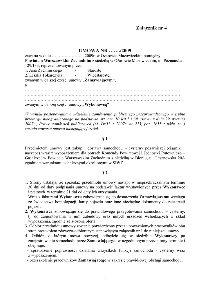 Załącznik nr 4 UMOWA NR ……./2009 zawarta w dniu ………………….. 2009r. w OŜarowie Mazowieckim pomiędzy: Powiatem Warszawskim Zachodnim z siedzibą w OŜarowie Mazowieckim, ul. Poznańska 129/133, reprezentowanym przez: 1. Jana śychlińskiego Starostę 2. Leszka Tokarczyka Wicestarostę, zwanym w dalszej części umowy „Zamawiającym”, a ………………………………………………………………………………………………… ………………………………………………………………………………………………… …………………………………………………………………………………………………, zwanym w dalszej części umowy „Wykonawcą” W wyniku postępowania o udzielenie zamówienia publicznego przeprowadzonego w trybie przetargu nieograniczonego na podstawie art. art. 10 ust.1 i 39 ustawy z dnia 29 stycznia 2007r., Prawo zamówień publicznych (t.j. Dz.U. z 2007r. nr 223, poz. 1655 z późn. zm.) została zawarta umowa następującej treści: §1 Przedmiotem umowy jest zakup i dostawa samochodu – cysterny poŜarniczej (ciągnik + naczepa) wraz z wyposaŜeniem dla potrzeb Komendy Powiatowej i Jednostki Ratowniczo – Gaśniczej w Powiecie Warszawskim Zachodnim z siedzibą w Błoniu, ul. Lesznowska 20A zgodnie z warunkami technicznymi określonymi w SIWZ. §2 1. Strony ustalają, Ŝe sprzedaŜ przedmiotu umowy nastąpi w nieprzekraczalnym terminie 30 dni od daty podpisania umowy na podstawie faktur wystawionych przez Wykonawcę i płatnych w terminie 21 dni od daty ich otrzymania. Wraz z fakturami Wykonawca zobowiązuje się do dostarczenia Zamawiającemu wyciągu ze świadectwa homologacji, karty pojazdu oraz inne niezbędne dokumenty do rejestracji pojazdu. 2. Wykonawca zobowiązuje się do prawidłowego przygotowania samochodu – cysterny, tj. do zamontowania w nim zabudowy oraz innych urządzeń wchodzących w skład wyposaŜenia, zgodnie ze złoŜoną ofertą. 3. Odbiór przedmiotu umowy zostanie potwierdzony przez upowaŜnionych pracowników obu stron protokołem zdawczo-odbiorczym stanowiącym załącznik nr 1 do niniejszej umowy. 4. Odbiór, o którym mowa powyŜej, odbędzie się w siedzibie Wykonawcy po zarejestrowaniu samochodu przez Zamawiającego, w uzgodnionym przez strony terminie i obejmuje: - sprawdzenie poprawności działania wszystkich funkcji samochodu - cysterny wraz z wyposaŜeniem, - przeszkolenie pracowników Zamawiającego w zakresie prawidłowej obsługi samochodu, 1 - odbiór ksiąŜki gwarancyjnej samochodu - cysterny i kart gwarancyjnych dla sprzętu i urządzeń w nim zamontowanych. W przypadku braku kart gwarancyjnych, podstawę gwarancji stanowi faktura VAT i umowa, - odbiór wykazu stacji autoryzowanych, punktów serwisowych na terenie województwa mazowieckiego, uprawnionych do napraw, - instrukcje obsługi w języku polskim samochodu - cysterny, sprzętu i urządzeń w nim zamontowanych, - dołączenie dokumentów potwierdzających spełnianie przez oferowany przedmiot zamówienia wymagań przewidzianych przez Rozporządzenia Ministrów: Spraw Wewnętrznych i Administracji, Obrony Narodowej oraz sprawiedliwości z dnia 18 maja 2000 r. w sprawie warunków technicznych pojazdów specjalnych Policji, Urzędu Ochrony Państwa, StraŜy Granicznej, SłuŜby więziennej i straŜy poŜarnej (Dz.U. z 2000r. nr 45, poz. 524 z późn.zm.) oraz Rozporządzeniu Ministra Infrastruktury z dnia 31 grudnia 2002r. (Dz.U. z 2003r. nr 32, poz. 262), - dołączenie dokumentów potwierdzających prawo producenta przedmiotu zamówienia do oznaczania go znakiem CE – jeśli dotyczy. 5. Nie spełnienie przez Wykonawcę jakiejkolwiek z powyŜszych czynności będzie stanowić podstawę odmowy podpisania protokołu zdawczo – odbiorczego przez osoby wyznaczone przez Zamawiającego. 6. Osobami odpowiedzialnymi za realizację niniejszej umowy oraz do podpisania protokołu zdawczo – odbiorczego są: - ze strony Zamawiającego są: 1. ……………………………………. 2. ……………………………………. - ze strony Wykonawcy: 1. ……………………………………. 2. ……………………………………. §3 1. Wykonawca odpowiada za jakość dostarczonego samochodu - cysterny wraz z wyposaŜeniem. 2. Wykonawca gwarantuje, Ŝe dostarczony sprzęt będzie fabrycznie nowy. 3. Wykonawca oświadcza, Ŝe samochód – cysterna wraz z wyposaŜeniem będą sprawne i gotowe do natychmiastowej eksploatacji. 4. Wykonawca oświadcza, Ŝe parametry techniczne przedmiotu umowy są zgodne z przedstawioną ofertą. 5. Wykonawca udziela 24 miesięcy gwarancji bez limitu kilometrów na dostarczony samochód - cysternę, licząc od daty podpisania przez strony protokołu zdawczoodbiorczego, zgodnie z przedłoŜonymi kartami gwarancyjnymi, o których mowa w § 2 ust. 4 niniejszej umowy. 6. Na wyposaŜenie obowiązują gwarancje udzielone przez producentów sprzętu. 7. Gwarantowany czas rozpoczęcia naprawy gwarancyjnej wynosi 12 godzin, licząc od momentu zgłoszenia uszkodzenia samochodu – cysterny przez Zamawiającego (faxem, drogą elektroniczną lub pisemnie). 8. KaŜda naprawa gwarancyjna powoduje przedłuŜenie okresu gwarancji samochodu - cysterny, o czas trwania naprawy. 9. W razie odrzucenia reklamacji przez Wykonawcę, Zamawiający moŜe złoŜyć wniosek o przeprowadzenie ekspertyzy przez niezaleŜnego rzeczoznawcę. JeŜeli reklamacja 2 Zamawiającego okaŜe się uzasadniona, koszty związane z przeprowadzeniem ekspertyzy poniesie Wykonawca. 10. Wykonawca gwarantuje 10 letni okres pełnej obsługi pogwarancyjnej samochodu cysterny oraz zabezpieczenia na ten czas dostaw części zamiennych i materiałów zuŜywalnych. 11. Wykonawca nie ponosi odpowiedzialności za uszkodzenie samochodu – cysterny oraz wyposaŜenia spowodowane nieprzestrzeganiem przez pracowników Zamawiającego instrukcji obsługi przedmiotu umowy. 12. Postanowienia niniejszej u
