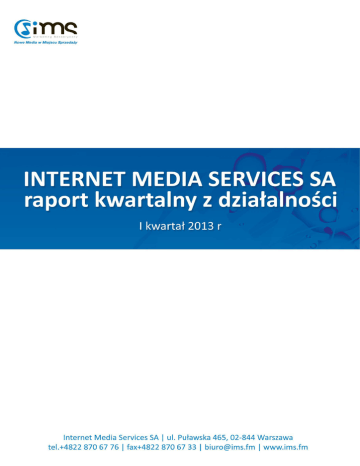 Internet Media Services SA Ul. Puławska 465; 02-844 Warszawa; Tel.+48 22 870 67 76; Fax +48 22 870 67 33; [email protected]; www.ims.fm Internet Media Services SA z siedzibą przy ulicy Puławska 465, 02-844 Warszawa wpisana do rejestru przedsiębiorców prowadzonego przez Sąd Rejonowy dla m.st.Warszawy w Warszawie, XIII Wydział Gospodarczy Krajowego Rejestru Sądowego pod numerem KRS 0000278240, o kapitale zakładowym 662 300,72 zł, nadanym numerze NIP: 525-22-01-663, REGON:016452416, nr rej.GIOŚ: E0012925W Strona 0 SPIS TREŚCI: A. PODSTAWOWE INFORMACJE O SPÓŁCE I GRUPIE KAPITAŁOWEJ INTERNET MEDIA SERVICES ................................ 2 B. SKONSOLIDOWANY RAPORT KWARTALNY ................................................................................................................ 4 1. Wybrane skonsolidowane dane finansowe za I kwartał 2013 roku oraz dane porównawcze za I kwartał 2012 roku Grupy Kapitałowej Internet Media Services..................................................................... 4 2. Komentarz Zarządu Emitenta na temat czynników i zdarzeń, które miały wpływ na osiągnięte wyniki finansowe .................................................................................................................................................. 5 3. Informacje na temat aktywności, jaką podjęto w obszarze rozwoju prowadzonej działalności .......................... 5 C. POZOSTAŁE INFORMACJE .......................................................................................................................................... 8 1. Wybrane jednostkowe dane finansowe za I kwartał 2013 roku oraz dane porównawcze za I kwartał 2012 roku Internet Media Services SA .............................................................................................. 8 2. Struktura akcjonariatu na dzień sporządzenia raportu kwartalnego Internet Media Services SA ....................... 9 3. Akcje IMS SA w NewConnect Lead ..................................................................................................................... 10 Internet Media Services SA Ul. Puławska 465; 02-844 Warszawa; Tel.+48 22 870 67 76; Fax +48 22 870 67 33; [email protected]; www.ims.fm Internet Media Services SA z siedzibą przy ulicy Puławska 465, 02-844 Warszawa wpisana do rejestru przedsiębiorców prowadzonego przez Sąd Rejonowy dla m.st.Warszawy w Warszawie, XIII Wydział Gospodarczy Krajowego Rejestru Sądowego pod numerem KRS 0000278240, o kapitale zakładowym 662 300,72 zł, nadanym numerze NIP: 525-22-01-663, REGON:016452416, nr rej.GIOŚ: E0012925W Strona 1 A. PODSTAWOWE INFORMACJE O SPÓŁCE I GRUPIE KAPITAŁOWEJ INTERNET MEDIA SERVICES Internet Media Services SA (dalej IMS SA) została utworzona w wyniku przekształcenia Internet Media Services Sp. z o.o. w spółkę akcyjną w dniu 10 kwietnia 2007 r. IMS Sp. z o.o. powstała w 2000 roku. Dane teleadresowe i rejestracyjne Siedziba ul. Puławska 465, 02-844 Warszawa Sąd Rejestrowy Sąd Rejonowy dla m.st.Warszawy, XIII Wydział Gospodarczy Krajowego Rejestru Sądowego KRS 0000278240 Kapitał zakładowy 662 300,72 PLN NIP 525-22-01-663 REGON 016452416 Strona www www.ims.fm Telefon +48 22 870 67 76 Fax +48 22 870 67 33 Na dzień 31 marca 2013 roku w skład Grupy Kapitałowej IMS wchodziły poniższe spółki: - Internet Media Services SA z siedzibą w Warszawie – jednostka dominująca; - Tech Cave Sp. z o.o. z siedzibą w Krakowie, ul. Lipowa 3 – IMS SA posiada 100 % udziałów; - Videotronic Media Solutions Sp. z o.o. z siedzibą w Warszawie, ul. Puławska 465 - IMS SA posiada 70 % udziałów. Grupa Kapitałowa IMS jest międzynarodowym dostawcą wyspecjalizowanych usług z zakresu marketingu sensorycznego w miejscu sprzedaży. Nowoczesne rozwiązania oferowane przez Grupę pozwoliły jej osiągnąć pozycję lidera na rynku polskim, jak również rozpocząć rozwój oferty na innych rynkach europejskich. Grupa dostarcza usługi, które mają na celu wpłynięcie na atrakcyjność miejsc sprzedaży, jak również wzrost sprzedaży promowanego asortymentu. Działania Grupy skupiają się w trzech głównych obszarach marketingu sensorycznego: audiomarketingu - przygotowanie i emisja formatów muzycznych oraz produkcja i emisja reklam dźwiękowych (abonamenty audio i reklama audio), Digital Signage - produkcja i emisja przekazów reklamowych na ekranach plazmowych (abonamenty video i reklama video), Internet Media Services SA Ul. Puławska 465; 02-844 Warszawa; Tel.+48 22 870 67 76; Fax +48 22 870 67 33; [email protected]; www.ims.fm Internet Media Services SA z siedzibą przy ulicy Puławska 465, 02-844 Warszawa wpisana do rejestru przedsiębiorców prowadzonego przez Sąd Rejonowy dla m.st.Warszawy w Warszawie, XIII Wydział Gospodarczy Krajowego Rejestru Sądowego pod numerem KRS 0000278240, o kapitale zakładowym 662 300,72 zł, nadanym numerze NIP: 525-22-01-663, REGON:016452416, nr rej.GIOŚ: E0012925W Strona 2 aromamarketingu - dobór i dystrybucja kompozycji zapachowych (umowy abonamentowe). Powyższe dziedziny stanowią trzon marketingu sensorycznego, który jest działaniem polegającym na umiejętnym dobraniu odpowiednich bodźców dźwiękowych, wizualnych i zapachowych w celu wywołania oczekiwanych reakcji u klientów. Misją Grupy jest pozostanie wiodącym dostawcą rozwiązań podnoszących efektywność i atrakcyjność miejsc sprzedaży. Ideą Grupy jest oferowanie kompleksowych rozwiązań marketingowych, które odciążą klienta od implementacji, zarządzania i monitorowania systemów i procesów sprzedaży nakierowanych na działania marketingowe w miejscu sprzedaży. Wytworzenie właściwej atmosfery miejsc sprzedaży pozwala wpłynąć m.in. na: zachowania klientów (wzbudzenie zainteresowania miejscem sprzedaży, wydłużenie czasu pobytu klienta w sklepie, co w konsekwencji wpływa na zwiększenie prawdopodobieństwa dokonania zakupów), budowanie wizerunku marki (odpowiednio dobr