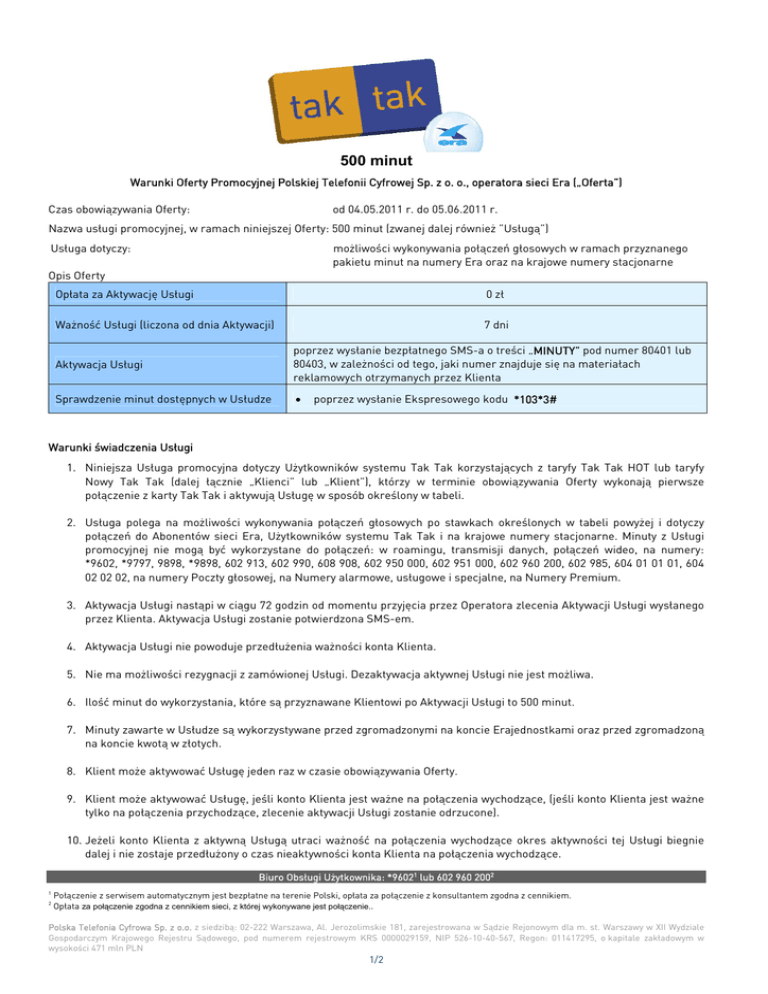 500 minut Warunki Oferty Promocyjnej Polskiej Telefonii Cyfrowej Sp. z o. o., operatora sieci Era („Oferta”) Czas obowiązywania Oferty: od 04.05.2011 r. do 05.06.2011 r. Nazwa usługi promocyjnej, w ramach niniejszej Oferty: 500 minut (zwanej dalej również ”Usługą”) Usługa dotyczy: możliwości wykonywania połączeń głosowych w ramach przyznanego pakietu minut na numery Era oraz na krajowe numery stacjonarne Opis Oferty Opłata za Aktywację Usługi 0 zł Ważność Usługi (liczona od dnia Aktywacji) 7 dni Aktywacja Usługi poprzez wysłanie bezpłatnego SMS-a o treści „MINUTY” pod numer 80401 lub 80403, w zależności od tego, jaki numer znajduje się na materiałach reklamowych otrzymanych przez Klienta Sprawdzenie minut dostępnych w Usłudze • poprzez wysłanie Ekspresowego kodu *103*3# Warunki świadczenia Usługi 1. Niniejsza Usługa promocyjna dotyczy Użytkowników systemu Tak Tak korzystających z taryfy Tak Tak HOT lub taryfy Nowy Tak Tak (dalej łącznie „Klienci” lub „Klient”), którzy w terminie obowiązywania Oferty wykonają pierwsze połączenie z karty Tak Tak i aktywują Usługę w sposób określony w tabeli. 2. Usługa polega na możliwości wykonywania połączeń głosowych po stawkach określonych w tabeli powyżej i dotyczy połączeń do Abonentów sieci Era, Użytkowników systemu Tak Tak i na krajowe numery stacjonarne. Minuty z Usługi promocyjnej nie mogą być wykorzystane do połączeń: w roamingu, transmisji danych, połączeń wideo, na numery: *9602, *9797, 9898, *9898, 602 913, 602 990, 608 908, 602 950 000, 602 951 000, 602 960 200, 602 985, 604 01 01 01, 604 02 02 02, na numery Poczty głosowej, na Numery alarmowe, usługowe i specjalne, na Numery Premium. 3. Aktywacja Usługi nastąpi w ciągu 72 godzin od momentu przyjęcia przez Operatora zlecenia Aktywacji Usługi wysłanego przez Klienta. Aktywacja Usługi zostanie potwierdzona SMS-em. 4. Aktywacja Usługi nie powoduje przedłużenia ważności konta Klienta. 5. Nie ma możliwości rezygnacji z zamówionej Usługi. Dezaktywacja aktywnej Usługi nie jest możliwa. 6. Ilość minut do wykorzystania, które są przyznawane Klientowi po Aktywacji Usługi to 500 minut. 7. Minuty zawarte w Usłudze są wykorzystywane przed zgromadzonymi na koncie Erajednostkami oraz przed zgromadzoną na koncie kwotą w złotych. 8. Klient może aktywować Usługę jeden raz w czasie obowiązywania Oferty. 9. Klient może aktywować Usługę, jeśli konto Klienta jest ważne na połączenia wychodzące, (jeśli konto Klienta jest ważne tylko na połączenia przychodzące, zlecenie aktywacji Usługi zostanie odrzucone). 10. Jeżeli konto Klienta z aktywną Usługą utraci ważność na połączenia wychodzące okres aktywności tej Usługi biegnie dalej i nie zostaje przedłużony o czas nieaktywności konta Klienta na połączenia wychodzące. Biuro Obsługi Użytkownika: *96021 lub 602 960 2002 1 2 Połączenie z serwisem automatycznym jest bezpłatne na terenie Polski, opłata za połączenie z konsultantem zgodna z cennikiem. Opłata za połączenie zgodna z cennikiem sieci, z której wykonywane jest połączenie.. Polska Telefonia Cyfrowa Sp. z o.o. z siedzibą: 02-222 Warszawa, Al. Jerozolimskie 181, zarejestrowana w Sądzie Rejonowym dla m. st. Warszawy w XII Wydziale Gospodarczym Krajowego Rejestru Sądowego, pod numerem rejestrowym KRS 0000029159, NIP 526-10-40-567, Regon: 011417295, o kapitale zakładowym w wysokości 471 mln PLN 1/2 11. Minuty zawarte w Usłudze są możliwe do wykorzystania w ciągu 7 dni od daty dodania ich do konta (Aktywacji Usługi), po tym terminie przepadają, z zastrzeżeniem pkt 14 poniżej. Po zakończeniu okresu Ważności Usługi opłata za połączenia będzie pobrana zgodnie z obowiązującym Klienta cennikiem aktualnym dla posiadanej taryfy lub Warunkami Oferty Promocyjnej, z której Klient korzysta. 12. Po zakończeniu okresu obowiązywania Oferty Klient może korzystać z aktywowanej już Usługi do końca okresu Ważności Usługi. 13. Klient nie może zamówić Usługi, jeśli posiada aktywną usługę Godzina za Grosze. Jeśli Klient nie wykorzystał limitu minut terminowych w Usłudze i aktywuje usługę Godzina za Grosze albo Rozmowy za Grosze, naliczanie terminu ważności niewykorzystanych minut terminowych zostaje wstrzymane do czasu deaktywacji usługi Godzina za Grosze albo Rozmowy za Grosze. Od momentu, deaktywacji usługi Godzina za Grosze albo Rozmowy za Grosze, naliczanie terminu ważności minut terminowych zostaje wznowione. 14. Jeżeli w okresie 7 dni od daty dodania do konta minut z Usługi, do konta Klienta zostaną dodane kolejne terminowe minuty, wówczas liczba zgromadzonych minut sumuje się, a data ich ważności: • • • pozostaje bez zmian, jeśli ważność nowo nabytych minut z terminem ważności jest krótsza niż tych, które były już zgromadzone na koncie; jest naliczana od nowa, zgodnie z datą ważności nowo nabytych minut terminowych, jeśli data ważności nowo nabytych minut z terminem ważności jest późniejsza niż tych, które już były zgromadzone na koncie. zostaje zablokowana jeśli Klient korzysta z usług Godzina za Grosze albo Rozmowy za Grosze., do czasu deaktywacji tych usług o czym mowa w pkt.13. 15. Nie ma możliwości aktywacji Usługi na innym numerze telefonu niż ten, z którego zostało wysłane zlecenie Aktywacji. 16. Jeżeli w momencie korzystania z Usługi, Klient dokona zmiany obecnie posiadanej taryfy na: a) inną taryfę w systemie Tak Tak, aktywowana już Usługa zostanie przeniesione do nowej taryfy. Klient ma prawo korzystać z Usługi na warunkach niniejszej Oferty. b) ofertę Tak Tak Fon w Era Mix, aktywowana już Usługa zostanie przeniesione do nowej taryfy. Klient ma prawo korzystać z Usługi na warunkach niniejszej Oferty. c) ofertę w Era Mix inną niż ta, o której mowa w punkcie 16 b) lub na ofertę w systemie abonamentowym, aktywowana już Usługa nie zost