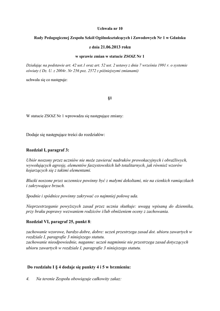 Uchwała nr 10 Rady Pedagogicznej Zespołu Szkół Ogólnokształcących i Zawodowych Nr 1 w Gdańsku z dnia 21.06.2013 roku w sprawie zmian w statucie ZSOiZ Nr 1 Działając na podstawie art. 42 ust.1 oraz art. 52 ust. 2 ustawy z dnia 7 września 1991 r. o systemie oświaty ( Dz. U. z 2004r. Nr 256 poz. 2572 z późniejszymi zmianami) uchwala się co następuje: §1 W statucie ZSOiZ Nr 1 wprowadza się następujące zmiany: Dodaje się następujące treści do rozdziałów: Rozdział I, paragraf 3: Ubiór noszony przez uczniów nie może zawierać nadruków prowokacyjnych i obraźliwych, wywołujących agresję, elementów faszystowskich lub totalitarnych, jak również wzorów kojarzących się z takimi elementami. Bluzki noszone przez uczennice powinny być z małymi dekoltami, nie na cienkich ramiączkach i zakrywające brzuch. Spodnie i spódnice powinny zakrywać co najmniej połowę uda. Nieprzestrzeganie powyższych zasad przez ucznia skutkuje: uwagą wpisaną do dziennika, przy braku poprawy wezwaniem rodziców i/lub obniżeniem oceny z zachowania. Rozdział VI, paragraf 25, punkt 8: zachowanie wzorowe, bardzo dobre, dobre: uczeń przestrzega zasad dot. ubioru zawartych w rozdziale I, paragrafie 3 niniejszego statutu. zachowanie nieodpowiednie, naganne: uczeń nagminnie nie przestrzega zasad dotyczących ubioru zawartych w rozdziale I, paragrafie 3 niniejszego statutu. Do rozdziału I § 4 dodaje się punkty 4 i 5 w brzmieniu: 4. Na terenie Zespołu obowiązuje całkowity zakaz: - palenia tytoniu i innych substytutów (np. papieros elektroniczny), - zażywania, posiadania i rozprowadzania wszelkich wyrobów tytoniowych (np. tabaka) - zażywania, posiadania, rozprowadzania narkotyków, - przebywania pod wpływem narkotyków, - zażywania, posiadania, rozprowadzania alkoholu, - przebywania pod wpływem alkoholu. 5. Na terenie szkoły obowiązuje przestrzeganie ustawy o języku polskim zakazującej używania w miejscach publicznych wyrazów niecenzuralnych. Rozdział VII paragraf 54 punkt 7 przyjmuje brzmienie: Ustawa o systemie oświaty nakłada na rodziców obowiązek zapisania pięciolatka na rok szkolny 2012/2013 do przedszkola, oddziału przedszkolnego zorganizowanego przy szkole podstawowej lub punktu przedszkolnego. Dzieci sześcioletnie, które nie zostaną przez rodziców zapisane w wieku sześciu lat do klasy I, również objęte są obowiązkiem rocznego przygotowania przedszkolnego w roku szkolnym 2012/2013 oraz 2013/2014. (podstawa prawna art. 14 ust. 3 ustawy o systemie oświaty Dz. U. z 2004 r. Nr 256, poz. 2572 z późn. zm.) §2 Uchwała wchodzi w życie z dniem podjęcia 21.06.2013 r. §3 Realizację uchwały powierza się dyrektorowi ZSOiZ Nr 1.