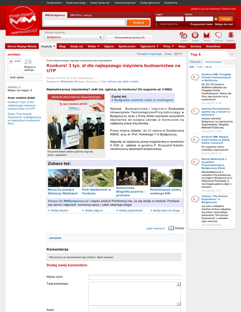 Dodaj artykuł Dodaj wpis bloga Dodaj "dzieje się" Dodaj fotoreportaż Dodaj ogłoszenie Dodaj firmę Jesteś tu po raz pierwszy? Samouczek MM Bydgoszcz Login: MM firmy i usługi Hasło: b Zapamiętaj mnie c d e f g Przypomnij hasło Dołącz do nas! Wybierz dzielnicę Bydgoszcz Personalizuj stronę [?] Pizza Strona Mojego Miasta Artykuły Blogi Dzieje się Wideo Zdjęcia Ogłoszenia Powiadom znajomego amidala amidala Społeczność 28 Miejsce w rankingu brak opisu Artykuły: 2 Miejsc na mapie: 0 Firmy Mapa Drukuj Radio Serwisy Konkurs! 3 tys. zł dla najlepszego inżyniera budownictwa na UTP Rabaty SweetDeal Polecane Komentowane 24h 30 dni 9 Dodane 2012-03-28 14.25 , komentarzy 0 Kategorie: Wiadomości Miejsce: Bydgoszcz, Tagi: konkurs, utp, alstal, outside, 7 dni Konkurs MM: Przegląd Filmów Festiwalowych w Multikinie 28, 29 i 30 marca w Multikinie odbędzie się Przegląd Filmów Festiwalowych. Mamy dla Was zaproszenia na to wydarzenie! Napisałeś pracę inżynierską? Jeśli tak, zgłoś ją do konkursu! Do wygrania aż 3 000zł. Czytaj też: > Bydgoskie uczelnie nisko w rankingach Konkurs! 3 tys. zł dla najlepszego inżyniera budownictwa na UTP Randki Top 5 Firma Alstal funduje nagrodę w konkursie prac inżynierskich Autor ostatnio dodał: Modo 2012-03-27 12.09 Wydział B u d o w n i c t w a i I nży n i e r i i Środowiska Uniwersytetu Technologiczno-P r z y r o d n i c z e g o w Bydgoszczy wraz z firmą Alstal zaprasza wszystkich inży n i e r ó w d o w z ięcia udziału w k o n k u r s i e n a najlepszą pracę inżynierską. Ekipa "The Human Experience" w Bydgoszczy ze specjalnymi pokazami filmu 7 Artysta odwiedzi Bydgoszcz na zaproszenie Wojewódzkiej i Miejskiej Biblioteki Publicznej. Prace można składać do 31 marca w Dziekanacie WBiIŚ, przy al. Prof. Kaliskiego 7 w Bydgoszczy. Nagrodę za najlepszą pracę magisterską w wysokości 5 0 0 0 zł. odebrał w grudniu P. Krzysztof Kaliski, zeszłoroczny absolwent budownictwa. 2012-03-27 12.30 6 2012-03-28 09.19 Autor: nadesłane 2 Zobacz też: Park Akademicki w Fordonie Komornicka. Biografia pozorna premiera > dodaj zdjęcia > dodaj wydarzenie Maciej Maleńczuk z zespołem Psychodancing w Bydgoszczy [foto] Maciej Maleńczuk z zespołem Psychodancing wystąpił w Bydgoszczy w Filharmonii Pomorskiej. U nas bogata galeria zdjęć z koncertu. Rewitalizacja szlaku wodnego E40 Dołącz do MMBydgoszcz.pl i napisz artykuł! Poinformuj nas, co się dzieje w mieście. Pochwal się swoimi zdjęciami, komentuj wpisy i załóż własnego bloga! > dodaj artykuł Konkurs MM: Wygraj w e jściówkę na pokaz kotów rasowych Do wygrania cztery podwójne zaproszenia! Krzysztof Kaliski odbiera główną nagrodę Marsz ku pamięci Żołnierzy Wyklętych Andrzej Poniedzielski spotka się z fanami w bibliotece > dodaj wpis do bloga 2012-03-25 17.31 2 Twórcy "The Human Experience" w Bydgoszczy Już jutro w Miejskim Centrum Kultury odbędzie się pokaz niezwykłego dokumentu "The Human Experience" z udziałem jego twórców. 2012-03-28 08.00 zgłoś nadużycie amidala Komentarze Nikt jeszcze nie skomentował tego artykułu. Bądź pierwszy! Dodaj swój komentarz: Wpisz tytuł: Twój komentarz: 5 6 Autor: Dodaj komentarz 11° Środa 2012-03-28 Lotto Imieniny: Anieli, Sykstusa Kto mieszka w Mieście: 9 Kobiety 52 % (2026) Co się dzieje w mieście? Dodaj artykuł na MM Bydgoszcz. 15 28 40 43 49 Łukasz Jędrzejczak - Redaktor dyżurny (opiekun dzielnicy) Mężczyźni 48 % (1852) Gadu-Gadu: 3045274 wiadomości: 18701 zdjęcia: 82810 imprezy: 634 blogi: 710 firmy: 657 Zobacz też: MM Polska Bydgoszcz Kraków Łódź Lublin Poznań Silesia Szczecin Trójmiasto Warszawa Artykuły Społeczność Firmy i usługi Wideo Inne O nas Wiadomości Lista mieszkańc ó w Rozrywka Wiadomości Mapa Kontakt Na sygnale Lista blogów Kultura Na sygnale Ogłoszenia O nas Sport Galerie użytkowników Zakupy Sport Serwisy specjalne Reklama Kultura Gastronomia Foto Patronaty medialne Foto Stacje benzynowe Wideo Linki Wideo Hotele Magazyn Regulamin Magazyn Zdrowie Biznes Biznes Urzędy, instytucje Kultura Wybory Turystyka MoDO Usługi Telefon: 782690550 Wrocła w Sport Inne Media Regionalne sp. z o. o. zastrzega, że dalsze rozpowszechnianie materiałów opublikowanych w portalu www.mmbydgoszcz.pl jest zabronione bez zachowania warunków korzystania z treści. Podstawa prawna: art. 25 ust. 1 pkt 1 b ustawy z dnia 4 lutego 1994 r. o prawie autorskim i prawach pokrewnych. Wszelkie prawa zastrzeżone. Media Regionalne sp. z o.o. w Warszawie. 2001-2009<!--[if !IE 6]--> <!--[endif]--> created by artegence