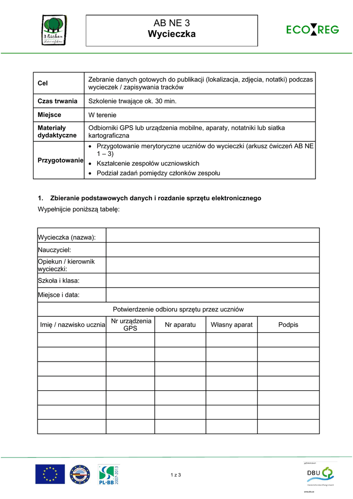 AB NE 3 Wycieczka Cel Zebranie danych gotowych do publikacji (lokalizacja, zdjęcia, notatki) podczas wycieczek / zapisywania tracków Czas trwania Szkolenie trwające ok. 30 min. Miejsce W terenie Materiały dydaktyczne Odbiorniki GPS lub urządzenia mobilne, aparaty, notatniki lub siatka kartograficzna Przygotowanie merytoryczne uczniów do wycieczki (arkusz ćwiczeń AB NE 1 – 3) Przygotowanie Kształcenie zespołów uczniowskich Podział zadań pomiędzy członków zespołu 1. Zbieranie podstawowych danych i rozdanie sprzętu elektronicznego Wypełnijcie poniższą tabelę: Wycieczka (nazwa): Nauczyciel: Opiekun / kierownik wycieczki: Szkoła i klasa: Miejsce i data: Potwierdzenie odbioru sprzętu przez uczniów Imię / nazwisko ucznia Nr urządzenia GPS Nr aparatu 1z3 Własny aparat Podpis AB NE 3 Wycieczka 2. Zadania dla wszystkich dzieci Wycieczkę prowadzą opiekunowie merytoryczni. Przekazują oni informacje przy każdym punkcie POI (POI – Point of Interest) i omawiają ewentualne zadania. Podział zadań: Nawigator (osoba odpowiedzialna za GPS): Zapisz track i zaznacz punkty POI wraz z numerem, nazwą i symbolem, np. „POI 2 – park miejski“. Fotograf: Zrób zdjęcia ogólne oraz szczegółów w punkcie POI, a także swoich kolegów przy pracy. Uważaj na to, aby ująć na zdjęciu aspekty ZR widoczne w danym punkcie. Protokolant: Sporządź dla każdego punktu jak najwięcej notatek. Pamiętaj: Tylko ten, kto ma dobre notatki, może sporządzić dobre opisy punktów POI. 3. Samokontrola w każdym punkcie obserwacyjnym 4. Nawigator: Punkt POI został zaznaczony i nazwany w urządzeniu GPS. Fotograf: Co zostało opisane w danym punkcie POI, zostało również sfotografowane. Protokolant: Notatki są kompletne. Nawigator i protokolant: Nr i nazwa punktu POI w urządzeniu GPS i w notatkach są ze sobą zgodne. Zadania dla nauczycieli Zapis tracków lub wycieczki z użyciem nowych mediów i zapis danych są zadaniem złożonym, wymagającym i dla wielu uczniów nowe. Do najważniejszych zadań nauczycieli należy: Dbanie o dyscyplinę, bo nauczyciel zna swoich uczniów. Aktywny udział w wycieczce, m.in. prowadzenie rozmów z uczniami i omawianie z nimi realizacji powyższych zadań. Wspieranie opiekunów merytorycznych lub kierownika wycieczki w trakcie podsumowania informacji przy każdym z punktów POI. 5. Zadania nauczyciela środowiska / przewodnika prowadzącego wycieczkę Wycieczki często prowadzą nauczyciele środowiska, strażnicy przyrody lub pracownicy obszarów ochrony przyrody. Są oni kompetentni, zaangażowani i chcą przekazać uczniom dużo wiedzy i opowiadają interesujące historie w trakcie pokonywania drogi. W celu opracowania trasy turystycznej GPS, uczniowie (i nauczyciele) muszą utrwalić podczas wycieczki lub zapisu tracka informacje nadające się do publikacji (lokalizacja, zdjęcia, notatki). Wycieczka należy tak prowadzić, żeby uczeń mógł zanotować jasne informacje z odpowiednimi zdjęciami dla każdego zaznaczonego POI. Należy uwzględnić następujące wskazówki: Zastanów się przed wycieczką, które punkty POI i które informacje są niezbędne do realizacji założeń merytorycznych wycieczki, czyli uwzględnienia w jej przebiegu klarownych informacji dotyczących ZR. Nadaj każdemu punktowi POI krótką i charakterystyczną nazwę. Równie zwięzły i trafny powinien być opis POI. Zaplanuj na opis każdego punktu około 500–600 znaków. Opisz pod kątem ZR to, co jest charakterystyczne, zwraca uwagę i jest godne zobaczenia, co uczniowie i turyści później będą również mogli dostrzec (i sfotografować) w punkcie POI. 2z3 AB NE 3 Wycieczka Dokonaj z uczniami powtórki i podsumowania informacji uzyskanych w każdym punkcie POI. Jest to okazja do zebrania najważniejszych informacji wraz z uczniami i do porównania zapisków protokolantów. Poproś nauczyciela, aby uczestniczył w powtórce. Zalecane jest wspólne opracowanie z uczniami arkusza ćwiczeń AB NE 1: Planowanie trasy turystycznej GPS i dzięki temu przygotowanie merytoryczne wyprawy. Notatki: 3z3