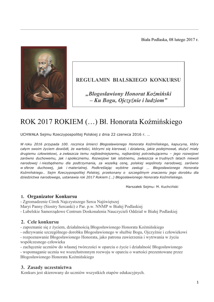 Biała Podlaska, 08 lutego 2017 r. REGULAMIN BIALSKIEGO KONKURSU „Błogosławiony Honorat Koźmiński – Ku Bogu, Ojczyźnie i ludziom” ROK 2017 ROKIEM (…) Bł. Honorata Koźmińskiego UCHWAŁA Sejmu Rzeczypospolitej Polskiej z dnia 22 czerwca 2016 r. … W roku 2016 przypada 100. rocznica śmierci Błogosławionego Honorata Koźmińskiego, kapucyna, który całym swoim życiem dowiódł, że wartości, którymi się kierował, i działania, jakie podejmował, służyć miały drugiemu człowiekowi, a zwłaszcza temu najbiedniejszemu, najbardziej potrzebującemu – jego rozwojowi zarówno duchowemu, jak i społecznemu. Rozwojowi tak istotnemu, zwłaszcza w trudnych latach niewoli narodowej i niezbędnemu dla podtrzymania, za wszelką cenę, polskiej wspólnoty narodowej, zarówno w sferze duchowej, jak i materialnej. Podkreślając wybitne zasługi … Błogosławionego Honorata Koźmińskiego… Sejm Rzeczypospolitej Polskiej, przekonany o szczególnym znaczeniu jego dorobku dla dziedzictwa narodowego, ustanawia rok 2017 Rokiem (…) Błogosławionego Honorata Koźmińskiego. Marszałek Sejmu: M. Kuchciński 1. Organizator Konkursu - Zgromadzenie Córek Najczystszego Serca Najświętszej Maryi Panny (Siostry Sercanki) z Par. p.w. NNMP w Białej Podlaskiej - Lubelskie Samorządowe Centrum Doskonalenia Nauczycieli Oddział w Białej Podlaskiej 2. Cele konkursu - zapoznanie się z życiem, działalnością Błogosławionego Honorata Koźmińskiego - odkrywanie szczególnego dorobku Błogosławionego w służbie Bogu, Ojczyźnie i człowiekowi - rozpoznawanie Błogosławionego Honorata, jako patrona zawierzenia i wytrwania w życiu współczesnego człowieka - zachęcenie uczniów do własnej twórczości w oparciu o życie i działalność Błogosławionego - wspomaganie ucznia we wszechstronnym rozwoju w oparciu o wartości prezentowane przez Błogosławionego Honorata Koźmińskiego 3. Zasady uczestnictwa Konkurs jest skierowany do uczniów wszystkich etapów edukacyjnych. 1 Kategorie konkursu: a. I etap edukacyjny (klasy I – III szkoły podstawowej): konkurs plastyczny b. II etap edukacyjny (klasy IV – VI szkoły podstawowej): konkurs plastyczny, konkurs wiedzy c. III etap edukacyjny (gimnazjum): konkurs wiedzy, prezentacja multimedialna d. IV etap edukacyjny (szkoły ponadgimnazjalne): konkurs wiedzy, film, konkurs fotograficzny e. Uczniowie o specjalnych potrzebach edukacyjnych: konkurs plastyczny Tematem przewodnim konkursu jest hasło: „Błogosławiony Honorat Koźmiński – Ku Bogu, Ojczyźnie i ludziom”. W związku z tym, wszelkie prace konkursowe powinny nawiązywać do motywu przewodniego konkursu w oparciu o opis życia i działalności Błogosławionego Honorata Koźmińskiego. Konkurs plastyczny: uczeń samodzielnie wykonuje tematyczną pracę dowolną techniką (format A3 lub A4). Prezentacja multimedialna: uczeń samodzielnie wykonuje tematyczną pracę (15-20 slajdów i przekazuje ją na płycie CD lub DVD). Film: uczeń samodzielnie nagrywa tematyczny film (od 3 do 5 minut i przekazuje go na płycie CD lub DVD). Konkurs fotograficzny: uczeń wykonuje tematyczną pracę i przekazuje album w formie papierowej albo na płycie CD lub DVD. Praca musi być opatrzona godłem - zapewnienie anonimowości obiektywnej oceny. (Godło to hasło - jakiś wyraz, którym podpisuje się pracę. Do pracy dołącza się zaklejoną kopertą, z napisanym takim samym hasłem – godłem, a w środku są dane osobowe autora pracy. Komisja konkursowa przyznaje nagrody wg godeł, a następnie otwiera się koperty i ogłasza wyniki konkursu). UWAGA: Każdy uczeń może uczestniczyć w jednej z wybranych form konkursu w swojej kategorii (może złożyć jedną pracę tematyczną na konkurs plastyczny lub jeden film, albo jedną prezentację multimedialną lub przystąpić do konkursu wiedzy). 4. Terminy i miejsce składania prac Samodzielnie wykonane prace plastyczne, prezentacje multimedialne, filmy, prace na konkurs fotograficzny uczniowie składają u swoich nauczycieli religii do dnia 23 marca 2017 r. Konkurs wiedzy odbędzie się w dwóch etapach: - etap I w dniu 23 marca 2017 r. w szkole, do której uczęszcza uczeń (ogłoszenie wyników 27 marca 2017 r.) - etap II w dniu 04 kwietnia 2017 r. (zwycięzcy zostaną poinformowani o szczegółach II etapu, czyli o terminie, godzinie i miejscu przez swoich nauczycieli religii) Podsumowanie wyników konkursu planowane jest w Białej Podlaskiej podczas miejskich uroczystości poświęconych Bł. Honoratowi Koźmińskiemu (maj/czerwiec 2017 r.) 5. Lektura obowiązkowa Opis życia i działalności Błogosławionego Honorata jest dostępny u katechetów. 6. W konkursie przewidziane są nagrody w poszczególnych kategoriach (niespodzianki). Dwóch uczniów z każdej szkoły z najwyższą ilością punktów uzyskanych w konkursie wiedzy awansuje do II etapu rozgrywek. W pozostałych kategoriach do II etapu przechodzą uczniowie, którzy w swojej szkole zajęli I,II lub III miejsce. 2 7. Za przeprowadzenie konkursu o Błogosławionym Honoracie Koźmińskim odpowiedzialni są nauczyciele religii. Zachęcamy innych nauczycieli do współpracy z katechetami w prowadzanym przedsięwzięciu. 8. Postanowienia końcowe Udział w konkursie jest jednoznaczny z wyrażeniem zgody na późniejszą publikację nadesłanej pracy. Udział w konkursie jest jednoznaczny z wyrażeniem zgody na przetwarzanie przez Organizatora danych osobowych na potrzeby konkursu (Ustawa o ochronie danych osobowych z dnia 29 sierpnia 1997 r., Dz. U. Nr 101 z 2002 r., poz. 926, z późn. zm.). Udział w konkursie jest jednoznaczny z akceptacją jego regulaminu. Prace konkursowe nie będą zwracane. Organizator zastrzega sobie prawo do zmiany terminów w niniejszym regulaminie, jeżeli będą tego wymagały okoliczności obiektywne. Koordynator Konkursu o Błogosławionym Honoracie Barbara Wysokińska, Konsultant ds. katechezy w LSCDN o. Biała Podlaska Nauczyciel religii w 