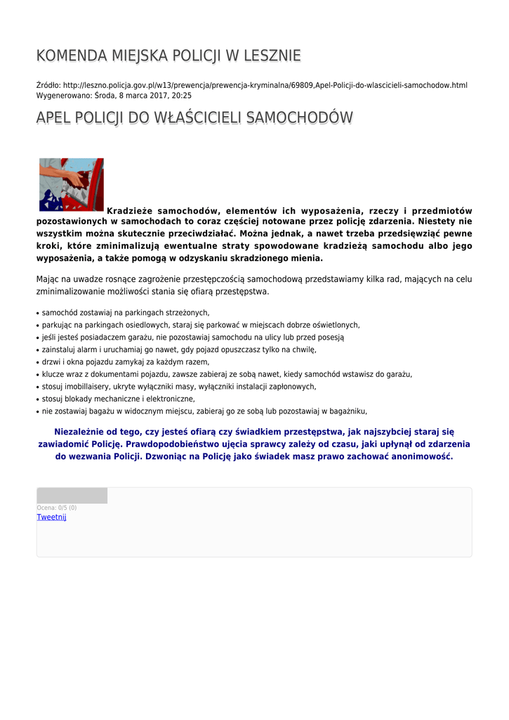 KOMENDA MIEJSKA POLICJI W LESZNIE Źródło: http://leszno.policja.gov.pl/w13/prewencja/prewencja-kryminalna/69809,Apel-Policji-do-wlascicieli-samochodow.html Wygenerowano: Środa, 8 marca 2017, 20:25 APEL POLICJI DO WŁAŚCICIELI SAMOCHODÓW Kradzieże samochodów, elementów ich wyposażenia, rzeczy i przedmiotów pozostawionych w samochodach to coraz częściej notowane przez policję zdarzenia. Niestety nie wszystkim można skutecznie przeciwdziałać. Można jednak, a nawet trzeba przedsięwziąć pewne kroki, które zminimalizują ewentualne straty spowodowane kradzieżą samochodu albo jego wyposażenia, a także pomogą w odzyskaniu skradzionego mienia. Mając na uwadze rosnące zagrożenie przestępczością samochodową przedstawiamy kilka rad, mających na celu zminimalizowanie możliwości stania się ofiarą przestępstwa. ● samochód zostawiaj na parkingach strzeżonych, ● parkując na parkingach osiedlowych, staraj się parkować w miejscach dobrze oświetlonych, ● jeśli jesteś posiadaczem garażu, nie pozostawiaj samochodu na ulicy lub przed posesją ● zainstaluj alarm i uruchamiaj go nawet, gdy pojazd opuszczasz tylko na chwilę, ● drzwi i okna pojazdu zamykaj za każdym razem, ● klucze wraz z dokumentami pojazdu, zawsze zabieraj ze sobą nawet, kiedy samochód wstawisz do garażu, ● stosuj imobillaisery, ukryte wyłączniki masy, wyłączniki instalacji zapłonowych, ● stosuj blokady mechaniczne i elektroniczne, ● nie zostawiaj bagażu w widocznym miejscu, zabieraj go ze sobą lub pozostawiaj w bagażniku, Niezależnie od tego, czy jesteś ofiarą czy świadkiem przestępstwa, jak najszybciej staraj się zawiadomić Policję. Prawdopodobieństwo ujęcia sprawcy zależy od czasu, jaki upłynął od zdarzenia do wezwania Policji. Dzwoniąc na Policję jako świadek masz prawo zachować anonimowość. Ocena: 0/5 (0) Tweetnij