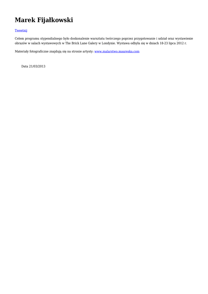 Marek Fijałkowski Tweetnij Celem programu stypendialnego było doskonalenie warsztatu twórczego poprzez przygotowanie i udział oraz wystawienie obrazów w salach wystawowych w The Brick Lane Galery w Londynie. Wystawa odbyła się w dniach 18-23 lipca 2012 r. Materiały fotograficzne znajdują się na stronie artysty: www.malarstwo.maureska.com Data 21/03/2013