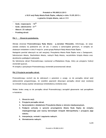 Protokół nr PR.0002.8.2013 z XLIV sesji Rady Miasta Ruda Śląska, odbytej w dniu 15.05.2013 r. w gmachu Urzędu Miasta, sala nr 213 __________________________________________________________________________ · Godz. rozpoczęcia – 1600 · Godz. zakończenia – 2145 · Obecni: 25 radnych · Przebieg obrad: Pkt 1 Otwarcie posiedzenia. Obrady otworzył Przewodniczący Rady Miasta – p.Jarosław Wieszołek, informując, że sesja została zwołana na podstawie art. 20 ust. 3 ustawy o samorządzie gminnym, w związku ze złożonym wnioskiem w dniu 9 maja br. przez grupę Radnych Rady Miasta Ruda Śląska. Następnie powitał obecnych na sali sesyjnej: Prezydenta Miasta Ruda Śląska wraz z Zastępcami, Sekretarzem Miasta, Skarbnikiem Miasta, radnych Rady Miasta, naczelników Urzędu Miasta oraz dyrektorów podległych jednostek. Na Sekretarza obrad Przewodniczący wyznaczył p.Władysława Dryję, który po przyjęciu funkcji stwierdził quorum. W związku z powyższym Przewodniczący stwierdził prawomocność obrad. Pkt 2 Przyjęcie porządku obrad. Przewodniczący zwrócił się do zebranych z pytaniem o uwagi, co do porządku obrad sesji jednocześnie przypominając, że wszelkie poprawki dotyczące porządku obrad sesji zwołanej na wniosek muszą uzyskać akceptację wnioskodawcy zwołanej sesji. Wobec braku uwag co do porządku obrad Przewodniczący zarządził głosowanie nad porządkiem w kształcie: 1. Otwarcie sesji. 2. Przyjęcie porządku obrad. 3. Sprawozdanie z działalności Prezydenta Miasta w okresie międzysesyjnym. 4. Podjęcie uchwały w sprawie przystąpienia Miasta Ruda Śląska do związku międzygminnego pod nazwą Górnośląski Związek Metropolitalny i przyjęcia jego statutu. 5. Interpelacje, wnioski i zapytania radnych. 6. Oświadczenia radnych. 1z28 Protokół nr PR.0002.8.2013 7. Wolne głosy. 8. Sprawy organizacyjne. 9. Zakończenie sesji. Głosowało - 23 radnych ( Wydruk nr 1) Za przyjęciem porządku obrad głosowało - 23 radnych Przeciw - 0 Wstrzymał się - 0. Radny Witold Hanke głosował poprzez podniesienie ręki wyrażając swój głos „za”. Porządek obrad został przyjęty. Pkt 3 Sprawozdanie z działalności Prezydenta Miasta w okresie międzysesyjnym. p.Michał Pierończyk zdał sprawozdanie Prezydenta Miasta z działalności za okres od 25.04.2013 r. do 14.05.2013 r. Sprawozdanie stanowi załącznik do niniejszego protokołu. • Dyskusja p.Marek Wesoły na wstępie swej wypowiedzi pogratulował Pani Prezydent dobrze przygotowanej kampanii reklamowej dot. segregacji odpadów i rozpowszechnianiu wiedzy odnośnie zmiany ustawy o zagospodarowaniu odpadów. Następnie nawiązał do informacji, że miasto zgodnie z procedurą zamówień publicznych „z wolnej ręki” przeznaczyło środki na kampanię informacyjną w kwocie 175 tys. zł spółce Śląskie Media. Sprawdzając tą informację wyszukał rozstrzygnięcie tego zlecenia i w jego uzasadnieniu Prezydent Miasta powołuje się na fakt, że w związku z tym, iż jest nowa sytuacja dotycząca segregacji odpadów należy mieszkańców informować i prowadzić kampanię reklamową, tak by ustawa była dobrze rozumiana i wypełniana przez mieszkańców. To właśnie było celem i inspiracją wydawania Informatora Samorządowego Wiadomościach Rudzkich. Stwierdził, że w grudniu 2012 r. gdy ta procedura została przeprowadzona to wydawało się, że zamysł jest dobry, ale sprawdził kolejne wydania wspomnianego Informatora, który jest wkładka do „WR”. Dodał, że nie ukrywa, iż jest zwolennikiem prywatyzacji spółki Śląskie Media, by nie była dotowana ze strony Urzędu Miasta, by mogła startować w przetargach jako spółka niezależna o ewentualne dotacje i ogłoszenia. Po analizie stwierdził, że taki tygodnik jak Wiadomości Rudzkie, który jest spółką miasta, który ją finansuje powinien wiedzieć, że celem jest ukazywanie wydarzeń miasta. Powinna to spełniać z założenia swego istnienia. Podał przykład Informatora Rudzkiego zajmującego dwie strony Tygodnika gdzie znajdują się informacje o tym, że: Ruda Śląska zaprasza inwestorów, o ambasadorkach biznesu, na temat innowacyjności. Tematy tu poruszane są bardzo ważne, ale o takie informacje powinni zabiegać dziennikarze Wiadomości Rudzkich i powinno to być zwykłą informacją tegoż tygodnika. Pytał dlaczego płacimy po raz drugi za artykuły, które spokojnie 2z28 Protokół nr PR.0002.8.2013 mogły być w normalnym wydaniu Wiadomości Rudzkich. Niestety nie znalazł tutaj informacji na temat segregacji odpadów. Nie rozumie dlaczego powinniśmy wydać 170 tys. na cel, który według niego nie jest strategicznym celem. Uważa, że wydawanie środków na spółkę Śląskie Media, by mogła wykazać przychód nie jest dobrą drogą. Dodał, że zawsze to krytykował i będzie o tym mówił głośno na sesji jak i wśród mieszkańców. Uważa, że jeżeli spółkę stać na to, by rozdawać egzemplarze za darmo mieszkańcom to spokojnie można przystąpić do tematu jej prywatyzacji, bo udźwignie ten ciężar. Ponadto stwierdził, że dzieląc koszt dotacji na 50 numerów w ciągu roku tygodnika „WR” daje kwotę 3.500 zł za jedno wydanie. Na jednej z Komisji radni uzyskali informacje z ust Pani Prezes, że jedna strona reklamy w tygodniku kosztuje 1.400,00 zł. Nie rozumie dlaczego przy wykupie wkładki dwustronicowej ta cena wychodzi wyższa. Nie zrozumiały jest dla niego negocjowanie spraw przez miasto. Zwracając się do Pani Prezydent stwierdził, że miało być „od nowa”, miała być szanowana niezależna prasa, a jest od nowa to samo. Tego miało nie być i dlatego na taką kandydaturę w II turze wyborów prezydenckich zagłosował. Kolejną sprawą, którą poruszył to kwestia poprzetargowej umowy związanej z wywozem śmieci. Uważa, że trzeba na forum Rady dyskutować na temat wyników przetargów, jakie zostały kwoty uchwalone. Uważa, że w tym celu powinna być zwoł
