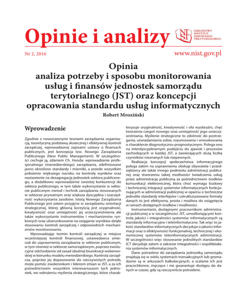 Opinie i analizy www.nist.gov.pl Nr 2, 2016 Opinia analiza potrzeby i sposobu monitorowania usług i finansów jednostek samorządu terytorialnego (JST) oraz koncepcji opracowania standardu usług informatycznych Robert Mroziński Wprowadzenie Zgodnie z nowoczesnymi teoriami zarządzania organizacją, teoretyczną podstawą skutecznej i efektywnej kontroli zarządczej, wprowadzonej zapisami ustawy o finansach publicznych, jest koncepcja tzw. Nowego Zarządzania Publicznego (New Public Management). W szczególności cechuje ją, zdaniem Ch. Hooda: wprowadzenie profesjonalnego (menedżerskiego) zarządzania, zdefiniowane jasno określone standardy i mierniki, a przede wszystkim położenie większego nacisku na kontrolę wyników oraz nastawienie na dezagregację jednostek sektora publicznego, a dodatkowo wprowadzenie swoistej konkurencji do sektora publicznego, w tym także wykorzystanie w sektorze publicznym metod i technik zarządzania stosowanych w sektorze prywatnym oraz większa dyscyplina i oszczędność wykorzystania zasobów. Istotą Nowego Zarządzania Publicznego jest zatem przyjęcie w zarządzaniu orientacji strategicznej, której główną korzyścią jest oryginalność, kreatywność oraz umiejętność jej urzeczywistnienia ale także wykorzystanie instrumentów i mechanizmów rynkowych oraz ukierunkowanie na osiąganie wyników dzięki stosowaniu kontroli zarządczej i odpowiednich mechanizmów monitorowania. Wprowadzając termin kontroli zarządczej w miejsce wcześniejszej kontroli finansowej, ustawodawca zmierzał do usprawnienia zarządzania w sektorze publicznym, w tym również w sektorze samorządowym, poprzez ewolucyjne odchodzenie od zasad idealnej biurokracji weberowskiej w kierunku modelu menedżerskiego. Kontrola zarządcza, poprzez jej dopasowanie do rzeczywistych potrzeb, może pomóc zwolennikom i liderom zmian w JST, a za ich pośrednictwem wszystkim interesariuszom tych jednostek, we wdrożeniu myślenia strategicznego, które charak- teryzuje oryginalność, kreatywność i siła wyobraźni, chęć tworzenia czegoś nowego oraz umiejętność jego urzeczywistniania. Myślenie strategiczne to zdolność do postrzegania, uświadamiania sobie, rozumowania i wnioskowania o charakterze diagnostyczno-prognostycznym. Polega ono na interdyscyplinarnym podejściu do zjawisk i procesów zachodzących w każdej JST, a zawierających dużą liczbę czynników nieznanych lub niepewnych. Realizacja koncepcji społeczeństwa informacyjnego polega zatem na usprawnieniu obsługi obywatela i przedsiębiorcy ale także innego podmiotu administracji publicznej oraz stworzeniu takiej możliwości świadczenia usług przez administrację publiczną za pośrednictwem środków komunikacji elektronicznej, która choć wymaga budowy i technicznej integracji systemów informatycznych funkcjonujących w administracji publicznej w oparciu o techniczne jednolite standardy interfejsów i ustrukturyzowane formaty danych to jest efektywna, prosta i możliwa do osiągnięcia w ramach dostępnych środków i możliwości. Instrumentami, dostępnymi pracownikom administracji publicznej a w szczególności JST, umożliwiającymi kontrolę jakości i integralności systemów informatycznych są standardy informacyjne i teleinformatyczne. Tak więc to jakość standardów informatycznych decyduje o jakości informacji oraz o efektywności funkcjonalnej, technicznej i ekonomicznej systemów teleinformatycznych administracji. W szczególności więc stosowanie jednolitych standardów ICT decyduje zatem o zakresie integralności i współdziałania systemów informatycznych. Dane potrzebne do zarządzania jednostką samorządu znajdują się w wielu systemach transakcyjnych lub gromadzone są w arkuszach kalkulacyjnych, a scalanie ich jest pracochłonne, męczące i nie gwarantuje dostępu do danych w czasie, gdy są rzeczywiście potrzebne. Opinie i analizy Nr 2, 2016 Przed wejściem w życie ustawy o informatyzacji działalności podmiotów realizujących zadania publiczne (u.i.d.p) i odpowiednich rozporządzeń urzędy jednostek samorządu terytorialnego wdrażając rozwiązania informatyczne samodzielnie próbowały stawić czoła wielu problemom związanym z wyborem odpowiednich formatów i systemów, które bardzo często były niekompatybilne i nie dawały możliwości zintegrowania z innymi systemami funkcjonującymi nie tylko na szczeblu rządowym, ale również w ramach tego samego urzędu. Takie zdecentralizowane podejście, niekoordynowane w skali krajowej i regionalnej powodowało powstawanie swoistych „wysp informatyzacji”. Praktyka pokazuje również, że informatyzacja w samorządach polegała często na narzucaniu poszczególnym szczeblom gotowych rozwiązań technologicznych, a nie na wymianie danych na podstawie powszechnych standardów wymiany danych i interoperacyjności systemów. Lokalni decydenci często stawiani są w sytuacji wprowadzania odgórnie narzuconych systemów i rozwiązań często niebiorących pod uwagę lokalnej specyfiki bądź wykorzystywanych od lat rozwiązań. Osiągnięcie takiego stanu będzie możliwe wyłącznie w sytuacji: • ścisłego organizacyjnego i koncepcyjno-technicznego współdziałania administracji rządowej i samorządowej, którego odzwierciedleniem jest Linia Współpracy, • uzgodnienia ram architektonicznych stymulujących modernizację, wspólnej dla rządu i samorządu, infrastruktury informacyjnej, z jasno określonym miejscem i rolą takich projektów • realizacji analizy i ponownego zdefiniowania procesów i procedur administracyjnych pod kątem wykorzystania nowych możliwości technologii informatycznych, • kontynuacji prac tworzących podstawy do zarządzania referencyjnością i interoperacyjnością w ramach wspólnej infrastruktury informacyjnej państwa, • włączenia się do współpracy gestorów najważniejszych obecnie realizowanych systemów, wymagających jednocześnie współdziałania z systemami 