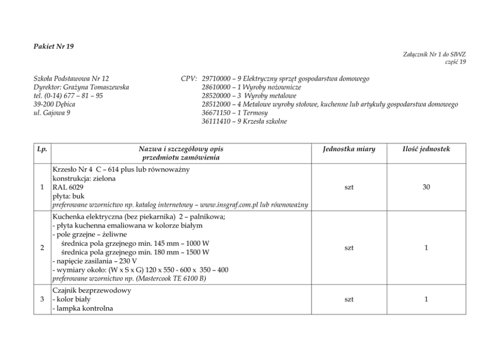Pakiet Nr 19 Załącznik Nr 1 do SIWZ część 19 Szkoła Podstawowa Nr 12 Dyrektor: Grażyna Tomaszewska tel. (0-14) 677 – 81 – 95 39-200 Dębica ul. Gajowa 9 CPV: 29710000 – 9 Elektryczny sprzęt gospodarstwa domowego 28610000 – 1 Wyroby nożownicze 28520000 – 3 Wyroby metalowe 28512000 – 4 Metalowe wyroby stołowe, kuchenne lub artykuły gospodarstwa domowego 36671150 – 1 Termosy 36111410 – 9 Krzesła szkolne Nazwa i szczegółowy opis przedmiotu zamówienia Jednostka miary Ilość jednostek 1 Krzesło Nr 4 C – 614 plus lub równoważny konstrukcja: zielona RAL 6029 płyta: buk preferowane wzornictwo np. katalog internetowy – www.insgraf.com.pl lub równoważny szt 30 2 Kuchenka elektryczna (bez piekarnika) 2 – palnikowa; - płyta kuchenna emaliowana w kolorze białym - pole grzejne – żeliwne średnica pola grzejnego min. 145 mm – 1000 W średnica pola grzejnego min. 180 mm – 1500 W - napięcie zasilania – 230 V - wymiary około: (W x S x G) 120 x 550 - 600 x 350 – 400 preferowane wzornictwo np. (Mastercook TE 6100 B) szt 1 3 Czajnik bezprzewodowy - kolor biały - lampka kontrolna szt 1 Lp. Lp. Nazwa i szczegółowy opis przedmiotu zamówienia Jednostka miary Ilość jednostek - dwustronny wskaźnik poziomu wody - bezpieczeństwo: automatyczne wyłączanie po zagotowaniu i przy braku wody - nylonowy filtr antywapniowy preferowane wzornictwo np. Basic 1,5 L - Philips HD 4646 lub równoważny 4 Termos stalowy z przyciskiem (wkład stalowy) – 1,5 L np. katalog STALGAST 1/2007 (nr kat. 382150) lub równoważny szt 1 5 Nóż do krojenia – dł. około 17 - 18 cm - ostrze noża wykonane ze stali nierdzewnej - można myć w zmywarkach przemysłowych i wyparzać np. katalog STALGAST 1/2007 lub równoważny szt 1 6 Obrus plamoodporny kolor – biały Wymiary: 180 x 120 szt 3