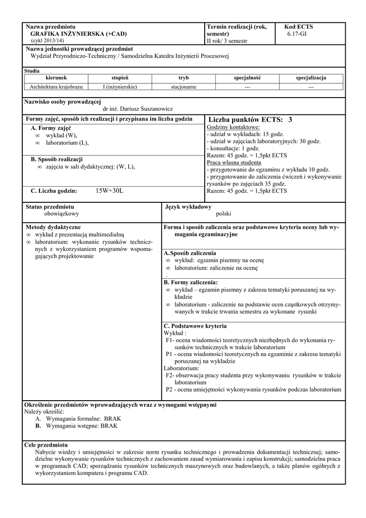Nazwa przedmiotu GRAFIKA INŻYNIERSKA (+CAD) Termin realizacji (rok, semestr) II rok/ 3 semestr (cykl 2013/14) Kod ECTS 6.17-GI Nazwa jednostki prowadzącej przedmiot Wydział Przyrodniczo-Techniczny / Samodzielna Katedra Inżynierii Procesowej Studia kierunek stopień tryb specjalność specjalizacja Architektura krajobrazu I (inżynierskie) stacjonarne --- --- Nazwisko osoby prowadzącej dr inż. Dariusz Suszanowicz Formy zajęć, sposób ich realizacji i przypisana im liczba godzin A. Formy zajęć • wykład (W), • laboratorium (L), B. Sposób realizacji • zajęcia w sali dydaktycznej: (W, L), C. Liczba godzin: 15W+30L Liczba punktów ECTS: 3 Godziny kontaktowe: - udział w wykładach: 15 godz. - udział w zajęciach laboratoryjnych: 30 godz. - konsultacje: 1 godz. Razem: 45 godz. = 1,5pkt ECTS Praca własna studenta - przygotowanie do egzaminu z wykładu 10 godz. - przygotowanie do zaliczenia ćwiczeń i wykonywanie rysunków po zajęciach 35 godz. Razem: 45 godz. = 1,5pkt ECTS Status przedmiotu obowiązkowy Język wykładowy Metody dydaktyczne • wykład z prezentacją multimedialną • laboratorium: wykonanie rysunków technicznych z wykorzystaniem programów wspomagających projektowanie Forma i sposób zaliczenia oraz podstawowe kryteria oceny lub wymagania egzaminacyjne polski A. Sposób zaliczenia • wykład: egzamin pisemny na ocenę • laboratorium: zaliczenie na ocenę . B. Formy zaliczenia: • wykład – egzamin pisemny z zakresu tematyki poruszanej na wykładzie • laboratorium - zaliczenie na podstawie ocen cząstkowych otrzymywanych w trakcie trwania semestru za wykonane rysunki C. Podstawowe kryteria Wykład : F1- ocena wiadomości teoretycznych niezbędnych do wykonania rysunków technicznych w trakcie laboratorium P1 - ocena wiadomości teoretycznych na egzaminie z zakresu tematyki poruszanej na wykładzie Laboratorium: F2- obserwacja pracy studenta przy wykonywaniu rysunków w trakcie laboratorium P2 - ocena umiejętności wykonywania rysunków podczas laboratorium Określenie przedmiotów wprowadzających wraz z wymogami wstępnymi Należy określić: A. Wymagania formalne: BRAK B. Wymagania wstępne: BRAK Cele przedmiotu Nabycie wiedzy i umiejętności w zakresie norm rysunku technicznego i prowadzenia dokumentacji technicznej; samodzielne wykonywanie rysunków technicznych z zachowaniem zasad wymiarowania i zapisu konstrukcji; samodzielna praca w programach CAD; sporządzanie rysunków technicznych maszynowych oraz budowlanych, a także planów ogólnych z wykorzystaniem komputera i programu CAD. Treści programowe A. Problematyka wykładu: Ogólna charakterystyka rysunku technicznego. Normy rysunku technicznego. Zasady wymiarowania obiektów i elementów na rysunkach. Charakterystyka rysunku technicznego budowlanego. Podstawy zapisu grafiki w systemach komputerowych. Wykorzystanie programów CAD (Computer Aided Design) w opracowaniu dokumentacji technicznej. Interfejs graficzny i podstawowe narzędzia programów CAD. B. Problematyka laboratorium : Wykreślenie i wymiarowanie w rzutach elementu z modelu. Wykorzystanie aksonometrii do sporządzania szkiców odręcznych. Wykreślenie i wymiarowanie przekroju brył z modelu. Wykreślenie i wymiarowanie w rzutach brył danych rysunkiem w programie CAD. Kreślenie rysunku wykonawczego części maszyny z modelu z wykorzystaniem komputera i programy CAD. Sporządzanie planów ogólnych terenu wspomagane programami CAD. Tworzenie grafiki 3D w programach CAD. Wykaz literatury A. Literatura wymagana do ostatecznego zaliczenia zajęć: A.1. Dobrzański J.: Rysunek techniczny maszynowy. WNT, Warszawa, 2007, A.2. Januszewski B., Bieniasz J.: Geometryczne podstawy grafiki inżynierskiej. Cz. I-II. P.Rz., Rzeszów 2004-2005, A.3. PN-EN ISO 5456: 2002. Rysunek techniczny. Metody rzutowania, A.4. Wojcieszek S., Bricscad V8. Ćwiczenia rysunkowe dla początkujących, PWN, Warszawa 2008. B. Literatura uzupełniająca B.1. Przewłocki S., Geometria wykreślna w budownictwie. Arkady, Warszawa 1997 Odniesienie do efektów kształcenia dla kierunku Efekty kształcenia. Po ukończeniu studiów student/studentka: AK1A_W03 Wiedza wymienia podstawowe zasady i unormowania z zakresu rysunku technicznego, przydatne w opisie i interpretacji rozwiązania zadania projektowego z uwzględnieniem danych empirycznych AK1A_W03 wyjaśnia i omawia definicje i pojęcia z zakresu zapisu konstrukcji i grafiki inżynierskiej AK1A_W08 AK1A_W10 wyjaśnia podstawy wykorzystania programów komputerowych (CAD) w opracowaniu graficznym AK1A_U02 AK1A_U04 Umiejętności potrafi stosować metody zapisu konstrukcji, rzutowania prostokątnego i aksonometrycznego przy sporządzaniu rysunków technicznych maszynowych i budowlanych AK1A_U15 samodzielnie rysuje rysunki techniczne oraz plany ogólne terenu z wykorzystaniem zasad wymiarowania AK1A_U04 AK1A_U07 samodzielnie sporządza rysunki techniczne architektoniczno-budowlane oraz konstrukcyjne w programie CAD AK1A_U17 czyta ze zrozumieniem dokumentację techniczną oraz poprawnie wnioskuje AK1A_K01 Kompetencje społeczne (postawy) uaktualnia samodzielnie swoją wiedzę i umiejętności kognitywne oraz zawodowe zachowując krytyczną postawę i skłonność do weryfikowania pozyskiwanych informacji AK1A_K02 stosuje opanowane wiadomości i umiejętności inżynierskie w sytuacjach opartych na prostych analogiach oraz w sytuacjach problemowych, kojarząc poznane fakty i stawiając hipotezy oraz formułując własne argumenty przemawiające za ich słusznością AK1A_K03 dobiera odpowiednie konstrukcje budowlane harmonizujące z krajobrazem i wymogami technologii tradycyjnych Kontakt [email protected] tel. (77)4016690