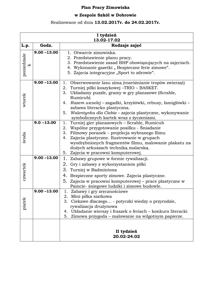 Plan Pracy Zimowiska w Zespole Szkół w Dobrowie Realizowane od dnia 13.02.2017r. do 24.02.2017r. poniedziałe k L.p. Godz. 9.00 –13.00 wtorek 9.00 –13.00 środa 9.0 –13.00 czwartek 9.00 –13.00 9.00 –13.00 piątek I tydzień 13.02-17.02 Rodzaje zajęć 1. 2. 3. 4. 5. Otwarcie zimowiska. Przedstawienie planu pracy. Przedstawienie zasad BHP obowiązujących na zajęciach. Wykonanie gazetki „ Bezpieczne ferie zimowe”. Zajęcia integracyjne „Sport to zdrowie”. 1. Obserwowanie lasu zimą (rozróżnianie tropów zwierząt) 2. Turniej piłki koszykowej –TRIO – BASKET. 3. Układamy puzzle, gramy w gry planszowe (Scrable, Rumicub) 4. Razem weselej – zagadki, krzyżówki, rebusy, łamigłówki – zabawa literacko plastyczna. 5. Walentynka dla Ciebie – zajęcia plastyczne, wykonywanie symbolicznych kartek wraz z życzeniami. 1. Turniej gier planszowych – Scrable, Rumicub 2. Wspólne przygotowanie posiłku - Śniadanie 3. Filmowy poranek – projekcja wybranego filmu 4. Zajęcia plastyczne. Ilustrowanie w grupach wyodrębnionych fragmentów filmu, malowanie plakatu na dużych arkuszach techniką malarską. 5. Zajęcia w pracowni komputerowej. 1. Zabawy grupowe w formie rywalizacji. 2. Gry i zabawy z wykorzystaniem piłki 3. Turniej w Badmintona 4. Bezpieczne sporty zimowe. Zajęcia plastyczne. 5. Zajęcia w pracowni komputerowej – prace plastyczne w Paincie- śniegowe ludziki i zimowe budowle. 1. Zabawy i gry zręcznościowe 2. Mini piłka siatkowa 3. Ciekawe dlaczego… - potyczki wiedzy o przyrodzie, rywalizacja drużynowa 4. Układanie wierszy i fraszek o feriach – konkurs literacki 5. Zimowa przygoda – malowanie na wilgotnym papierze. II tydzień 20.02-24.02 9.00 –13.00 1. Z zimą za pan brat (wyjście w teren, pogadanka na temat poniedziałek 2. 3. 4. 5. 9.0 –13.00 1. wtorek 2. 3. 4. 9.00- 13.00 5. 1. 2. środa 3. 4. czwartek 9.00- 13.00 5. 1. 2. 3. 4. 5. piątek 9.00- 13.00 zdrowia) Eko zabawy dla małych i dużych – zajęcia twórcze, pozwalające ciekawie i mądrze wykorzystać materiały recyklingowe, zabawy ruchowe, słowne i towarzyskie Wybrane gry zespołowe Rytmy i rymy – zajęcia literackie – rozwijanie zdolności twórczych, próby samodzielnego układania wierszyków (np. o swoim imieniu, przyjacielu, ulubionej maskotce) Zajęcia komputerowe. Olimpiada zimowa - zajęcia sportowe - gry i zabawy integracyjne, Wyścigi rzędów z zadaniem dodatkowym- aktywne formy ćwiczeń. Aerobik pod hasłem „Taniec to sposób na nudę” Robótki na różne okazje – zajęcia plastyczne inspirujące dzieci do tworzenia własnych projektów, wzorów, pozwalające wykonać niepowtarzalne rzeczy Projekcja filmu. Dzień życzliwości – scenki, warsztaty Wyścigi rzędów z zadaniem dodatkowym - aktywne formy ćwiczeń Nuda nie ma szans – zajęcia plastyczne, rebusy, zagadki, kalambury Bajkowe stwory, a nawet potwory – papierowe fantazje, zabawy twórczo – plastyczne z gazetami, zajęcia z papieroplastyki, sztuka składania papieru Zajęcia komputerowe. Dzień uśmiechu – wierszyki, rymowanki Mistrz głośnego czytania – konkurs na najlepiej przeczytany tekst literacki i wykonanie ilustracji do przeczytanego wiersza. Teksty A. Frączek, M. Konopnickiej, J. Tuwima i J. Brzechwy Pudełkowe stwory – konkurs plastyczny na wykonanie najbardziej oryginalnej postaci stworzonej z kolorowych pudełek, bibuły i kartonu Zajęcia sportowe Zabawy kulinarne – pieczenie pączków. 1. Dzień gier planszowych- zadania drużynowe z wylosowanych dziedzin wiedzy, zawody w układaniu puzzli na czas, kalambury, rozgrywki szachowe, gry planszowe warcaby, chińczyk, memo, rozwijanie wyobraźni- tworzymy własną grę planszową. 2. Wspomnienia pełne atrakcji z zimowych wakacji – wspólne tworzenie plastycznej wersji lokomotywy, której wagony mieszczą najpiękniejsze wspomnienia z zimowego wypoczynku, praca plastyczna wszystkich uczestników zabawy 3. Podsumowanie zimowiska 4. Rozdanie nagród i dyplomów.