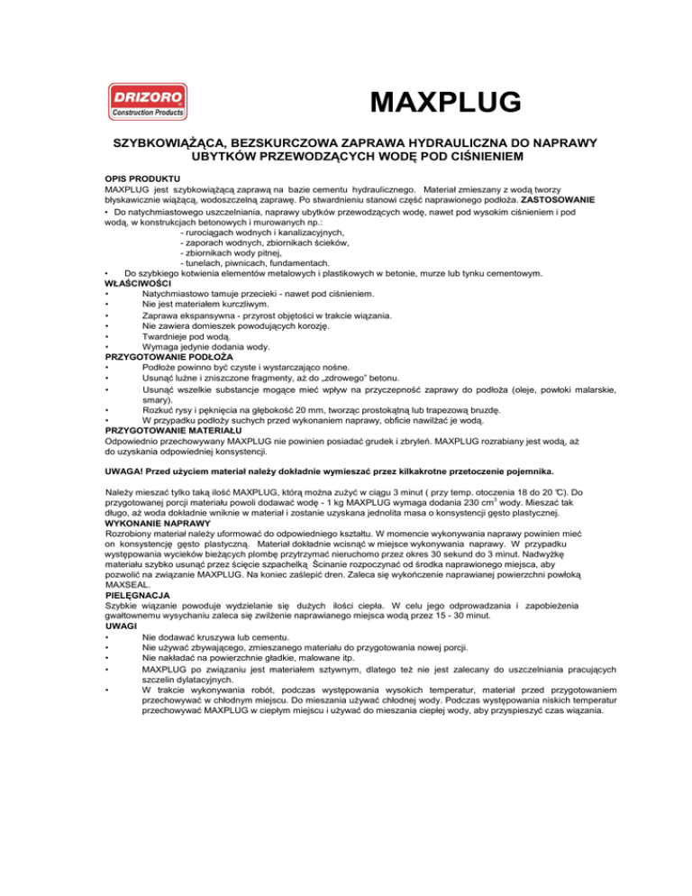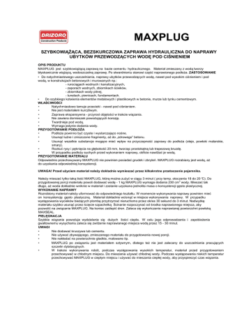 MAXPLUG SZYBKOWIĄśĄCA, BEZSKURCZOWA ZAPRAWA HYDRAULICZNA DO NAPRAWY UBYTKÓW PRZEWODZĄCYCH WODĘ POD CIŚNIENIEM OPIS PRODUKTU MAXPLUG jest szybkowiąŜącą zaprawą na bazie cementu hydraulicznego. Materiał zmieszany z wodą tworzy błyskawicznie wiąŜącą, wodoszczelną zaprawę. Po stwardnieniu stanowi część naprawionego podłoŜa. ZASTOSOWANIE • Do natychmiastowego uszczelniania, naprawy ubytków przewodzących wodę, nawet pod wysokim ciśnieniem i pod wodą, w konstrukcjach betonowych i murowanych np.: - rurociągach wodnych i kanalizacyjnych, - zaporach wodnych, zbiornikach ścieków, - zbiornikach wody pitnej, - tunelach, piwnicach, fundamentach. • Do szybkiego kotwienia elementów metalowych i plastikowych w betonie, murze lub tynku cementowym. WŁAŚCIWOŚCI • Natychmiastowo tamuje przecieki - nawet pod ciśnieniem. • Nie jest materiałem kurczliwym. • Zaprawa ekspansywna - przyrost objętości w trakcie wiązania. • Nie zawiera domieszek powodujących korozję. • Twardnieje pod wodą. • Wymaga jedynie dodania wody. PRZYGOTOWANIE PODŁOśA • PodłoŜe powinno być czyste i wystarczająco nośne. • Usunąć luźne i zniszczone fragmenty, aŜ do „zdrowego” betonu. • Usunąć wszelkie substancje mogące mieć wpływ na przyczepność zaprawy do podłoŜa (oleje, powłoki malarskie, smary). • Rozkuć rysy i pęknięcia na głębokość 20 mm, tworząc prostokątną lub trapezową bruzdę. • W przypadku podłoŜy suchych przed wykonaniem naprawy, obficie nawilŜać je wodą. PRZYGOTOWANIE MATERIAŁU Odpowiednio przechowywany MAXPLUG nie powinien posiadać grudek i zbryleń. MAXPLUG rozrabiany jest wodą, aŜ do uzyskania odpowiedniej konsystencji. UWAGA! Przed uŜyciem materiał naleŜy dokładnie wymieszać przez kilkakrotne przetoczenie pojemnika. NaleŜy mieszać tylko taką ilość MAXPLUG, którą moŜna zuŜyć w ciągu 3 minut ( przy temp. otoczenia 18 do 20 °C). Do przygotowanej porcji materiału powoli dodawać wodę - 1 kg MAXPLUG wymaga dodania 230 cm3 wody. Mieszać tak długo, aŜ woda dokładnie wniknie w materiał i zostanie uzyskana jednolita masa o konsystencji gęsto plastycznej. WYKONANIE NAPRAWY Rozrobiony materiał naleŜy uformować do odpowiedniego kształtu. W momencie wykonywania naprawy powinien mieć on konsystencję gęsto plastyczną. Materiał dokładnie wcisnąć w miejsce wykonywania naprawy. W przypadku występowania wycieków bieŜących plombę przytrzymać nieruchomo przez okres 30 sekund do 3 minut. NadwyŜkę materiału szybko usunąć przez ścięcie szpachelką Ścinanie rozpoczynać od środka naprawionego miejsca, aby pozwolić na związanie MAXPLUG. Na koniec zaślepić dren. Zaleca się wykończenie naprawianej powierzchni powłoką MAXSEAL. PIELĘGNACJA Szybkie wiązanie powoduje wydzielanie się duŜych ilości ciepła. W celu jego odprowadzania i zapobieŜenia gwałtownemu wysychaniu zaleca się zwilŜenie naprawianego miejsca wodą przez 15 - 30 minut. UWAGI • Nie dodawać kruszywa lub cementu. • Nie uŜywać zbywającego, zmieszanego materiału do przygotowania nowej porcji. • Nie nakładać na powierzchnie gładkie, malowane itp. • MAXPLUG po związaniu jest materiałem sztywnym, dlatego teŜ nie jest zalecany do uszczelniania pracujących szczelin dylatacyjnych. • W trakcie wykonywania robót, podczas występowania wysokich temperatur, materiał przed przygotowaniem przechowywać w chłodnym miejscu. Do mieszania uŜywać chłodnej wody. Podczas występowania niskich temperatur przechowywać MAXPLUG w ciepłym miejscu i uŜywać do mieszania ciepłej wody, aby przyspieszyć czas wiązania. DANE TECHNICZNE • Przydatność zaprawy do uŜycia • Wytrzymałość na zginanie po 28 dniach • Wydajność • Przyczepność do podłoŜa • Wytrzymałość na ściskanie po 28 dniach Dane dotyczą warunków normatywnych OPAKOWANIE MAGAZYNOWANIE : 3,5 do 4 min : 5,6 MPa 3 : 1 kg MAXPLUG wypełnia w przybliŜeniu 615 do 620 cm : 0,69 MPa : 40,7 MPa temp 20°C wilgotność względna 65% Wiadra 1 kg, 5 kg i 25 kg Przechowywać w suchych pomieszczeniach. Przydatny do uŜycia przez 1 rok. OPINIE I APROBATY • Ocena Higieniczna PZH – W/155/92 • Aprobata Techniczna ITB Nr AT – 15-2186/96 + Aneks Nr 3 BHP Jak wszystkie produkty cementowe, MAXPLUG ma właściwości ścierne i w trakcie prac naleŜy uŜywać gumowych rękawic ochronnych. Jeśli materiał dostanie się do oczu naleŜy je starannie przepłukać czysta wodą, lecz nie trzeć. Jeśli podraŜnienie utrzymuje się, naleŜy zwrócić się do lekarza. GWARANCJA Wszystkie produkty firmy DRIZORO wytwarzane są z najlepszych, dostępnych surowców, co zapewnia ich wysoką jakość. Nasza gwarancja dotyczy jakości produktu, a nie jego zastosowania poza naszą kontrolą. Za wszelkie uŜycie produktów do celów nie określonych w tym biuletynie, firma nie ponosi odpowiedzialności. Wartość gwarancji nie moŜe przewyŜszać wartości nabytego produktu. UWAGA Wraz z ukazaniem się tej instrukcji technicznej wszelkie wcześniejsze publikacje techniczne dotyczące produktu tracą swą waŜność.