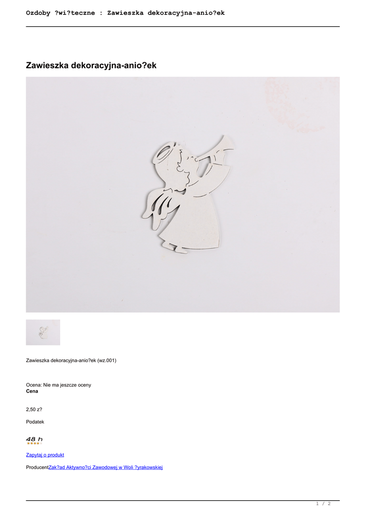 Ozdoby ?wi?teczne : Zawieszka dekoracyjna-anio?ek Zawieszka dekoracyjna-anio?ek Zawieszka dekoracyjna-anio?ek (wz.001) Ocena: Nie ma jeszcze oceny Cena 2,50 z? Podatek Zapytaj o produkt ProducentZak?ad Aktywno?ci Zawodowej w Woli ?yrakowskiej 1 / 2 Ozdoby ?wi?teczne : Zawieszka dekoracyjna-anio?ek Opis Zawieszka dekoracyjna wykonana ze sklejki 0,3 mm, malowana farbami akrylowymi. wys. 8,5 cm, szer. 5,5 cm. Opinie Nikt jeszcze nie recenzowa? tego produktu. 2 / 2 Powered by TCPDF (www.tcpdf.org)