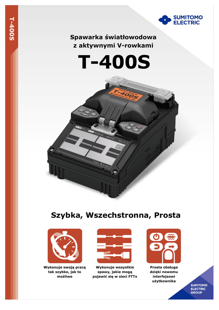 T-400S Spawarka światłowodowa z aktywnymi V-rowkami Szybka, Wszechstronna, Prosta Wykonuje swoją pracę tak szybko, jak to możliwe Wykonuje wszystkie spawy, jakie mogą pojawić się w sieci FTTx Prosta obsługa dzięki nowemu interfejsowi użytkownika Specyfikacja Funkcjonalności T-400S Szkło krzemowe Jednowłóknowe / SMF(G.652), MMF(G.651), DSF(G.653), NZDSF(G.655), BIF(G.657) Średnica płaszcza: 125μm, Coating diameter : Up to 3mm by multi clamp 5 do 16mm dla pojedynczego włókna, 8mm dla kabla dropowego SMF : 0.03dB, MMF : 0.01dB, DSF : 0.05dB, NZDSF : 0.05dB 60dB lub większa 7 s (SM G652 Quick Mode) Standardowa 24 s (dla osłonki FPS-61-2.6, w trybie S60mm 0.25) wydajność Około 200 (BU-15) 2 kamery CMOS, maksymalnie 200X 1.96 ~ 2.09N 60mm, 40mm & osłonki Sumitomo Nano Maks. 150, 11 predefioniowanych, 100 edytowalnych przez użytkownika (39 do zdefiniowania) Programy Maks. 50, 11 predefioniowanych, 20 edytowalnych przez użytkownika (19 do zdefiniowania) 100 obrazów / 10,000 danych spawów (tylko w pamięci wewnętrznej) Spawania / Wygrzywanie Funkcje W standardzie, dostosowane do płaszcza 250, 900μm, 2 i 3mm oraz prostokątnego kabla dropowego Wbudowany Automatyczna kompensacja warunków środowiska zewnętrznego 129(Szer.) x 195(Dł.) x 99(Wys.) mm (bez nóżek) Rozmiar / Waga 1.2kg (bez baterii), 1.3kg (z baterią BU-15 ) Kolorowy wyświetlacz LCD 4.3" USB 2.0 (mini-B type) Porty AC 100 ~ 240V, 50/60Hz (ADC-15) Zasilanie DC 10 ~ 15V Litowo-ionowa 10.8V, 35.64Wh (BU-15) Wysokość: 0 ~ 5,000m, Temperatura : -10 ~ +50°C, Wilgotność: 0 ~ 95%RH (nieskondensowana), Warunki pracy Osłona wiatrowa: do 15m/s Warunki magazynowania Temperatura: -40 ~ +80°C, Wilgotność : 0 ~ 95%RH (nieskondesowana), Bateria: -20 ~ +30°C (długoterminowo) Żywotność elektrod *3 6,000 wyładowań łuku Aktualizacja oprogramowania Darmowa, przez Internet *1 : Średnia wartość tłumienia spawdzana w temperaturze pokojowej dla włókien Sumitomo. Zmierzona metdową cut-back odpowiada standardom ITU-T oraz IEC. *2 : Ilość cykli spawania i wygrzewania jest zależna od warunków środowowiskowych i stanu baterii *3 : Osiągnięto w warunkach laboratoryjnych. Żywotność elektrod może zmieniać się w zależności od warunków śreodowiska oraz rodzajów spawanych włókien. Wymagania dla włókien optycznych Materiał Rodzaj i profil włókien Średnica włókien Długość cięcia Stratność spawu (typowo)*1 Straty odbiciowe (typowo) Czas spawania (typowo) Czas wygrzewania (typowo) Ilość cykli spawania i wygrzewania *2 Widok włókna i powiększenie Test naciągu Dostępne osłonki spawu Programy spawania Programy wygrzewania Przechwytywani obrazu spawu / danych spawu Auto-start Wielodociskowy holder Zamek piecyka do spawania SOC Automatyczna kalibracja łuku Rozmiar Waga Ekran portUSB AC input DC input Battery pack Odporność na warunki zewnętrzne* Wstrząsoodporność Odporność na zapylenie Szczgóły testu Upadek z 76cm na przednią świankę Równoważne do IPx1 Nazwa części Działa prawidłowo nawet po teście pionowo kapiącej wody z prędkością 1mm/min przez 10 min Równoważna do IP5x Działa prawidłowo po 8 h w komorze testowej z unoszącymi się drobinkami kurzu o wymiarach nie większych niż 75μm. *Potwierdzono poprawność działania bateri podczas badań w Sumitomo. Nie gwarantuje, że produkt jest wolny od wad i uszkodzeń. Ilość 1 szt. 1 szt. 1 szt. 1 szt. 1 szt. Akcesoria dodatkowe Podstawowe akcesoria Nazwa części Symbol adapter AC ADC-15 Przewód zasilający AC PC-AC<X>*-2P Akumulator BU-15 Skrócona instrukcja obsługi — Walizka transportowa CC-15 *X=2 (USA), 3(EU), 4(JP), 6(AUS), 8(CHINA) Powyższe akcesoria wchodzą w skład podstawowego zestawu spawarki. Niektóre dodatkowe akesoria mogą lub nie być dodane do zestawu. Zawartość zestawu możę różnić się w zależności od regionu i kraju. Zapytaj dostawcę o szczegóły. Symbol Uwagi FHS-025/LB5 Dla 0,9 mm luźnej tuby w pojedynczym włóknem FHS-SOC Uchwyt do złączy SOC Akumulator BU-15 Litowo-ionowa 10.8V, 35.64Wh Dla prac wewnętrz pojazdów Kabel do zapalniczki samoch. PC-V25 (uniwersalne gniazdo zapalniczki) Szczoteczka do czyszczenia V-rowków VGT-2 Pędzelek do czyszczenia V-rowków Elektrody ER-10 — Stolik roboczy WT-15 stolik z paskiem na szyję FC-5S Gilotyna stołowa FC-6S-C Gilotyna stołowa wysokiej precyzji cięcia Gilotyna FC-6RS-C Gilotyna z automatycznym ostrzem Poręczna gilotyna z obrotowym ostrzem FC-8R-FC i licznikiem Automatyczna gilotyna Poręczna gilotyna z obrotowym ostrzem FC-8R-F (bez licznika) Stripper JR-M03 Striper do pojedynczych włókien Stripper do luźnej tuby LTC-01 — Dyspenser z alkoholem HR-3 — FPS-1 60mm, średnica po wygrzaniu ok. 3.2mm Termokurczliwe osłonki FPS-40 40mm, średnica po wygrzaniu ok. 3.2mm spawów FPS-61-2.6 61mm, średnica po wygrzaniu ok. 2.6mm FPS-D60 60mm, dla kabli dropowych i wewnętrznych Uchwyt do włókien Dla spawarki Odporność na wodę Akcesoria Walizka transportowa Gilotyna stołowa Akumulator Adapter AC Uchwyt do złączy SOC Elektrody CC-15 FC-5S BU-15 ADC-15 FHS-SOC ER-10 Rate ART PHU Strona: www.rateart.pl tel.: (42) 235 70 88 E-mail: [email protected]