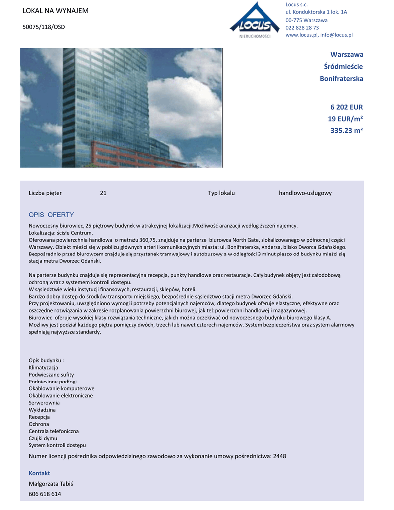 Locus s.c. ul. Konduktorska 1 lok. 1A 00-775 Warszawa 022 828 28 73 www.locus.pl, [email protected] LOKAL NA WYNAJEM 50075/118/OSD Warszawa _ƌſĚŵŝĞƑĐŝĞ Bonifraterska 6 202 EUR 19 EUR/m² 335.23 m² >ŝĐnjďĂƉŝħƚĞƌ 21 Typ lokalu ŚĂŶĚůŽǁŽͲƵƐųƵŐŽǁLJ OPIS OFERTY Nowoczesny biurowiec, 25ƉŝħƚƌŽǁLJďƵĚLJŶĞŬǁĂƚƌĂŬĐLJũŶĞũůŽŬĂůŝnjĂĐũŝ͘DŽǏůŝǁŽƑđĂƌĂŶǏĂĐũŝǁĞĚųƵŐǏLJĐnjĞŷŶĂũĞŵĐLJ͘ >ŽŬĂůŝnjĂĐũĂ͗ƑĐŝƐųĞĞŶƚƌƵŵ͘ KĨĞƌŽǁĂŶĂƉŽǁŝĞƌnjĐŚŶŝĂŚĂŶĚůŽǁĂŽŵĞƚƌĂǏƵ360,75͕njŶĂũĚƵũĞŶĂƉĂƌƚĞƌnjĞďŝƵƌŽǁĐĂEŽƌƚŚ'ĂƚĞ͕njůŽŬĂůŝnjŽǁĂŶĞŐŽǁƉſųŶŽĐŶĞũĐnjħƑĐŝ tĂƌƐnjĂǁLJ͘KďŝĞŬƚŵŝĞƑĐŝƐŝħǁƉŽďůŝǏƵŐųſǁŶLJĐŚĂƌƚĞƌŝŝŬŽŵƵŶŝŬĂĐLJũŶLJĐŚŵŝĂƐƚĂ͗Ƶů͘ŽŶŝĨƌĂƚĞƌƐŬĂ͕ŶĚĞƌƐĂ͕ďůŝƐŬŽǁŽƌĐĂ'ĚĂŷƐŬŝĞŐŽ͘ ĞnjƉŽƑƌĞĚŶŝŽƉƌnjĞĚďŝƵƌŽǁĐĞŵnjŶĂũĚƵũĞƐŝħƉƌnjLJƐƚĂŶĞŬƚƌĂŵǁĂũŽǁLJŝĂƵƚŽďƵƐŽǁLJĂǁŽĚůĞŐųŽƑĐŝ3ŵŝŶƵƚƉŝĞƐnjŽŽĚďƵĚLJŶŬƵŵŝĞƑĐŝƐŝħ ƐƚĂĐũĂŵĞƚƌĂǁŽƌnjĞĐ'ĚĂŷƐŬŝ͘ EĂƉĂƌƚĞƌnjĞďƵĚLJŶŬƵnjŶĂũĚƵũĞƐŝħƌĞƉƌĞnjĞŶƚĂĐLJũŶĂƌĞĐĞƉĐũĂ͕ƉƵŶŬƚLJŚĂŶĚůŽǁĞŽƌĂnjƌĞƐƚĂƵƌĂĐũĞ͘ĂųLJďƵĚLJŶĞŬŽďũħƚLJũĞƐƚĐĂųŽĚŽďŽǁČ ŽĐŚƌŽŶČǁƌĂnjnjƐLJƐƚĞŵĞŵŬŽŶƚƌŽůŝĚŽƐƚħƉƵ͘ tƐČƐŝĞĚnjƚǁŝĞǁŝĞůƵŝŶƐƚLJƚƵĐũŝĨŝŶĂŶƐŽǁLJĐŚ͕ƌĞƐƚĂƵƌĂĐũŝ͕ƐŬůĞƉſǁ͕ŚŽƚĞůŝ͘ ĂƌĚnjŽĚŽďƌLJĚŽƐƚħƉĚŽƑƌŽĚŬſǁƚƌĂŶƐƉŽƌƚƵŵŝĞũƐŬŝĞŐŽ͕ďĞnjƉŽƑƌĞĚŶŝĞƐČƐŝĞĚnjƚǁŽƐƚĂĐũŝŵĞƚƌĂǁŽƌnjĞĐ'ĚĂŷƐŬŝ͘ WƌnjLJƉƌŽũĞŬƚŽǁĂŶŝƵ͕ƵǁnjŐůħĚŶŝŽŶŽǁLJŵŽŐŝŝƉŽƚƌnjĞďLJƉŽƚĞŶĐũĂůŶLJĐŚŶĂũĞŵĐſǁ͕ĚůĂƚĞŐŽďƵĚLJŶĞŬŽĨĞƌƵũĞĞůĂƐƚLJĐnjŶĞ͕ĞĨĞŬƚLJǁŶĞŽƌĂnj ŽƐnjĐnjħĚŶĞƌŽnjǁŝČnjĂŶŝĂǁnjĂŬƌĞƐŝĞƌŽnjƉůĂŶŽǁĂŶŝĂƉŽǁŝĞƌnjĐŚŶŝďŝƵƌŽǁĞũ͕ũĂŬƚĞǏƉŽǁŝĞƌnjĐŚŶŝŚĂŶĚůŽǁĞũŝŵĂŐĂnjLJŶŽǁĞũ͘ ŝƵƌŽǁŝĞĐŽĨĞƌƵũĞǁLJƐŽŬŝĞũŬůĂƐLJƌŽnjǁŝČnjĂŶŝĂƚĞĐŚŶŝĐnjŶĞ͕ũĂŬŝĐŚŵŽǏŶĂŽĐnjĞŬŝǁĂđŽĚŶŽǁŽĐnjĞƐŶĞŐŽďƵĚLJŶŬƵďŝƵƌŽǁĞŐŽŬůĂƐLJ͘ DŽǏůŝǁLJũĞƐƚƉŽĚnjŝĂųŬĂǏĚĞŐŽƉŝħƚƌĂƉŽŵŝħĚnjLJĚǁſĐŚ͕ƚƌnjĞĐŚůƵďŶĂǁĞƚĐnjƚĞƌĞĐŚŶĂũĞŵĐſǁ͘^LJƐƚĞŵďĞnjƉŝĞĐnjĞŷƐƚǁĂŽƌĂnjƐLJƐƚĞŵĂůĂƌŵŽǁLJ ƐƉĞųŶŝĂũČŶĂũǁLJǏƐnjĞƐƚĂŶĚĂƌĚLJ͘ Opis budynku : Klimatyzacja Podwieszane sufity WŽĚŶŝĞƐŝŽŶĞƉŽĚųŽŐŝ Okablowanie komputerowe Okablowanie elektroniczne Serwerownia tLJŬųĂĚnjŝŶĂ Recepcja Ochrona Centrala telefoniczna Czujki dymu ^LJƐƚĞŵŬŽŶƚƌŽůŝĚŽƐƚħƉƵ EƵŵĞƌůŝĐĞŶĐũŝƉŽƑƌĞĚŶŝŬĂŽĚƉŽǁŝĞĚnjŝĂůŶĞŐŽnjĂǁŽĚŽǁŽnjĂǁLJŬŽŶĂŶŝĞƵŵŽǁLJƉŽƑƌĞĚŶŝĐƚǁĂ͗Ϯϰϰϴ Kontakt DĂųŐŽƌnjĂƚĂdĂďŝƑ 606 618 614 LOKAL NA WYNAJEM 50075/118/OSD [email protected] KK&Zd% Locus s.c. ul. Konduktorska 1 lok. 1A 00-775 Warszawa 022 828 28 73 www.locus.pl, [email protected]