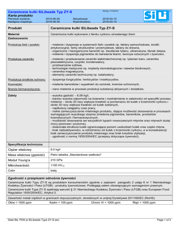 Wersja: V14/2015 Ceramiczne kulki SiLibeads Typ ZY-S Karta produktu Pierwsze wydanie: Następna inspekcja: 2015-06-29 2016-06-30 Aktualizacja: Wydrukowano: 2016-03-10 2016-03-10 Produkt Ceramiczne kulki SiLibeads Typ ZY-S Materiał Ceramiczne kulki wykonane z tlenku cyrkonu utrwalanego itrem Zastosowanie Produkcja farb i powłok: - mielenie i dyspersja w systemach farb i powłok np. lakiery samochodowe, środki antykorozyjne, farby strukturalne i przemysłowe, lakiery do drewna, - organiczne i nieorganiczne barwniki np. dwutlenek tytanu, ultramaryna, tlenek żelaza, - mielenie i dyspersja pigmentów do barwienia tkanin, tworzyw sztucznych i żywności, Produkcja ceramiki: - mielenie i przetwarzanie ceramiki elektrotechnicznej np. tytanian baru, ceramika piezoelektryczna, czujniki, kondensatory, - przetwarzanie szkliwa, - technologie medyczne np. implanty stomatologiczne i stawów biodrowych, - ceramika magnetyczna, - elementy ceramiki technicznej np. katalizatory, Produkcja środków ochrony: - dyspersja fungicydów, herbicydów i insektycydów, Kosmetyki: - mielenie barwników i wypełnień do szminek, kremów ochronnych, Branża farmaceutyczna: - nano mielenie w procesie produkcji substancji aktywnych i dodatków, Zalety - wysoka gęstość – 6,06 kg/l, - bardzo wysoka odporność na ścieranie i rozdrabnianie w zależności od specyfiki procesu mielenia – około 20 razy większa trwałość w porównaniu do kulek z krzemionki cyrkonu i około 35 razy większa trwałość od kulek szklanych, - najdłuższy osiągalny czas pracy, - niskie zanieczyszczenie mielonego produktu, dające możliwość stosowania w procesach wymagających wysokiego stopnia zmielenia pigmentów, barwników, produktów kosmetycznych i farmaceutycznych, - możliwość stosowania we wszystkich typach nowoczesnych młynów oraz młynach dużej mocy (pionowe i poziome), - doskonała struktura kulek ograniczająca poziom uszkodzeń kulek oraz części młyna, - brak radioaktywności, w odróżnieniu od kulek z krzemionki cyrkonu, a w konsekwencji brak zanieczyszczenia produktu mielonego oraz brak kosztów utylizacji, - zgodność z normą 1935/2004/EC (przepisy dotyczące żywności), Specyfikacja techniczna Ciężar właściwy 6.0 kg/l Masa właściwa (gęstość) Patrz tabelka „Standardowe wielkości” Moduł Young‘a 210 GPa Mikrotwardość 1150 HV10 Color biały Zgodność z przepisami odnośnie żywności Ceramiczne kulki Typu ZY-S są produktem konsumenckim zgodnie z zapisami paragrafu 2 ustęp 6 nr 1 Niemieckiego Kodeksu Żywności i Pasz (LFGB) - produkty żywnościowe. Podlegają zatem obowiązującym wymaganiom prawnym. Ceramiczne kulki Type ZY-S spełniają warunki § 31 Niemieckiego Kodeksu Żywności i Pasz (LFGB) oraz European Food Regulation 1935/2004/EC, Artykuł 3. Zawartość metali ciężkich w granicach dopuszczalnych, określonych w unijnej Dyrektywie 2011/65/EC (RoHS). Ołów < 1000 ppm Kadm < 100 ppm Data file: PDS pl SiLibeads Type ZY-S.doc Chrom VI < 1000 ppm Rtęć < 1000 ppm Page 1 of 2 Wersja: V14/2015 Ceramiczne kulki SiLibeads Typ ZY-S Karta produktu Pierwsze wydanie: Następna inspekcja: 2015-06-29 2016-06-30 Aktualizacja: Wydrukowano: 2016-03-10 2016-03-10 Standardowe wielkości (średnice specjalne na żądanie) Artykuł Średnica Gęstość nasypowa 96015 96025 9603 96035 96045 9605 9607 9609 9611 9613 9615 9617 9619 9620 9621 9623 9625 9627 9629 9630 96315 96355 9644 9650 9665 96700 9685 961500 962000 963000 0.10 – 0.20 mm 0.20 – 0.30 mm 0.20 – 0.40 mm 0.30 – 0.40 mm 0.40 – 0.50 mm 0.40 – 0.60 mm 0.60 – 0.80 mm 0.80 – 1.00 mm 1.00 – 1.20 mm 1.20 – 1.40 mm 1.40 – 1.60 mm 1.60 – 1.80 mm 1.80 – 2.00 mm 1.90 – 2.10 mm 2.00 – 2.20 mm 2.00 – 2.50 mm 2.30 – 2.70 mm 2.60 – 2.80 mm 2.60 – 3.30 mm 2.70 – 3.30 mm 3.00 – 3.30 mm 3.40 – 3.70 mm 4.20 – 4.60 mm 4.80 – 5.20 mm 6.20 – 6.80 mm 6.60 – 7.20 mm 8.30 – 8.70 mm 15.0 mm +/- 2.0 mm 20.0 mm +/- 2.0 mm 30.0 mm +/- 2.0 mm 3.62 kg/l 3.62 kg/l 3.63 kg/l 3.63 kg/l 3.64 kg/l 3.64 kg/l 3.66 kg/l 3.66 kg/l 3.67 kg/l 3.68 kg/l 3.69 kg/l 3.71 kg/l 3.73 kg/l 3.74 kg/l 3.74 kg/l 3.75 kg/l 3.75 kg/l 3.75 kg/l 3.76 kg/l 3.76 kg/l ----------------------------------------- Skład chemiczny: kulki wykonane z tlenku cyrkonu utrwalanego itrem Nazwa Dwutlenek cyrkonu ZrO2 + (1) Dwutlenek Hafnu HfO2 Tlenek itru Y2O3 Pozostałe (1) Metoda Udział (wartości referencyjne) DIN 51001 94.40 % DIN 51001 5.30 % 0.30 % Numer CAS 1314-23-4 EINECS 215-227-2 12055-23-1 1314-36-9 235-013-2 215-233-5 pochodzenie naturalne (pozostałości z przetwarzania surowca – piasku cyrkonowego) Dodatkowe informacje Przechowywanie Przechowywać w suchym pomieszczeniu w zamkniętych oryginalnych opakowaniach w temperaturze pokojowej. Utylizacja Proszę zachować zgodność z obowiązującymi krajowymi i regionalnymi przepisami odnośnie utylizacji i składowania. Bezpieczeństwo Wysokie ryzyko poślizgnięcia w przypadku rozsypania produktu. Informacje o produkcie Katalog z próbkami ceramicznych kulek, Karta bezpieczeństwa produktu SiLibeads Type ZY-S; Wyniki testów produktu Producent Sigmund Lindner GmbH; Oberwarmensteinacher Strasse 38; 95485 Warmensteinach / GERMANY Phone: 09277-9940 Web: www.sili.eu Fax: 09277-99499 E-Mail: [email protected] Wszystkie podane wartości mają charakter referencyjny i mogą ulec zmianie bez uprzedzenia. Data file: PDS pl SiLibeads Type ZY-S.doc Page 2 of 2