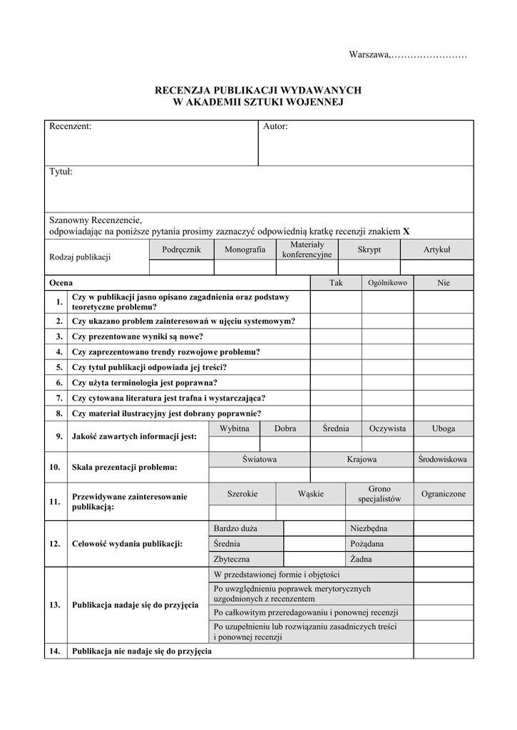 Warszawa,…………………… RECENZJA PUBLIKACJI WYDAWANYCH W AKADEMII SZTUKI WOJENNEJ Recenzent: Autor: Tytuł: Szanowny Recenzencie, odpowiadając na poniższe pytania prosimy zaznaczyć odpowiednią kratkę recenzji znakiem X Rodzaj publikacji Podręcznik Materiały konferencyjne Monografia Czy w publikacji jasno opisano zagadnienia oraz podstawy teoretyczne problemu? 2. Czy ukazano problem zainteresowań w ujęciu systemowym? 3. Czy prezentowane wyniki są nowe? 4. Czy zaprezentowano trendy rozwojowe problemu? 5. Czy tytuł publikacji odpowiada jej treści? 6. Czy użyta terminologia jest poprawna? 7. Czy cytowana literatura jest trafna i wystarczająca? 8. Czy materiał ilustracyjny jest dobrany poprawnie? 9. Jakość zawartych informacji jest: Wybitna Dobra Ogólnikowo Nie Średnia Oczywista Uboga Światowa 10. Skala prezentacji problemu: 11. Przewidywane zainteresowanie publikacją: 12. Celowość wydania publikacji: Szerokie Krajowa Wąskie Grono specjalistów Bardzo duża Niezbędna Średnia Pożądana Zbyteczna Żadna W przedstawionej formie i objętości 13. Publikacja nadaje się do przyjęcia Po uwzględnieniu poprawek merytorycznych uzgodnionych z recenzentem Po całkowitym przeredagowaniu i ponownej recenzji Po uzupełnieniu lub rozwiązaniu zasadniczych treści i ponownej recenzji 14. Publikacja nie nadaje się do przyjęcia Artykuł Tak Ocena 1. Skrypt Środowiskowa Ograniczone Uzasadnienie recenzji: ………………………………………………………………………………………………………… ………………………………………………………………………………………………………… ………………………………………………………………………………………………………… ………………………………………………………………………………………………………… ………………………………………………………………………………………………………… ………………………………………………………………………………………………………… ………………………………………………………………………………………………………… ………………………………………………………………………………………………………… ………………………………………………………………………………………………………… ………………………………………………………………………………………………………… ………………………………………………………………………………………………………… ………………………………………………………………………………………………………… ………………………………………………………………………………………………………… ………………………………………………………………………………………………………… ………………………………………………………………………………………………………… ………………………………………………………………………………………………………… ………………………………………………………………………………………………………… ………………………………………………………………………………………………………… ………………………………………………………………………………………………………… ………………………………………………………………………………………………………… ………………………………………………………………………………………………………… ………………………………………………………………………………………………………… ………………………………………………………………………………………………………… ………………………………………………………………………………………………………… ………………………………………………………………………………………………………… Ocena końcowa publikacji: ZNAKOMITA B. DOBRA …………………….……. miejscowość DOBRA …………………….……. data SŁABA NIEMOŻLIWA DO PRZYJĘCIA …………………….……. podpis