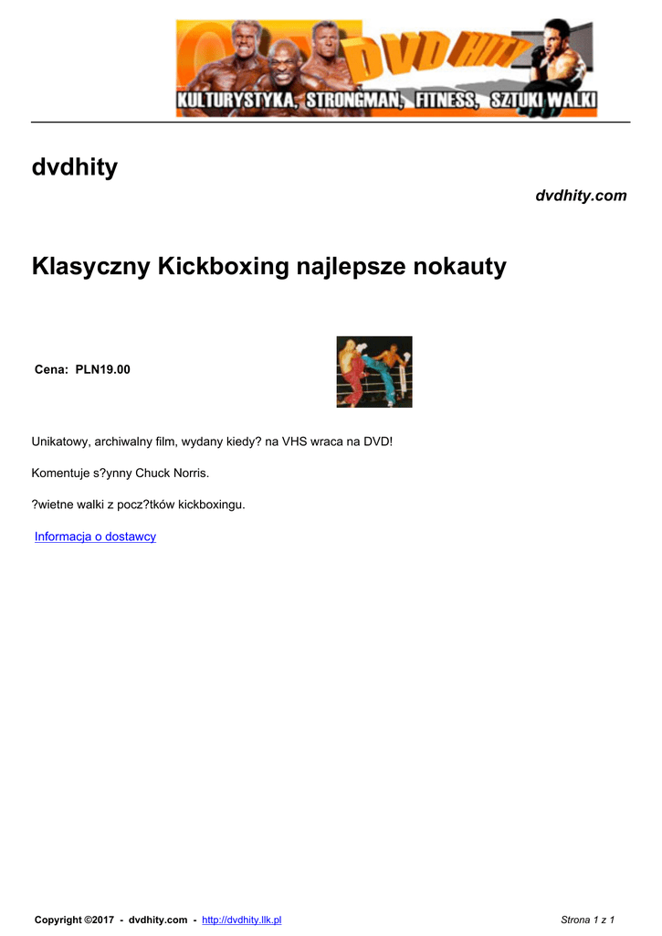 dvdhity dvdhity.com Klasyczny Kickboxing najlepsze nokauty Cena: PLN19.00 Unikatowy, archiwalny film, wydany kiedy? na VHS wraca na DVD! Komentuje s?ynny Chuck Norris. ?wietne walki z pocz?tków kickboxingu. Informacja o dostawcy Copyright ©2017 - dvdhity.com - http://dvdhity.llk.pl Strona 1 z 1