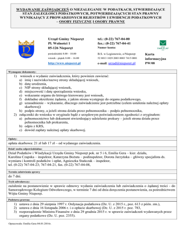 WYDAWANIE ZAŚWIADCZEŃ O NIEZALEGANIU W PODATKACH, STWIERDZAJĄCE STAN ZALEGŁOŚCI PODATKOWYCH, POTWIERDZAJĄCYCH STAN PRAWNY WYNIKAJĄCY Z PROWADZONYCH REJESTRÓW I EWIDENCJI PODATKOWYCH – OSOBY FIZYCZNE I OSOBY PRAWNE Urząd Gminy Nieporęt Pl. Wolności 1 05-126 Nieporęt tel.: (0-22) 767-04-00 fax.: (0-22) 767-04-41 poniedziałek 8.00 – 18.00 B.S. w Legionowie, o/Nieporęt wtorek - piątek 8.00 – 16.00 52 8013 1029 2003 0003 7415 0001 Karta informacyjna http://www.nieporet.pl e-mail: [email protected] PW/08 Numer konta: Wymagane dokumenty: 1) wniosek o wydanie zaświadczenia, który powinien zawierać: a) imię i nazwisko/nazwę strony składającej wniosek, b) datę urodzenia, c) NIP strony składającej wniosek, d) miejscowość i datę sporządzenia wniosku, e) wskazanie organu do którego kierowany jest wniosek, f) dokładne określenie żądania, z jakim strona występuje do organu podatkowego, g) uzasadnienie – wykazanie, dlaczego zaświadczenie jest potrzebne (celem ustalenia należnej opłaty skarbowej) h) podpis strony, a jeżeli strona działa przez pełnomocnika – podpis pełnomocnika, 2) załączniki do wniosku w oryginale bądź z urzędowym poświadczeniem zgodności z oryginałem: a) pełnomocnictwo lub dokument stwierdzający udzielenie prokury – jeżeli strona działa przez pełnomocnika lub prokurenta, b) odpis z KRS, c) dowód zapłaty należnej opłaty skarbowej. Opłaty: opłata skarbowa: 21 zł lub 17 zł – od wydanego zaświadczenia. Dział/ osoba odpowiedzialna: Dział Podatków i Windykacji Urzędu Gminy Nieporęt pok. nr 5 i 6, Emilia Gera – kier. działu, Karolina Czapska – inspektor, Katarzyna Bożuta – podinspektor, Dorota Jarzyńska – główny specjalista ds. wymiaru i kontroli podatków i opłat, Agnieszka Stańczak – inspektor, tel. (0-22) 767-04-23; 767-04-21, fax. (0-22) 767-04-08, Termin załatwienia sprawy do 7 dni. Tryb odwoławczy: zażalenie na postanowienie w sprawie odmowy wydania zaświadczenia lub zaświadczenia o żądanej treści - do Samorządowego Kolegium Odwoławczego, w terminie 7 dni od dnia doręczenia postanowienia, za pośrednictwem Wójta Gminy Nieporęt. Podstawa prawna: 1) ustawa z dnia 29 sierpnia 1997 r. Ordynacja podatkowa (Dz. U. z 2015 r., poz. 613 z późn. zm.), 2) ustawa z dnia 16 listopada 2006 r. i o opłacie skarbowej (Dz. U. z 2015 r. poz. 783, 3) rozporządzenie Ministra Finansów z dnia 29 grudnia 2015 r. w sprawie zaświadczeń wydawanych przez organy podatkowe (Dz. U. poz. 2355). Opracowała: Emilia Gera 04.01.2016r. Uwagi: złożenie dokumentu stwierdzającego udzielenie pełnomocnictwa lub prokury, jak również odpisu, wypisu lub kopii takiego dokumentu – podlega opłacie skarbowej w wysokości 17,00 zł za jeden dokument. Załączniki: 1) wzór wniosku o wydanie zaświadczenia w sprawach podatkowych. Opracowała: Emilia Gera 04.01.2016r.