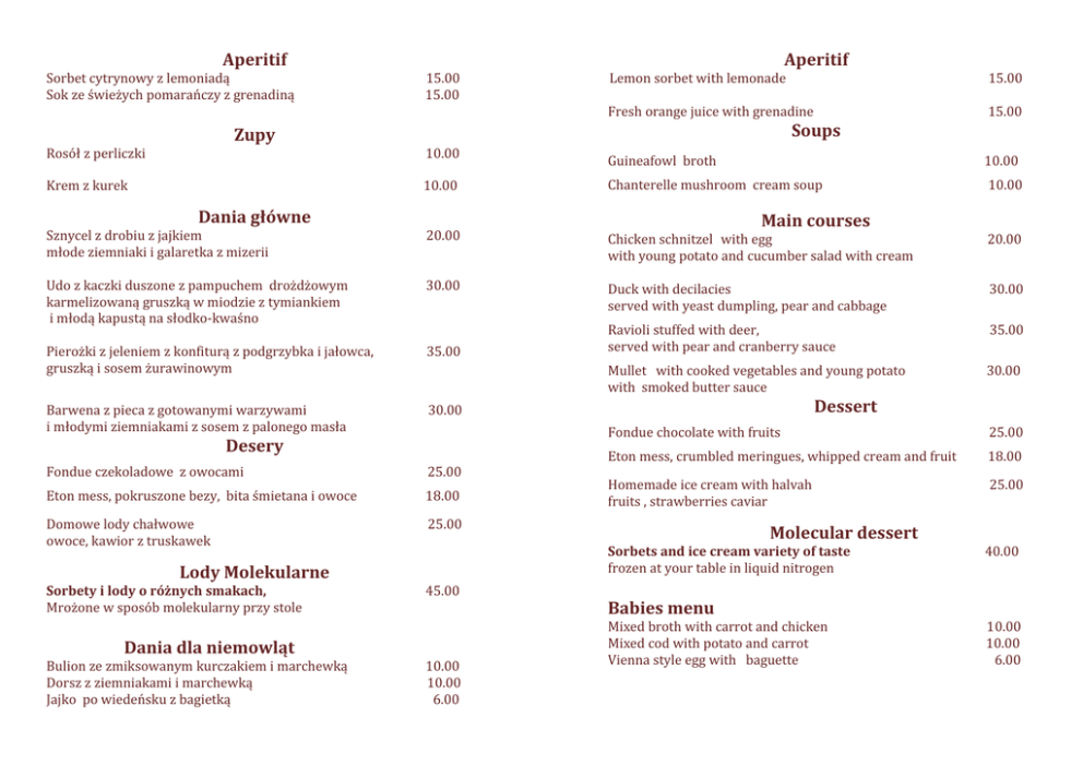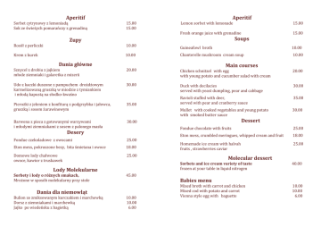 Aperitif Sorbet cytrynowy z lemoniadą Sok ze świeżych pomarańczy z grenadiną Aperitif 15.00 15.00 Lemon sorbet with lemonade 15.00 Fresh orange juice with grenadine 15.00 Guineafowl broth 10.00 10.00 Soups Zupy Rosół z perliczki 10.00 Krem z kurek 10.00 Chanterelle mushroom cream soup Sznycel z drobiu z jajkiem młode ziemniaki i galaretka z mizerii 20.00 Chicken schnitzel with egg with young potato and cucumber salad with cream 20.00 Udo z kaczki duszone z pampuchem drożdżowym karmelizowaną gruszką w miodzie z tymiankiem i młodą kapustą na słodko-kwaśno 30.00 Duck with decilacies served with yeast dumpling, pear and cabbage 30.00 35.00 Pierożki z jeleniem z konfiturą z podgrzybka i jałowca, gruszką i sosem żurawinowym 35.00 Ravioli stuffed with deer, served with pear and cranberry sauce Mullet with cooked vegetables and young potato with smoked butter sauce 30.00 Barwena z pieca z gotowanymi warzywami i młodymi ziemniakami z sosem z palonego masła 30.00 Dania główne Desery Fondue czekoladowe z owocami 25.00 Eton mess, pokruszone bezy, bita śmietana i owoce 18.00 Domowe lody chałwowe owoce, kawior z truskawek 25.00 Lody Molekularne Sorbety i lody o różnych smakach, Mrożone w sposób molekularny przy stole Dania dla niemowląt Bulion ze zmiksowanym kurczakiem i marchewką Dorsz z ziemniakami i marchewką Jajko po wiedeńsku z bagietką Main courses Dessert Fondue chocolate with fruits 25.00 Eton mess, crumbled meringues, whipped cream and fruit 18.00 Homemade ice cream with halvah fruits , strawberries caviar 25.00 Molecular dessert Sorbets and ice cream variety of taste frozen at your table in liquid nitrogen 45.00 10.00 10.00 6.00 Babies menu Mixed broth with carrot and chicken Mixed cod with potato and carrot Vienna style egg with baguette 40.00 10.00 10.00 6.00 MENU DLA DZIECI KIDS MENU