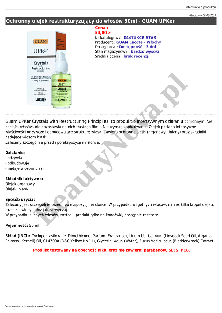 Informacje o produkcie Utworzono 08-03-2017 Ochronny olejek restrukturyzujący do włosów 50ml - GUAM UPKer Cena : 54,00 zł a. pl Nr katalogowy : 0447UKCRISTAR Producent : GUAM Lacote - Włochy Dostępność : Dostępność - 3 dni Stan magazynowy : bardzo wysoki Średnia ocena : brak recenzji ov Guam UPKer Crystals with Restructuring Principiles to produkt o intensywnym działaniu ochronnym. Nie ea Składniki aktywne: Olejek arganowy Olejek lniany ut Działanie: - odżywia - odbudowuje - nadaje włosom blask yN obciąża włosów, nie pozostawia na nich tłustego filmu. Nie wymaga spłukiwania. Olejek posiada intensywne właściwości odżywcze i odbudowujące strukturę włosa. Zawiera ochronne olejki (arganowy i lniany) oraz składniki nadające włosom blask. Zalecany szczególnie przed i po ekspozycji na słońce. B Sposób użycia: Zalecany jest szczególnie przed i po ekspozycji na słońce. W przypadku wilgotnych włosów, nanieś kilka kropel olejku, rozczesz włosy i ułóż jak zazwyczaj. W przypadku suchych włosów, zastosuj produkt tylko na końcówki, następnie rozczesz. Pojemność: 50 ml Skład (INCI): Cyclopentasiloxane, Dimethicone, Parfum (Fragrance), Linum Usitissimum (Linseed) Seed Oil, Argania Spinosa (Kernell) Oil, CI 47000 (D&C Yellow No.11), Glycerin, Aqua (Water), Fucus Vesiculosus (Bladderwrack) Extract. Produkt testowany na obecność niklu oraz nie zawiera: parabenów, SLES, PEG. Wygenerowano w programie www.oscGold.com