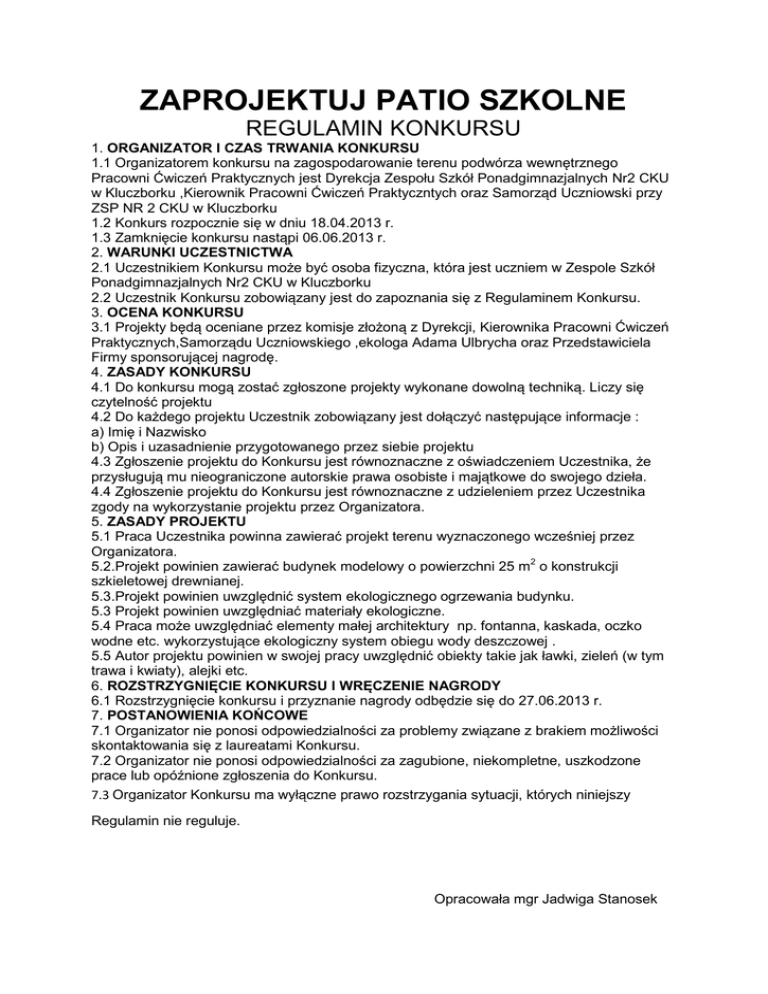 ZAPROJEKTUJ PATIO SZKOLNE REGULAMIN KONKURSU 1. ORGANIZATOR I CZAS TRWANIA KONKURSU 1.1 Organizatorem konkursu na zagospodarowanie terenu podwórza wewnętrznego Pracowni Ćwiczeń Praktycznych jest Dyrekcja Zespołu Szkół Ponadgimnazjalnych Nr2 CKU w Kluczborku ,Kierownik Pracowni Ćwiczeń Praktyczntych oraz Samorząd Uczniowski przy ZSP NR 2 CKU w Kluczborku 1.2 Konkurs rozpocznie się w dniu 18.04.2013 r. 1.3 Zamknięcie konkursu nastąpi 06.06.2013 r. 2. WARUNKI UCZESTNICTWA 2.1 Uczestnikiem Konkursu może być osoba fizyczna, która jest uczniem w Zespole Szkół Ponadgimnazjalnych Nr2 CKU w Kluczborku 2.2 Uczestnik Konkursu zobowiązany jest do zapoznania się z Regulaminem Konkursu. 3. OCENA KONKURSU 3.1 Projekty będą oceniane przez komisje złożoną z Dyrekcji, Kierownika Pracowni Ćwiczeń Praktycznych,Samorządu Uczniowskiego ,ekologa Adama Ulbrycha oraz Przedstawiciela Firmy sponsorującej nagrodę. 4. ZASADY KONKURSU 4.1 Do konkursu mogą zostać zgłoszone projekty wykonane dowolną techniką. Liczy się czytelność projektu 4.2 Do każdego projektu Uczestnik zobowiązany jest dołączyć następujące informacje : a) Imię i Nazwisko b) Opis i uzasadnienie przygotowanego przez siebie projektu 4.3 Zgłoszenie projektu do Konkursu jest równoznaczne z oświadczeniem Uczestnika, że przysługują mu nieograniczone autorskie prawa osobiste i majątkowe do swojego dzieła. 4.4 Zgłoszenie projektu do Konkursu jest równoznaczne z udzieleniem przez Uczestnika zgody na wykorzystanie projektu przez Organizatora. 5. ZASADY PROJEKTU 5.1 Praca Uczestnika powinna zawierać projekt terenu wyznaczonego wcześniej przez Organizatora. 5.2.Projekt powinien zawierać budynek modelowy o powierzchni 25 m2 o konstrukcji szkieletowej drewnianej. 5.3.Projekt powinien uwzględnić system ekologicznego ogrzewania budynku. 5.3 Projekt powinien uwzględniać materiały ekologiczne. 5.4 Praca może uwzględniać elementy małej architektury np. fontanna, kaskada, oczko wodne etc. wykorzystujące ekologiczny system obiegu wody deszczowej . 5.5 Autor projektu powinien w swojej pracy uwzględnić obiekty takie jak ławki, zieleń (w tym trawa i kwiaty), alejki etc. 6. ROZSTRZYGNIĘCIE KONKURSU I WRĘCZENIE NAGRODY 6.1 Rozstrzygnięcie konkursu i przyznanie nagrody odbędzie się do 27.06.2013 r. 7. POSTANOWIENIA KOŃCOWE .1 rganizator nie ponosi odpowiedzialności za problemy związane z brakiem możliwości skontaktowania się z laureatami Konkursu. .2 rganizator nie ponosi odpowiedzialności za zagubione, niekompletne, uszkodzone prace lub opó nione zgłoszenia do Konkursu. 7.3 j, ó h j Regulamin nie reguluje. J d a Stanosek