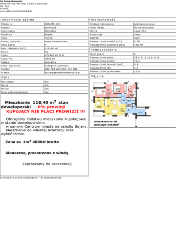 As Nieruchomości Sienkiewicza 49/108, 15-002 Białystok tel. fax. e-mail: www.asnieruchomosci24.pl Informacje ogólne Nieruchomość Oferta nr ASN-MS-135 Rodzaj mieszkania jednopoziomowe Rodzaj sprzedaż Stan lokalu Do wykończenia Lokalizacja Białystok Okna nowe PCV Dzielnica Bojary Instalacje nowe Ulica Ryska Balkon duży Rodzaj budynku nowe budownictwo Powierzchnia działki [m2] 0.00 Ilość pokoi 4 Powierzchnia użytkowa [m2] 118,40 Pow. całkowita [m2] 118.40 m² Piętro 4p Cena 472900.00 PLN Cena/m2 3994.09 Status aktualna Imię i nazwisko Grzegorz Ostrowski Telefon 602 701 662 604 434 682 E-mail [email protected] Pomieszczenia Ilość pokoi 4 Powierzchnia pokoi 33,4 21,1 11,6 12,8 Powierzchnia kuchni 12,2 Powierzchnia łazienki [m2] 6,4 Powierzchnia WC 1,4 Powierzchnia przedpokoi 12,8 Zdjęcia Opis Plac zabaw nie Alarm nie Winda tak Drzwi antywłamaniowe nie Mieszkanie 118,40 m2 stan deweloperski 0% prowizji KUPUJĄCY NIE PŁACI PROWIZJI !!! Oferujemy Państwu mieszkania 4-pokojowe w stanie deweloperskim w samym Centrum miasta na osiedlu Bojary. Mieszkanie do własnej aranżacji oraz wykończenia. Cena za 1m2 4000zł brutto Słoneczne, przestronne z windą Zapraszamy do prezentacji © Wszelkie prawa zastrzeżone - As Nieruchomości