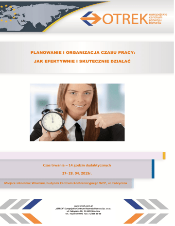 S2 PLANOWANIE I ORGANIZACJA CZASU PRACY: JAK EFEKTYWNIE I SKUTECZNIE DZIAŁAĆ Czas trwania – 14 godzin dydaktycznych 27- 28. 04. 2015r. Miejsce szkolenia: Wrocław, budynek Centrum Konferencyjnego WPP, ul. Fabryczna 10 www.otrek.com.pl „OTREK” Europejskie Centrum Rozwoju Biznesu Sp. z o.o. ul. Fabryczna 10, 53-609 Wrocław tel.: 71/356 50 90, fax: 71/356 50 90 Cel szkolenia: Poznanie i przetrenowanie narzędzi, technik oraz zasad skutecznego organizowania własnej przestrzeni zawodowej. Zdobycie umiejętności priorytezacji zadań i zarządzania nimi. Uświadomienie sobie swoich mocnych stron, a także umiejętności związanych z zarządzaniem sobą w czasie oraz autodiagnoza słabych stron w tym obszarze. Prowadzący: Jacek Cymerman –coach, trener, consultant. Absolwent Wydziału Organizacji i Zarządzania Politechniki Śląskiej. Ukończył Studia Podyplomowe „Psychologia w zarządzaniu” oraz „Public relations” Trenerów Biznesu oraz Szkołę Coachów Wszechnicy Uniwersytetu Jagiellońskiego wg standardów ICF. Posiada 13 letnie doświadczenie zdobyte w pracy z grupami pracowników oraz menedżerów w różnych branżach. Adresaci: Szkolenie skierowane jest do osób zapracowanych, chcących zwolnić codzienne tempo, uwolnić się od presji napierających obowiązków oraz ciągłej presji czasu. Również osoby pragnące poprawić swoją organizację czasu oraz osiągać lepsze jakościowo i ilościowo wyniki pracy znajdą tu skuteczne rozwiązania. Miejsce szkolenia: „OTREK” Europejskie Centrum Rozwoju Biznesu Sp. z o.o. we Wrocławiu, ul. Fabryczna 10, II piętro. Ilość miejsc ograniczona, liczba w grupie do 15 osób. Czas trwania szkolenia: Szkolenie obejmuje 14 godzin dydaktycznych i realizowane jest w ciągu 2 dni. Zajęcia rozpoczynają się o godz. 9.00 i kończą o godz. 15.00. Kontakt: Dodatkowych informacji udziela: Iwona Orkisz Tel. 71/ 356 50 91, email: [email protected] Opłata za szkolenie wynosi 890, 00 PLN + 23% VAT i obejmuje udział w warsztatach, przerwy kawowe , lunch oraz zaświadczenie. Należność za udział w szkoleniu, prosimy przekazać przelewem, po otrzymaniu potwierdzenia o rozpoczęciu szkolenia, na konto: BZ WBK I/O Wrocław, Nr: 85 1090 2398 0000 0001 1426 1336 Program szkolenia: Wprowadzenie w temat zarządzania czasem – odrobina filozofii i refleksji nad naturą czasu. Parę słów na temat kulturowych różnic w podejściu do czasu. Optymalne pory dnia – krzywa REFA Moje 24 godziny – jak jest? Jak chcę żeby było? Na co chciałbym znaleźć czas? Zasady formułowania celów – czyli gdzie zmierzamy? Metoda WARTO Metoda SMART i SMART + Etapy definiowania celów, cele długo, średnio i krótko terminowe. Narzędzia wspomagające efektywne zarządzanie sobą w czasie – jak tam dotrzemy i jak długo to potrwa. Moja umiejętność samoorganizacji - autodiagnoza Fotografia dnia, tygodnia pracy Macierz Eisenhowera – kryterium pilności i ważności zadań. Priorytetyzacja własnych zadań wg kryterium ważności i pilności Zasada Pareto, Analiza ABC, Metoda ALPEN Zasada planowania 60-20-20 Przeszkody w efektywnym zarządzaniu sobą w czasie – co nam może przeszkodzić i jak się przed tym uchronić? Identyfikacja typowych czasopożeraczy i przyczyny ich występowania Środki zaradcze Prokrastynacja - jak sobie z nią radzić Efekt piły Asertywność jako zachowanie wspierające zarządzanie sobą w czasiejak chronić siebie przed robieniem czegoś za innych? Komunikat typu „Ja” Asertywna odmowa i reakcja na krytykę Asertywne wyrażanie próśb Narzędzia planowania w projektowym trybie pracy – warto poświęcić czas na metodyczne planowanie aby uniknąć błędów w realizacji. Szkolenie może być również zrealizowane w formie zamkniętej dla grupy pracowników z jednej firmy. Projekt a proces - różnice Definiowanie zakresu, celów i produktu projektu Karta projektu; Koszty, zakres, czas – jak zarządzać tymi zmiennymi w projekcie Etapy projektu; Struktura podziału pracy w projekcie – jak zidentyfikować wszystkie zadania potrzebne do powstania produktu projektu Sieć projektu – logiczna kolejność zadań i ich zależności Harmonogramowanie zadań w projekcie – czasochłonność, ścieżka krytyczna Kamienie milowe Ryzyka w projekcie