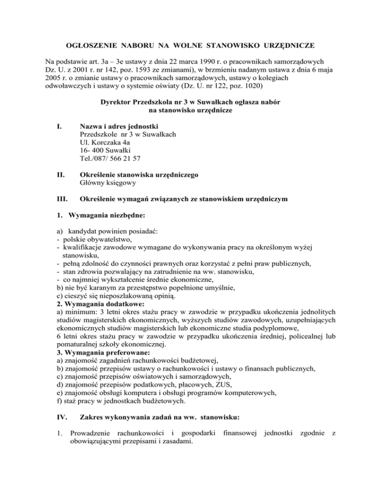 OGŁOSZENIE NABORU NA WOLNE STANOWISKO URZĘDNICZE Na podstawie art. 3a – 3e ustawy z dnia 22 marca 1990 r. o pracownikach samorządowych Dz. U. z 2001 r. nr 142, poz. 1593 ze zmianami), w brzmieniu nadanym ustawa z dnia 6 maja 2005 r. o zmianie ustawy o pracownikach samorządowych, ustawy o kolegiach odwoławczych i ustawy o systemie oświaty (Dz. U. nr 122, poz. 1020) Dyrektor Przedszkola nr 3 w Suwałkach ogłasza nabór na stanowisko urzędnicze I. Nazwa i adres jednostki Przedszkole nr 3 w Suwałkach Ul. Korczaka 4a 16- 400 Suwałki Tel./087/ 566 21 57 II. Określenie stanowiska urzędniczego Główny księgowy III. Określenie wymagań związanych ze stanowiskiem urzędniczym 1. Wymagania niezbędne: a) kandydat powinien posiadać: - polskie obywatelstwo, - kwalifikacje zawodowe wymagane do wykonywania pracy na określonym wyŜej stanowisku, - pełną zdolność do czynności prawnych oraz korzystać z pełni praw publicznych, - stan zdrowia pozwalający na zatrudnienie na ww. stanowisku, - co najmniej wykształcenie średnie ekonomiczne, b) nie być karanym za przestępstwo popełnione umyślnie, c) cieszyć się nieposzlakowaną opinią. 2. Wymagania dodatkowe: a) minimum: 3 letni okres staŜu pracy w zawodzie w przypadku ukończenia jednolitych studiów magisterskich ekonomicznych, wyŜszych studiów zawodowych, uzupełniających ekonomicznych studiów magisterskich lub ekonomiczne studia podyplomowe, 6 letni okres staŜu pracy w zawodzie w przypadku ukończenia średniej, policealnej lub pomaturalnej szkoły ekonomicznej. 3. Wymagania preferowane: a) znajomość zagadnień rachunkowości budŜetowej, b) znajomość przepisów ustawy o rachunkowości i ustawy o finansach publicznych, c) znajomość przepisów oświatowych i samorządowych, d) znajomość przepisów podatkowych, płacowych, ZUS, e) znajomość obsługi komputera i obsługi programów komputerowych, f) staŜ pracy w jednostkach budŜetowych. IV. 1. Zakres wykonywania zadań na ww. stanowisku: Prowadzenie rachunkowości i gospodarki obowiązującymi przepisami i zasadami. finansowej jednostki zgodnie z 2. 3. 4. V. Prowadzenie analizy wykorzystania środków przydzielonych z budŜetu lub środków pozabudŜetowych będących w dyspozycji jednostki. Sporządzanie sprawozdań finansowych. Przestrzeganie dyscypliny budŜetowej. Wymagane dokumenty oraz termin i miejsce ich składania. 1. a) b) c) Dokumenty niezbędne: list motywacyjny i CV z uwzględnieniem dokładnego przebiegu pracy zawodowej, kserokopia dowodu osobistego, odpis lub uwiarygodniona kserokopia dokumentów potwierdzających kwalifikacje zawodowe, d) staŜ pracy (kserokopie dyplomu i innych dokumentów potwierdzone za zgodność z oryginałem), e) zaświadczenie o stanie zdrowia ( zaświadczenie lekarskie o braku przeciwwskazań zdrowotnych do wykonywania pracy na stanowisku głównego księgowego), f) oświadczenie kandydata o pełnej zdolności do czynności prawnych i korzystaniu z praw publicznych, g) oświadczenie kandydata o niekaralności. List motywacyjny i CV powinny być opatrzone klauzulą: wyraŜam zgodę na przetwarzanie moich danych osobowych zawartych w ofercie pracy dla potrzeb niezbędnych do realizacji procesu rekrutacji zgodnie z ustawą z dnia 29 sierpnia 1997 r. o ochronie danych osobowych(Dz. U. z 2002 r. nr 101, poz. 926 ze zmianami) oraz ustawą z dnia 22 marca 1999 r. o pracownikach samorządowych(Dz. U. z 2001 r. nr 142, poz.1593 ze zmianami). 2. Dokumenty naleŜy składać w zamkniętych kopertach w Przedszkolu nr 3 w Suwałkach lub przesłać na adres wskazany w pkt I niniejszego ogłoszenia w terminie do 4.07.2008 r. do godziny 12.00. Na kopercie kandydaci umieszczają imię i nazwisko, adres do korespondencji oraz numer telefonu, a takŜe dopisek „Nabór na stanowisko urzędnicze – główny księgowy - w Przedszkolu nr 3 w Suwałkach ”. Suwałki, dn. 23 czerwiec 2008 r.