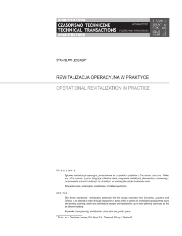 STANISŁAW LESSAER* REWITALIZACJA OPERACYJNA W PRAKTYCE OPERATIONAL REVITALIZATION IN PRACTICE Streszczenie Tytułowa rewitalizacja operacyjna, prezentowana na przykładach projektów z Chrzanowa, Jaworzna i Gliwic jest próbą powrotu, poprzez integrację działań w sferze: programów rewitalizacji, planowania przestrzennego, projektowania urb-arch i realizacji, do urbanistyki rozumianej jako sztuka budowania miast. Słowa Kluczowe: urbanistyka, rewitalizacja, przestrzeń publiczna. Abstract The theme operational revitalization presented with the design examples from Chrzanów, Jaworzno and Gliwice, is an attempt to return through integration of action within a sphere of: revitalization programmes, town and country planning, urban and architectural designs and realizations, up to town planning construed as the art of town building. Keyworks: town planning, revitalization, urban structure, public space * Dr inż. arch. Stanisław Lessaer, P.A. Nova S.A., Gliwice ul. Górnych Wałów 42. 104 1. Wstęp Czy jakakolwiek forma sztuki w przypadku jej prawnego zdeterminowania pozostaje jeszcze sztuką? Czy obecna prawna formuła planowania i zagospodarowania przestrzennego jest jeszcze kontynuacją sztuki budowy miast? Czy fakt posiadania przez miasto obowiązującego miejscowego planu zagospodarowania przestrzennego w sposób skuteczny urealnia procesy rewitalizacyjne? Czy procesy rewitalizacyjne znalazły właściwe prawne umocowanie w ustawie o planowaniu i zagospodarowaniu przestrzennym oraz pozostałych okołoplanistycznych aktach prawnych? Odpowiedzi na tak postawione pytania są zdecydowanie negatywne. Dziś wiele miast świata, w tym również miasta polskie, poszukują swojej współczesnej i przyszłej tożsamości oraz witalnego, a jednocześnie realnego pomysłu na dalsze właściwe funkcjonowanie. Działania te obarczone są spuścizną okresu postindustrialnego, unifikacją i globalizacją procesów ekonomicznych, kulturowych i socjalnych, a także demokratyczną możliwością i prawem, przemieszczania się jego mieszkańców bez ograniczeń administracyjnych czy narodowych. Miasto nie jest już dziełem tworzenia rozumianego jako sztuka budowy miast. Przestaje być zbiorowym celem i dobrem obywateli, lecz staje się hybrydą, przedmiotem anonimowych gier. Do niedawna procesy takie jak: rewitalizacja, rewaloryzacja, restrukturyzacja itp. traktowane były niezależnie, stając się dopełnieniem przebiegających równolegle procedur planistyczno-projektowych. Dziś większość działań i przedsięwzięć inwestycyjnych rozgrywa się w przestrzeni już kiedyś przetworzonej i uformowanej. Są zatem procesami typu re, zachodzącymi w konkretnych przestrzenno-społecznych formacjach. Nowe strategie rozwojowe i związane z nimi zmiany przestrzenno-użytkowe, niezależnie od ich skali, ingerują w zastaną społeczną i urbanistyczną strukturę, a także wykształcone mechanizmy życia i funkcjonowania miasta. Wywołują tym samym sprzężenia zwrotne w odniesieniu do pierwotnej struktury, powodujące zmiany dotychczasowego stanu systemu. Sytuacja ta wymaga odmiennego spojrzenia na rewitalizację, a szczególnie rewitalizację urbanistyczną re-urb rozumianą, jako wieloskalowy i wielodyscyplinarny proces o charakterze operacyjnym, odmienny od ustawowych procedur planowania przestrzennego. Tłem, na którym rozgrywane są wszystkie procesy re-urb jest zawsze obraz miasta, przedstawiany w postaci graficznej wizualizacji prawnego stanu działek, w tym terenów własności i współwłasności miasta (gminy) oraz skarbu państwa z wyodrębnionym rysunkiem – modelem obszaru przestrzeni publicznych. Dlaczego tak szczególne zainteresowanie przestrzeniami publicznymi? To miasto jest głównym właścicielem i administratorem tych przestrzeni i, do jego kompetencji i zadań należy ich ochrona oraz stymulowanie kierunków rozwojowych, właściwych i spójnych z tradycją miasta oraz nadrzędnymi publicznymi celami społeczności lokalnej. To struktura, kompozycja, forma, skala i różnorodność przestrzeni publicznych, pozwalają na indywidualne odczytywanie i rozumienie genetycznego kodu miasta. One też decydują o jakości terenów pozostałych w granicach których, realizowane są przede wszystkim indywidualne cele ich właścicieli. Uzasadnioną wydaje się zatem teza, iż język urbanistyki – sztuki, jest nam nadal bliższy niż język urbanistyki – procedury. W tej sytuacji rewitalizacja operacyjna w sensie semantycznym i systemowym stara się przywrócić zapominaną dziś sztukę budowy miast. Rewitalizacja operacyjna nie może być powrotem do tworzenia nostalgicznego historyzującego miasta. Przyjmuje cechy indywidualnych i usystematyzowanych działań, w których każde zadanie inwestycyjne (w większości wypadków będące jednocześnie jakąś formą re), jest osadzone w określonej strukturze urbanistycznej miasta, tym samym w jego publicznych i pozostałych przestrzeniach. Granica tych przestrzeni to specyficzna linia styku celów i interesów publicznych i niepublicznych, miejsce potencjalnych konfliktów i pól negocjacji. Struktura rewitalizacji operacyjnej, z uwagi na indywidualną formę systemu – modelu – procesu, stwarza możliwość wypracowania racjonalnych rozwiązań akceptowanych społecznie i niesprzecznych z zamierzeniami indywidualnymi, przenosząc je następnie na płaszczyznę ustawowego planowania i bezpośrednio do faz realizacyjnych. Polem doświadczalnym, a jednocześnie tytułową praktyką rewitalizacji operacyjnej są trzy projekty wdrażane w Chrzanowie, Jaworznie i Gliwicach. Niezależnie od ich specyfiki prezentację sprowadzono do ujednoliconej formy, przedstawiając kolejno: nazwę projektu, lokalizację, zasięg, specyfikę działań re, stan realizacji oraz cele, jakie udało się już osiągnąć. W części graficznej zestawiono w analogicznych skalach rysunki istniejącego i oczekiwanego stanu struktury urbanistycznej, w tym pr