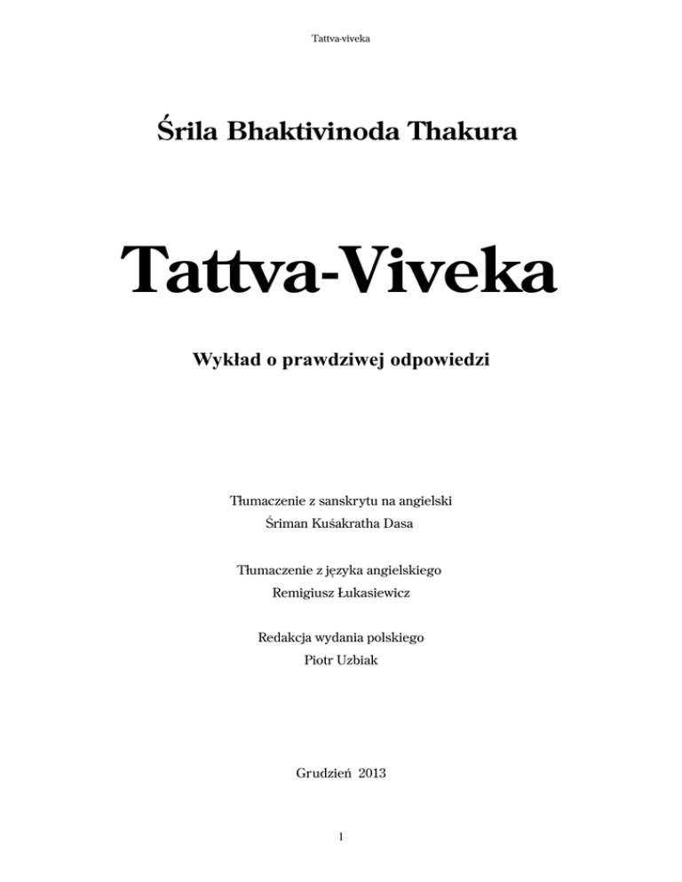 Tattva-viveka Śrila Bhaktivinoda Thakura Tattva-Viveka Wykład o prawdziwej odpowiedzi Tłumaczenie z sanskrytu na angielski Śriman Kuśakratha Dasa Tłumaczenie z języka angielskiego Remigiusz Łukasiewicz Redakcja wydania polskiego Piotr Uzbiak Grudzień 2013 1 Tattva-viveka Dedykacja nama om visnu-padaya krsna-presthaya bhutale srimate bhaktivedanta swamin iti namine namaste sarasvate devam gaura-vani pracarine nirvesesa sunyavadi, pascatya desa tarine Składam pełne szacunku pokłony memu mistrzowi duchowemu Śrila Bhaktivedancie Swamiemu Prabhupadzie, który jest bardzo drogi Krysznie, chroniąc się u Jego lotosowych stóp. Nasze pełne szacunku pokłony należą się tobie, o mistrzu, sługo Sarasvati Goswamiego Ty łaskawie nauczasz chwał Śri Ćaitanyi Mahaprabhu uwalniając kraje zachodniego świata od impersonalnych, filozoficznych spekulacji. Kuśakratha dasa 2 Tattva-viveka Wstęp do wydania polskiego Napisana w 1893 roku Tattva-viveka jest krótką, choć wszechstronną rozprawą filozoficzną, na temat Prawdy Absolutnej oraz rozmaitych koncepcji próbujących tę Prawdę pojąć. Tekst ten kojarzy się raczej z wykładem, który mógłby być wygłoszony, jako odpowiedz na sformułowane przez kogoś pytanie. Podtytuł „wykład o prawdziwej odpowiedzi”, jest zgodny ze znaczeniem słowa viveka, czyli wyjaśnienie, analizowanie, opisywanie jakiejś kwestii. Ten znakomity tekst znajdzie na pewno uznanie wśród osób, dla których filozofia, w sensie nauki, nie jest głównym źródłem poznania choć wiedzą, że jest istotna,ponieważ konkretyzuje duchowe fakty w przybliżonych, ale jednak wystarczająco zrozumiałych dla nas myślach i słowach. Autor nie podejmuje w tej pracy szczegółowych analiz i unika drobiazgowej argumentacji, jakie mają miejsce chociażby w SatSandarbhie. Tattva-viveka nie ma takich ambicji. Wygląda na to, że została napisana dla zwykłych, szczerych osób, stroniących raczej od intelektualnych, filozoficznych rozważań na temat życia. Jest to zatem tekst popularno-naukowy, co jest jego ogromną zaletą. Śrila Bhaktivinoda Thakura, którego dokonania nie są zbyt dobrze znane w Polsce, jest postacią niemalże legendarną wśród waisznawów na całym świecie. To genialny uczony i znakomity literat – poeta, autor słynnych ze swego piękna poematów na chwałę Boga, jak Gitavali i Saranagati napisanych w tym samym roku (1893). Jest autorem wspaniałej Dżaiva-dharmy (1896) i licznych komentarzy do Wed. To wielki mistrz duchowy, w którego sukcesji pojawił się Śrila Bhaktivedanta Swami Prabhupada, którego działalność misyjna w latach 1966-1977, związana z uprzystępnieniem ludziom ezoterycznej wiedzy wedyjskiej, zapisała się złotymi zgłoskami na kartach historii naszego świata. Bhaktivinoda Thakura był także biologicznym ojcem wspaniałych i czcigodnych nauczycieli szkoły waisznawa - Bhaktisiddhanty Sarasvatiego i jego brata Lalita Prasad Thakura. Dla waisznawów (wielbicieli Boga) tekst ten jest ważny jeszcze z jednego powodu. Autor, na podstawie swej znajomości istotnych faktów, przedstawia nam w ciekawy sposób różne systemy filozoficzne naszego świata (ze szczególnym uwzględnieniem szkół indyjskich), omawiając pokrótce zalety i wady kolejnych konstrukcji myślowych, pojawiających się w drugiej połowy XIX w. Zatem po lekturze tej książki staniemy się bogatsi o wiedzę na temat prądów i koncepcji filozoficznych. W tym kontekście praca ta może stanowić rodzaj skryptu, do którego łatwo sięgnąć, aby przypomnieć sobie istotne aspekty różnorakich filozofii i religii istniejących na naszej planecie. Mimo poważnych rozważań, tajemniczych, zawiłych, często hermetycznych, jest to tekst łatwy, lekki i przystępnie napisany. 3 Tattva-viveka 4 Tattva-viveka Śrila Bhaktivinoda Thakura - krótka biografia Śrila Śacidananda Bhaktivinoda Thakura (02.09.1838 – 23.06.1914), nauczyciel i autor (już od 12 roku życia) wielu tekstów i publikacji poświęconych Bogu (Prawdzie Absolutnej). Urodził się 2.09.1838 w Biranagara (Ulagrama), na terenie bengalskiego dystryktu Nadia, w bardzo zamożnej rodzinie. Był siódmym synem Krysznanandy Datta Radży, wielkiego wielbiciela Pana Nityanandy, będącego jednocześnie częścią tej wspaniałej gałęzi rodowej. Jego matką była Dżagat Mohini Devi. Przez swego ojca chrzestnego został nazwany imieniem Kedaranatha Datta. Bhaktivinoda przyjął inicjację waisznawa od Śri Vipinvihari Goswamiego, nauczającego w linii Śri Dżahnava Mata. Następnie otrzymywał duchowe wsparcie od Śrila Dżagannatha Dasa Babadżiego. Życzliwy dla wszystkich, nigdy nie żywił urazy do kogokolwiek, nawet do przeciwników kwestionujących jego nauczanie. W rzeczywistości, nigdy nie mówił nic, co mogłoby urazić czyjeś uczucia. Biografowie przytaczają zazwyczaj jego trzy główne osiągnięcia: 1. Napisał około 100 wspaniałych publikacji – książek, zbiorów poezji, esejów, komentarzy na temat religii, filozofii i duchowości. 2. Odkrył miejsce narodzin Śri Ćaitanyi Mahaprabhu – Złotego Avatara naszych czasów. 3. Wprowadził innowacje do procesu nauczania. Pisząc głównie w bengali, wysłał do szkół wyższych na całym świecie, 47 stronicową książkę – „Śri Gauranga-lila smarana”, z angielskim wprowadzeniem i tłumaczeniem ślok (1896 ). Oprócz tego pisał teksty w języku perskim i urdu, wyjaśniając wagę i znaczenie filozofii Gaurangi Mahaprabhu (Śri Ćaitanyi). Śrila Bhaktivedanta Swami Prabhupada, współczesny przedstawiciel kultu Śri Ćaitanyi, zwrócił uwagę na fakt, że urodził się w 1896 roku, w którym to Bhaktivinoda wysyłał swą książkę za granice. Powinniśmy przyjąć – powiedział Śrila Prabhupada – że Bhaktivinoda Thakura był początkiem ogólnoświatowego dzisiejszego Ruchu Świadomości Kryszny. Kedaranath (Bhaktivinoda Thakura) dzieciństwo spędził w rezydencji swego dziadka – Must