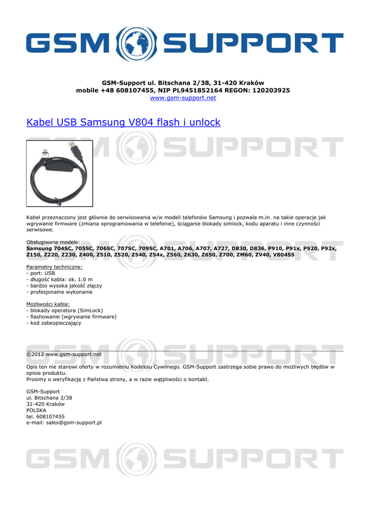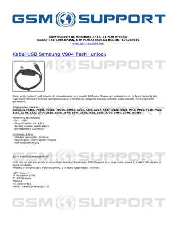 GSM-Support ul. Bitschana 2/38, 31-420 Kraków mobile +48 608107455, NIP PL9451852164 REGON: 120203925 www.gsm-support.net Kabel USB Samsung V804 flash i unlock Kabel przeznaczony jest głównie do serwisowania w/w modeli telefonów Samsung i pozwala m.in. na takie operacje jak wgrywanie firmware (zmiana oprogramowania w telefonie), ściąganie blokady simlock, kodu aparatu i inne czynności serwisowe. Obsługiwane modele: Samsung 704SC, 705SC, 706SC, 707SC, 709SC, A701, A706, A707, A727, D830, D836, P910, P91x, P920, P92x, Z150, Z220, Z230, Z400, Z510, Z520, Z540, Z54x, Z560, Z630, Z650, Z700, ZM60, ZV40, V804SS Parametry techniczne: - port: USB - długość kabla: ok. 1.0 m - bardzo wysoka jakość złączy - profesjonalne wykonanie Możliwości kabla: - blokady operatora (SimLock) - flashowanie (wgrywanie firmware) - kod zabezpieczający ©2012 www.gsm-support.net Opis ten nie stanowi oferty w rozumieniu Kodeksu Cywilnego. GSM-Support zastrzega sobie prawo do możliwych błędów w opisie produktu. Prosimy o weryfikację z Państwa strony, a w razie wątpliwości o kontakt. GSM-Support ul. Bitschana 2/38 31-420 Kraków POLSKA tel. 608107455 e-mail: [email protected] Powered by TCPDF (www.tcpdf.org)