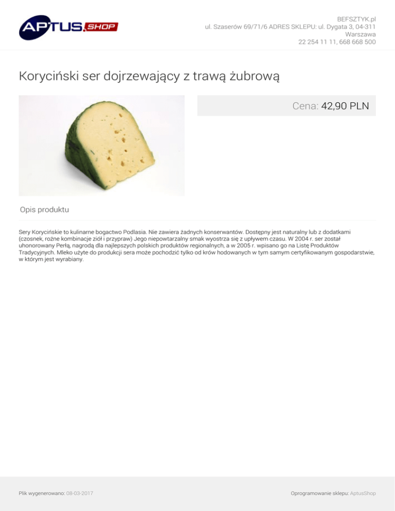 BEFSZTYK.pl ul. Szaserów 69/71/6 ADRES SKLEPU: ul. Dygata 3, 04-311 Warszawa 22 254 11 11, 668 668 500 Koryciński ser dojrzewający z trawą żubrową Cena: 42,90 PLN Opis produktu Sery Korycińskie to kulinarne bogactwo Podlasia. Nie zawiera żadnych konserwantów. Dostępny jest naturalny lub z dodatkami (czosnek, rożne kombinacje ziół i przypraw) Jego niepowtarzalny smak wyostrza się z upływem czasu. W 2004 r. ser został uhonorowany Perłą, nagrodą dla najlepszych polskich produktów regionalnych, a w 2005 r. wpisano go na Listę Produktów Tradycyjnych. Mleko użyte do produkcji sera może pochodzić tylko od krów hodowanych w tym samym certyfikowanym gospodarstwie, w którym jest wyrabiany. Plik wygenerowano: 08-03-2017 Powered by TCPDF (www.tcpdf.org) Oprogramowanie sklepu: AptusShop
