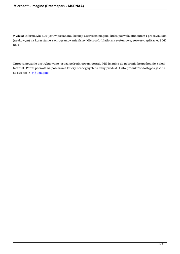 Microsoft - Imagine (Dreamspark / MSDNAA) Wydział Informatyki ZUT jest w posiadaniu licencji MicrosoftImagine, która pozwala studentom i pracownikom (naukowym) na korzystanie z oprogramowania firmy Microsoft (platformy systemowe, serwery, aplikacje, SDK, DDK). Oprogramowanie dystrybuowane jest za pośrednictwem portalu MS Imagine do pobrania bezpośrednio z sieci Internet. Portal pozwala na pobieranie kluczy licencyjnych na dany produkt. Lista produktów dostępna jest na na stronie -> MS Imagine 1/1