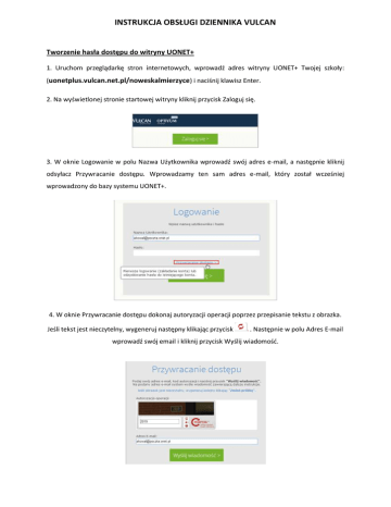 INSTRUKCJA OBSŁUGI DZIENNIKA VULCAN Tworzenie hasła dostępu do witryny UONET+ 1. Uruchom przeglądarkę stron internetowych, wprowadź adres witryny UONET+ Twojej szkoły: (uonetplus.vulcan.net.pl/noweskalmierzyce) i naciśnij klawisz Enter. 2. Na wyświetlonej stronie startowej witryny kliknij przycisk Zaloguj się. 3. W oknie Logowanie w polu Nazwa Użytkownika wprowadź swój adres e-mail, a następnie kliknij odsyłacz Przywracanie dostępu. Wprowadzamy ten sam adres e-mail, który został wcześniej wprowadzony do bazy systemu UONET+. 4. W oknie Przywracanie dostępu dokonaj autoryzacji operacji poprzez przepisanie tekstu z obrazka. Jeśli tekst jest nieczytelny, wygeneruj następny klikając przycisk . Następnie w polu Adres E-mail wprowadź swój email i kliknij przycisk Wyślij wiadomośd. Wyświetli się strona z informacją, że na zapisany w systemie adres wysłano wiadomośd, zawierającą dalsze instrukcje. 5. Odbierz wiadomośd, przeczytaj ją i kliknij osyłacz do strony, na ktorej możliwe będzie wprowadzenie hasła dostępu. 6. Na stronie Przywracanie hasła użytkownika dokonaj ponownie autoryzacji operacji, wprowadź hasło w polach Nowe hasło i Powtórz nowe hasło i kliknij przycisk Ustaw nowe hasło. Wyświetli się strona Podsumowanie operacji zawierająca informację, że hasło zostało zmienione. 7. Zamknij okno przeglądarki. Uruchamianie witryny systemu UONET+ po utworzeniu hasła dostępu 1. Przejdź do strony startowej witryny UONET+ kliknij przycisk Zaloguj się. 2. W oknie Logowanie wprowadź adres swój adres e-mail i utworzone podczas pierwszego logowania hasło dostępu i kliknij przycisk Zaloguj się. 3. Nastąpi przekierowanie na stronę startową użytkownika.