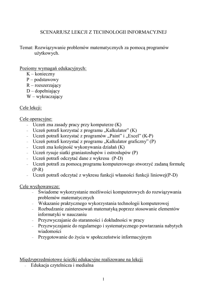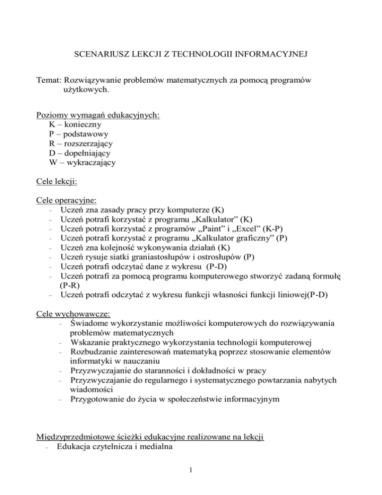 SCENARIUSZ LEKCJI Z TECHNOLOGII INFORMACYJNEJ Temat: Rozwiązywanie problemów matematycznych za pomocą programów użytkowych. Poziomy wymagań edukacyjnych: K – konieczny P – podstawowy R – rozszerzający D – dopełniający W – wykraczający Cele lekcji: Cele operacyjne: − Uczeń zna zasady pracy przy komputerze (K) − Uczeń potrafi korzystać z programu „Kalkulator” (K) − Uczeń potrafi korzystać z programów „Paint” i „Excel” (K-P) − Uczeń potrafi korzystać z programu „Kalkulator graficzny” (P) − Uczeń zna kolejność wykonywania działań (K) − Uczeń rysuje siatki graniastosłupów i ostrosłupów (P) − Uczeń potrafi odczytać dane z wykresu (P-D) − Uczeń potrafi za pomocą programu komputerowego stworzyć zadaną formułę (P-R) − Uczeń potrafi odczytać z wykresu funkcji własności funkcji liniowej(P-D) Cele wychowawcze: − Świadome wykorzystanie możliwości komputerowych do rozwiązywania problemów matematycznych − Wskazanie praktycznego wykorzystania technologii komputerowej − Rozbudzanie zainteresowań matematyką poprzez stosowanie elementów informatyki w nauczaniu − Przyzwyczajanie do staranności i dokładności w pracy − Przyzwyczajanie do regularnego i systematycznego powtarzania nabytych wiadomości − Przygotowanie do życia w społeczeństwie informacyjnym Międzyprzedmiotowe ścieżki edukacyjne realizowane na lekcji Edukacja czytelnicza i medialna 1 Planowany przebieg lekcji: 1. Sprawdzenie obecności. 2. Uruchomienie komputerów i przygotowanie środowiska do pracy na lekcji. 3. Wykonywanie ćwiczeń mających na celu wykorzystanie dostępnych programów w różnych dziedzinach matematyki. Zadanie 1 Wykorzystanie programu „Kalkulator” Oprocentowanie lokaty w pewnym banku wynosi 8,25% w stosunku rocznym. Korzystając z programu Kalkulator, oblicz wysokość odsetek z 242 zł, po upływie 6 miesięcy. Wynik zaokrąglij do części setnych złotego. (Zakładamy ze oprocentowanie w tym banku jest stałe). Rozwiązanie: - uczniowie wykonują działania przy pomocy kalkulatora 8,25 / 2 × 242 % 9,9825 9,9825 9,98 zł Odp: Po upływie 6 miesięcy odsetki wyniosą 9,98 zł. Zadanie 2 Wykorzystanie programu „Kalkulator” i „Paint” Jubiler przetopił prostopadłościenną sztabkę srebra o wymiarach: 0,004 m, 0,009 m, 0,002 m na wisiorek w kształcie piramidy o podstawie kwadratowej. a) Jak nazywa się bryła, którą przypomina wisiorek? b) Sporządź w programie Rysowanie rysunki siatek sztabki oraz wisiorka. c) Oblicz za pomocą kalkulatora, ile gramów waży wisiorek? (masa = gęstość * objętość, gęstość srebra = 10500 kg/m3 ) 2 Rozwiązanie: a) Wisiorek to ostrosłup prawidłowy czworokątny. b) Uczniowie rysują siatki prostopadłościanu i ostrosłupa c) Uczniowie przy użyciu kalkulatora obliczają masę Masa = 0,004 × 0,009 × 0,002 / 1000 = 0,756 g Odp: Masa wisiorka wynosi 0,756 g. Zadanie 3 Wykorzystanie programu „Excel” Pani pielęgniarka w pewnym liceum dokonała pomiaru wzrostu wśród uczniów klasy pierwszwj. Otrzymała następujące wyniki: Chłopcy: 154 168 146 173 190 175 152 183 191 163 (cm) Dziewczęta: 158 164 130 172 143 154 159 179 138 149 (cm) a) Przedstaw te dane za pomocą wykresu słupkowego. b) Wykres zatytułuj „Pomiar wzrostu” c) Odczytaj z wykresu ile cm miała najwyższa osoba w klasie, a ile najniższa? d) Ile wynosiła różnica cm pomiędzy najwyższą a najniższą osobą w klasie? e) Pod wykresem, w oddzielnej komórce wstaw formułę obliczającą średni wzrost chłopców w klasie. f) Pod wykresem, w oddzielnej komórce wstaw formułę obliczającą średni wzrost dziewcząt w klasie. Rozwiązanie: - uczniowie korzystają z : utwórz wykres - słupkowy - uczniowie odczytują z wykresu podane wielkości - uczniowie wpisują odpowiednie formuły obliczające średnią wzrostu 3 Zadanie 4 Wykorzystanie programu „Kalkulator graficzny” Sprawdź jak wyglądają wykresy funkcji: a) y = x + 3 b) y = 5/x + 1 c) y = x2 – x + 2 d) y = x3 + x2 + x + 1 Badając wykresy podaj własności tych funkcji. Uczniowie oglądają wykresy innych funkcji dostępnych w wersji demonstracyjnej programu „Kalkulator graficzny”. Opracowała R.Górnicka 4