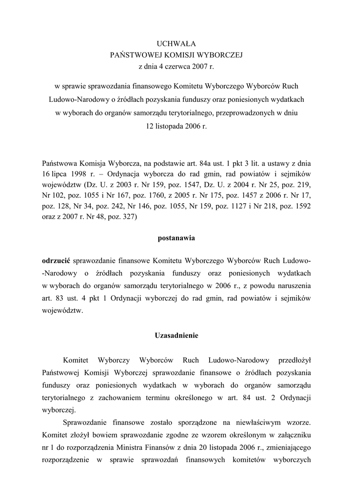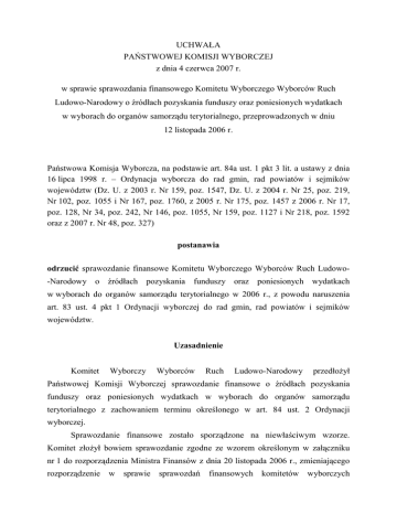 UCHWAŁA PAŃSTWOWEJ KOMISJI WYBORCZEJ z dnia 4 czerwca 2007 r. w sprawie sprawozdania finansowego Komitetu Wyborczego Wyborców Ruch Ludowo-Narodowy o źródłach pozyskania funduszy oraz poniesionych wydatkach w wyborach do organów samorządu terytorialnego, przeprowadzonych w dniu 12 listopada 2006 r. Państwowa Komisja Wyborcza, na podstawie art. 84a ust. 1 pkt 3 lit. a ustawy z dnia 16 lipca 1998 r. – Ordynacja wyborcza do rad gmin, rad powiatów i sejmików województw (Dz. U. z 2003 r. Nr 159, poz. 1547, Dz. U. z 2004 r. Nr 25, poz. 219, Nr 102, poz. 1055 i Nr 167, poz. 1760, z 2005 r. Nr 175, poz. 1457 z 2006 r. Nr 17, poz. 128, Nr 34, poz. 242, Nr 146, poz. 1055, Nr 159, poz. 1127 i Nr 218, poz. 1592 oraz z 2007 r. Nr 48, poz. 327) postanawia odrzucić sprawozdanie finansowe Komitetu Wyborczego Wyborców Ruch Ludowo-Narodowy o źródłach pozyskania funduszy oraz poniesionych wydatkach w wyborach do organów samorządu terytorialnego w 2006 r., z powodu naruszenia art. 83 ust. 4 pkt 1 Ordynacji wyborczej do rad gmin, rad powiatów i sejmików województw. Uzasadnienie Komitet Wyborczy Wyborców Ruch Ludowo-Narodowy przedłoŜył Państwowej Komisji Wyborczej sprawozdanie finansowe o źródłach pozyskania funduszy oraz poniesionych wydatkach w wyborach do organów samorządu terytorialnego z zachowaniem terminu określonego w art. 84 ust. 2 Ordynacji wyborczej. Sprawozdanie finansowe zostało sporządzone na niewłaściwym wzorze. Komitet złoŜył bowiem sprawozdanie zgodne ze wzorem określonym w załączniku nr 1 do rozporządzenia Ministra Finansów z dnia 20 listopada 2006 r., zmieniającego rozporządzenie w sprawie sprawozdań finansowych komitetów wyborczych 2 o źródłach pozyskania funduszy oraz poniesionych wydatkach na cele wyborcze związane z wyborami wójtów, burmistrzów i prezydentów miast (Dz. U. z dnia 23 listopada 2006 r. Nr 212, poz. 1561), wykazując w jego części III, iŜ zarejestrował wyłącznie kandydata na prezydenta Łodzi. Z danych Państwowej Komisji Wyborczej wynika natomiast, Ŝe Komitet Wyborczy Wyborców Ruch Ludowo-Narodowy zarejestrował równieŜ 57 kandydatów do rad gmin, 4 kandydatów do rad powiatów i 43 kandydatów do rad miast na prawach powiatu. Komitet wyborczy, który zarejestrował kandydatów na wójtów, burmistrzów i prezydentów miast oraz kandydatów na radnych, zobowiązany jest do sporządzenia łącznego sprawozdania według wzoru określonego w załączniku nr 2 do wskazanego wyŜej rozporządzenia Ministra Finansów. śaden z uprawnionych podmiotów, określonych w art. 84b Ordynacji wyborczej nie zgłosił zastrzeŜeń do sprawozdania. Państwowa Komisja Wyborcza na podstawie przedłoŜonych dokumentów stwierdziła, co następuje. Komitet Wyborczy Wyborców Ruch Ludowo-Narodowy pozyskał na cele wyborcze kwotę 91.400,42 zł, którą gromadził na rachunku bankowym nr 91 1500 2022 1220 2001 8512 0000 w Kredyt Banku S.A. X Oddział w Warszawie. Składały się na nią wpłaty od osób fizycznych – 91.400,00 zł i 0,42 zł pochodzące z odsetek od środków zgromadzonych na tym rachunku. Wpłaty dokonywane były zgodnie z art. 83d ust. 3 Ordynacji wyborczej, w formie bezgotówkowej. śadna z osób fizycznych dokonujących wpłat na rachunek Komitetu nie przekroczyła dozwolonego łącznego limitu wpłat wynoszącego 15-krotność minimalnego wynagrodzenia za pracę pracowników obowiązującego w dniu poprzedzającym dzień ogłoszenia postanowienia o zarządzeniu wyborów, tj. 13.486,50 zł (art. 83d ust. 2 Ordynacji wyborczej). Wpłaty na łączną kwotę 64.000,00 zł dokonane zostały przed dniem wyborów (12 listopada 2006 r.), natomiast pozostałą kwotę 27.400,00 zł wpłacono po tym dniu, co stanowi naruszenie art. 83 ust. 4 pkt 1 Ordynacji wyborczej, zgodnie z którym zabronione jest pozyskiwanie środków finansowych komitetu po dniu wyborów. Naruszenie wskazanego przepisu, zgodnie z 84a ust. 1 pkt 3 lit a Ordynacji wyborczej skutkuje odrzuceniem sprawozdania finansowego komitetu. Do umowy rachunku bankowego Komitet nie wprowadził zastrzeŜenia o wymaganym ustawą sposobie dokonywania wpłat na rzecz komitetu wyborczego oraz dopuszczalnym źródle pozyskiwania środków finansowych przez komitet 3 wyborczy, a takŜe o dopuszczalnym terminie dokonywania wpłat. Stanowi to naruszenie art. 83d ust. 4 Ordynacji wyborczej. Jak wynika z załączonych do sprawozdania dokumentów bankowych wydatki Komitetu wyniosły 91.326,16 zł, a nie 91.400,42 zł, co wykazał Komitet w punkcie „C” sprawozdania. Wydatki Komitetu bezpośrednio związane z udziałem w wyborach wyniosły bowiem 91.142,16 zł, a 184,00 zł (nie 183,10 zł jak Komitet wskazał w sprawozdaniu) zostało wydatkowane na pokrycie kosztów prowizji bankowych. Pozostałą na rachunku bankowym kwotę 74,26 zł w dniu 7 lutego 2007 r. przekazano na rzecz Towarzystwa Przyjaciół Dzieci, co stanowi naruszenie art. 83f ust. 4 Ordynacji wyborczej, zgodnie z którym wysokość nadwyŜki ustala się po wydaniu przez właściwy organ ostatecznego postanowienia o przyjęciu bądź odrzuceniu sprawozdania finansowego. Koszty kampanii wyborczej nie przekroczyły limitu wydatków obliczonego dla Komitetu Wyborczego Wyborców Ruch Ludowo-Narodowy, na podstawie art. 83e ust. 2 i 3 Ordynacji wyborczej oraz art. 24 ust. 1 i 5 ustawy z dnia 20 czerwca 2002 r. o bezpośrednim wyborze wójta, burmistrza i prezydenta miasta (Dz. U. Nr 113, poz. 984, Nr 127, poz. 1089 i Nr 214, poz. 1806, z 2004 r. Nr 102, poz. 1055, z 2005 r. Nr 175, poz. 14567, z 2006 r. Nr 218, poz. 1592 oraz z 2007 r. Nr 48, poz. 327), na kwotę 488.565,00 zł. W wyniku analizy sprawozdania Komitetu Wyborczego Wyborców Ruch Ludowo-Narodowy oraz załączonych do niego dokumentów Państwowa Komisja Wyborcza stwierdziła, iŜ Komitet prowadząc gospodarkę finansową naruszył art. 83 ust. 4 pkt 1 Ordynacji wyborczej do rad gmin, rad powiatów i sejmików województw, czego skutkiem jest odrzu