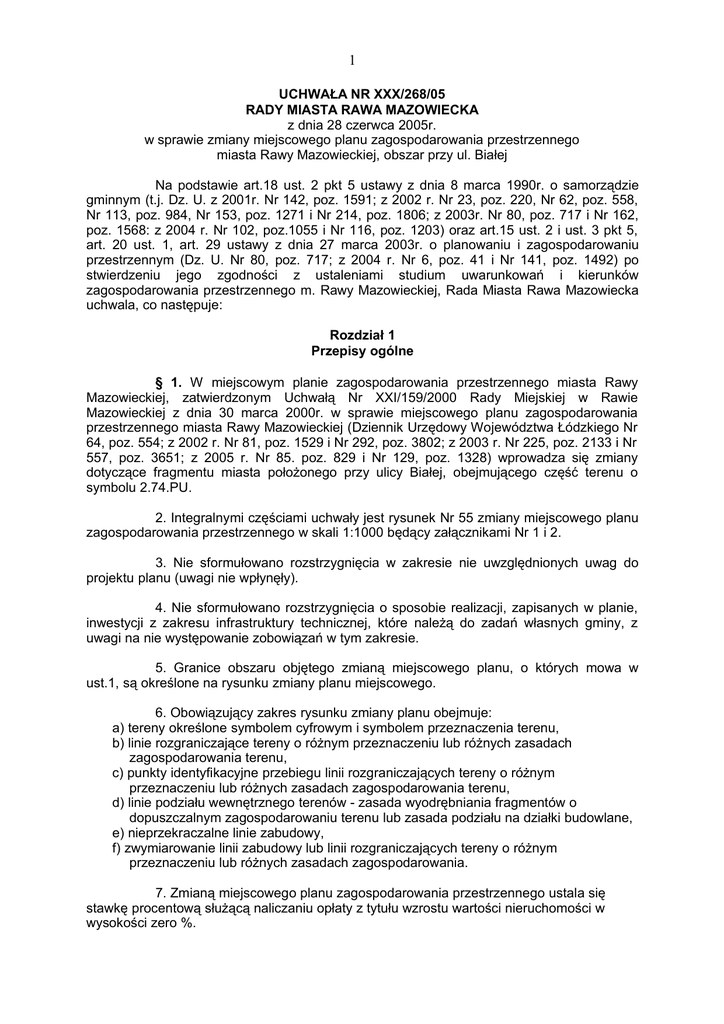 1 UCHWAŁA NR XXX/268/05 RADY MIASTA RAWA MAZOWIECKA z dnia 28 czerwca 2005r. w sprawie zmiany miejscowego planu zagospodarowania przestrzennego miasta Rawy Mazowieckiej, obszar przy ul. Białej Na podstawie art.18 ust. 2 pkt 5 ustawy z dnia 8 marca 1990r. o samorządzie gminnym (t.j. Dz. U. z 2001r. Nr 142, poz. 1591; z 2002 r. Nr 23, poz. 220, Nr 62, poz. 558, Nr 113, poz. 984, Nr 153, poz. 1271 i Nr 214, poz. 1806; z 2003r. Nr 80, poz. 717 i Nr 162, poz. 1568: z 2004 r. Nr 102, poz.1055 i Nr 116, poz. 1203) oraz art.15 ust. 2 i ust. 3 pkt 5, art. 20 ust. 1, art. 29 ustawy z dnia 27 marca 2003r. o planowaniu i zagospodarowaniu przestrzennym (Dz. U. Nr 80, poz. 717; z 2004 r. Nr 6, poz. 41 i Nr 141, poz. 1492) po stwierdzeniu jego zgodności z ustaleniami studium uwarunkowań i kierunków zagospodarowania przestrzennego m. Rawy Mazowieckiej, Rada Miasta Rawa Mazowiecka uchwala, co następuje: Rozdział 1 Przepisy ogólne § 1. W miejscowym planie zagospodarowania przestrzennego miasta Rawy Mazowieckiej, zatwierdzonym Uchwałą Nr XXI/159/2000 Rady Miejskiej w Rawie Mazowieckiej z dnia 30 marca 2000r. w sprawie miejscowego planu zagospodarowania przestrzennego miasta Rawy Mazowieckiej (Dziennik Urzędowy Województwa Łódzkiego Nr 64, poz. 554; z 2002 r. Nr 81, poz. 1529 i Nr 292, poz. 3802; z 2003 r. Nr 225, poz. 2133 i Nr 557, poz. 3651; z 2005 r. Nr 85. poz. 829 i Nr 129, poz. 1328) wprowadza się zmiany dotyczące fragmentu miasta położonego przy ulicy Białej, obejmującego część terenu o symbolu 2.74.PU. 2. Integralnymi częściami uchwały jest rysunek Nr 55 zmiany miejscowego planu zagospodarowania przestrzennego w skali 1:1000 będący załącznikami Nr 1 i 2. 3. Nie sformułowano rozstrzygnięcia w zakresie nie uwzględnionych uwag do projektu planu (uwagi nie wpłynęły). 4. Nie sformułowano rozstrzygnięcia o sposobie realizacji, zapisanych w planie, inwestycji z zakresu infrastruktury technicznej, które należą do zadań własnych gminy, z uwagi na nie występowanie zobowiązań w tym zakresie. 5. Granice obszaru objętego zmianą miejscowego planu, o których mowa w ust.1, są określone na rysunku zmiany planu miejscowego. 6. Obowiązujący zakres rysunku zmiany planu obejmuje: a) tereny określone symbolem cyfrowym i symbolem przeznaczenia terenu, b) linie rozgraniczające tereny o różnym przeznaczeniu lub różnych zasadach zagospodarowania terenu, c) punkty identyfikacyjne przebiegu linii rozgraniczających tereny o różnym przeznaczeniu lub różnych zasadach zagospodarowania terenu, d) linie podziału wewnętrznego terenów - zasada wyodrębniania fragmentów o dopuszczalnym zagospodarowaniu terenu lub zasada podziału na działki budowlane, e) nieprzekraczalne linie zabudowy, f) zwymiarowanie linii zabudowy lub linii rozgraniczających tereny o różnym przeznaczeniu lub różnych zasadach zagospodarowania. 7. Zmianą miejscowego planu zagospodarowania przestrzennego ustala się stawkę procentową służącą naliczaniu opłaty z tytułu wzrostu wartości nieruchomości w wysokości zero %. 2 § 2. 1. Pojęcia i określenia użyte w planie, a nie zdefiniowane w niniejszym paragrafie, należy rozumieć zgodnie z ogólnie obowiązującymi przepisami prawa. 2. Ilekroć w zmianie planu miejscowego jest mowa o: 1) "obszarze zmiany planu" - należy przez to rozumieć nieruchomości lub ich części położone w granicach niniejszej zmiany planu; 2) "obszarze urbanistycznym" - należy przez to rozumieć fragment obszaru miasta, którego granice pokrywają się z granicami obrębu geodezyjnego; 3) "terenach" - należy przez to rozumieć wydzielone liniami rozgraniczającymi w obszarze zmiany planu, nieruchomości lub ich części, dla których zostały określone niniejszą zmianą planu różne przeznaczenie lub różne zasady zagospodarowania i które zostały oznaczone w tekście zmiany planu oraz na rysunku zmiany planu symbolami cyfrowymi; 4) "przeznaczeniu terenu" - należy przez to rozumieć określone dla poszczególnych terenów zespoły uprawnień i zobowiązań do podejmowania działań w przestrzeni, służących realizacji określonych celów, wyodrębnione wg zasad i sposobów korzystania z nieruchomości, oznaczone w tekście zmiany planu i na rysunku zmiany planu symbolem literowym z tym, że przeznaczenie określone dwoma lub więcej symbolami wymienionymi w ust. 3 niniejszego paragrafu należy rozumieć jako przeznaczenie obejmujące łącznie zespoły uprawnień i zobowiązań do podejmowania działań w przestrzeni, służących realizacji określonych celów, sformułowane w wybranych definicjach; 5) "działce budowlanej" - należy przez to rozumieć pojęcie prawne zawarte w art. 2 ww ustawy o planowaniu i zagospodarowaniu przestrzennym; 6) "granicach obszaru objętego rysunkiem zmiany planu" - należy przez to rozumieć te zewnętrzne linie rozgraniczające tereny o różnym przeznaczeniu lub różnych zasadach zagospodarowania, przy których wykreślono symbol granicy (określony w legendzie rysunku zmiany planu) obszaru objętego rysunkiem zmiany planu; 7) "nieprzekraczalnej linii zabudowy" - należy przez to rozumieć linię, w której może być umieszczona ściana budynku bez jej przekraczania w kierunku linii rozgraniczającej ulicy lub innych wskazanych rysunkiem zmiany planu elementów zagospodarowania terenu; zakaz ten nie dotyczy elementów architektonicznych takich jak: balkon, wykusz, gzyms, okap dachu, zadaszenie wejścia, rynna, rura spustowa, podokienniki oraz innych detali wystroju architektonicznego chyba, że jest to linia zabudowy ustalona od napowietrznej linii elektroenergetycznej; 8) "linii podziału wewnętrznego terenów o różnym przeznaczeniu lub zasadach zagospodarowania" - należy przez to rozumieć linię określoną rysunkiem zmiany planu, określającą zasadę wyodrębniania fragmentów o dopuszczalnym zagospodarowaniu terenu lub zasadę podziału na działki budowlane; 9) "udziale powierzchni terenu biolo