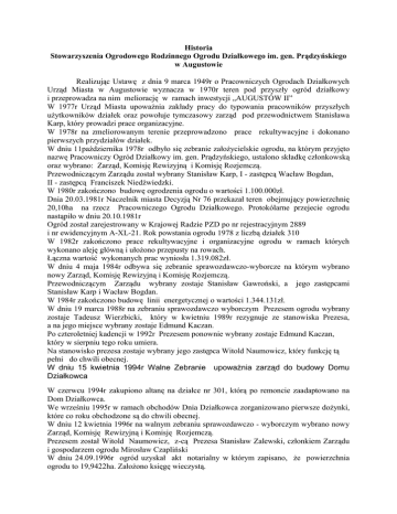 Historia Stowarzyszenia Ogrodowego Rodzinnego Ogrodu Działkowego im. gen. Prądzyńskiego w Augustowie Realizując Ustawę z dnia 9 marca 1949r o Pracowniczych Ogrodach Działkowych Urząd Miasta w Augustowie wyznacza w 1970r teren pod przyszły ogród działkowy i przeprowadza na nim meliorację w ramach inwestycji „AUGUSTÓW II” W 1977r Urząd Miasta upoważnia zakłady pracy do typowania pracowników przyszłych użytkowników działek oraz powołuje tymczasowy zarząd pod przewodnictwem Stanisława Karp, który prowadzi prace organizacyjne. W 1978r na zmeliorowanym terenie przeprowadzono prace rekultywacyjne i dokonano pierwszych przydziałów działek. W dniu 11października 1978r odbyło się zebranie założycielskie ogrodu, na którym przyjęto nazwę Pracowniczy Ogród Działkowy im. gen. Prądzyńskiego, ustalono składkę członkowską oraz wybrano: Zarząd, Komisję Rewizyjną i Komisję Rozjemczą. Przewodniczącym Zarządu został wybrany Stanisław Karp, I - zastępcą Wacław Bogdan, II - zastępcą Franciszek Niedźwiedzki. W 1980r zakończono budowę ogrodzenia ogrodu o wartości 1.100.000zł. Dnia 20.03.1981r Naczelnik miasta Decyzją Nr 76 przekazał teren obejmujący powierzchnię 20,10ha na rzecz Pracowniczego Ogrodu Działkowego. Protokólarne przejecie ogrodu nastąpiło w dniu 20.10.1981r Ogród został zarejestrowany w Krajowej Radzie PZD po nr rejestracyjnym 2889 i nr ewidencyjnym A-XL-21. Rok powstania ogrodu 1978 z liczbą działek 310 W 1982r zakończono prace rekultywacyjne i organizacyjne ogrodu w ramach których wykonano aleję główną i ułożono przepusty na rowach. Łączna wartość wykonanych prac wyniosła 1.319.082zł. W dniu 4 maja 1984r odbywa się zebranie sprawozdawczo-wyborcze na którym wybrano nowy Zarząd, Komisję Rewizyjną i Komisję Rozjemczą. Przewodniczącym Zarządu wybrany zostaje Stanisław Gawroński, a jego zastępcami Stanisław Karp i Wacław Bogdan. W 1984r zakończono budowę linii energetycznej o wartości 1.344.131zł. W dniu 19 marca 1988r na zebraniu sprawozdawczo wyborczym Prezesem ogrodu wybrany zostaje Tadeusz Wierzbicki, który w kwietniu 1989r rezygnuje ze stanowiska Prezesa, a na jego miejsce wybrany zostaje Edmund Kaczan. Po czteroletniej kadencji w 1992r Prezesem ponownie wybrany zostaje Edmund Kaczan, który w sierpniu tego roku umiera. Na stanowisko prezesa zostaje wybrany jego zastępca Witold Naumowicz, który funkcję tą pełni do chwili obecnej. W dniu 15 kwietnia 1994r Walne Zebranie upoważnia zarząd do budowy Domu Działkowca W czerwcu 1994r zakupiono altanę na działce nr 301, którą po remoncie zaadaptowano na Dom Działkowca. We wrześniu 1995r w ramach obchodów Dnia Działkowca zorganizowano pierwsze dożynki, które co roku obchodzone są do chwili obecnej. W dniu 12 kwietnia 1996r na walnym zebraniu sprawozdawczo - wyborczym wybrano nowy Zarząd, Komisję Rewizyjną i Komisję Rozjemczą. Prezesem został Witold Naumowicz, z-cą Prezesa Stanisław Zalewski, członkiem Zarządu i gospodarzem ogrodu Mirosław Czapliński W dniu 24.09.1996r ogród uzyskał akt notarialny w którym zapisano, że powierzchnia ogrodu to 19,9422ha. Założono księgę wieczystą. -2 Od tego momentu rozpoczyna się dynamiczny rozwój ogrodu. W 2002r rozpoczęto budowę Domu działkowca. Od 1996r uporządkowano ewidencję działkową, dokonano dokładnych pomiarów działek, naprawiono ogrodzenie ogrodu, wykonano dwie bramy główne, naprawiono alejki boczne oraz drogę wzdłuż kanału. Wybudowano nowy dom Działkowca o powierzchni zabudowy 134m 2 powierzchni użytkowej 173m2 i kubaturze 755m3 Aktualnie w ogrodzie działki uprawia 525 działkowiczów. Osiągnięcia: Najlepszy POD roku 1998 w woj. Suwalskim, w konkursie krajowym „Najlepszy POD 99r w upowszechnianiu wiedzy”, I miejsce w konkursie wojewódzkim, „Najpiękniejszy ogród 2001r”, Laureat konkursu krajowego „POD roku 2002”, „Najpiękniejszy ogród 2014r” w woj. Podlaskim. W dniu 4 października 2014r walne zebranie wszystkich działkowców podjęło uchwałę o wyodrębnieniu się ze struktur PZD i założyło własne stowarzyszenie ogrodowe. W dniu 24 marca 2015r Sąd Rejonowy w Białymstoku XII Wydział Gospodarczy Krajowego Rejestru Sądowego zarejestrował stowarzyszenie pod nr 0000549722 Aktualna nazwa Stowarzyszenie Ogrodowe Rodzinny Ogród Działkowy im. gen. Prądzyńskiego w Augustowie ul. Białostocka 9